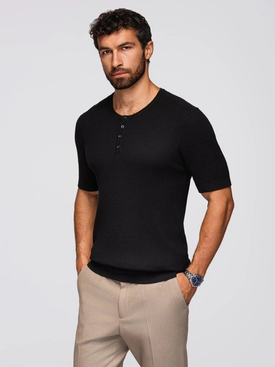 T-shirt męski dzianinowy z guzikami przy dekolcie – czarny V2 OM-TSCT-0254