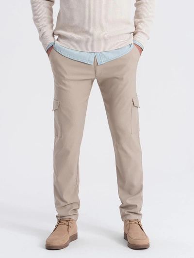 Spodnie męskie materiałowe REGULAR z kieszeniami cargo - beżowe V3 OM-PACG-0178