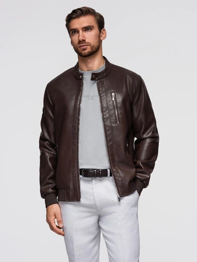 Kurtka męska z imitacji skóry ze stójką - ciemnobrązowa V1 OM-JAFL-0109