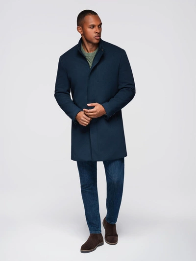 Dopasowany strukturalny płaszcz męski z wysokim kołnierzem – granatowy V2 OM-COWC-0136