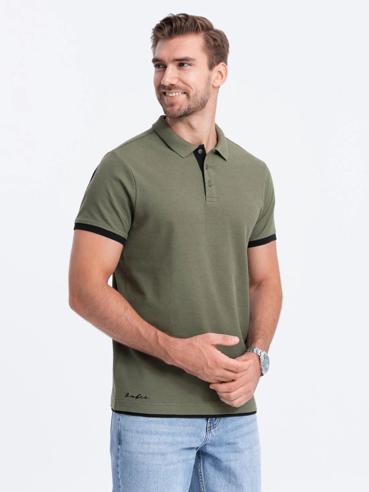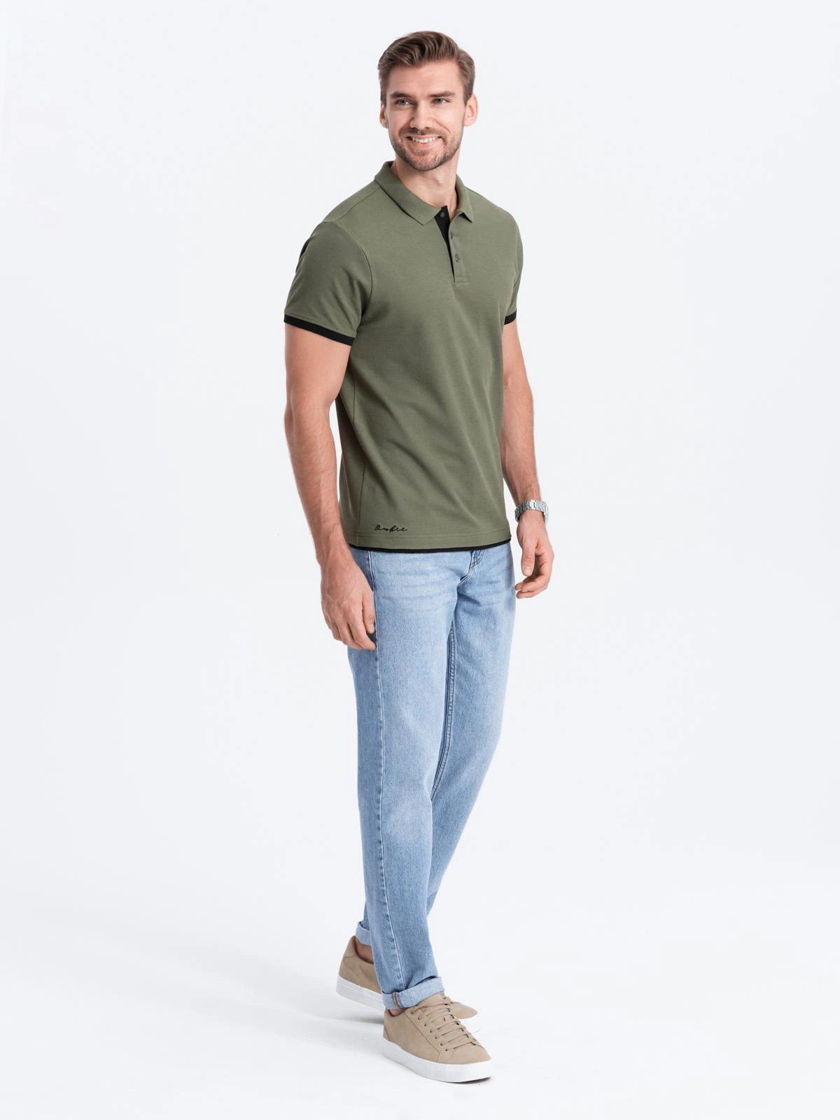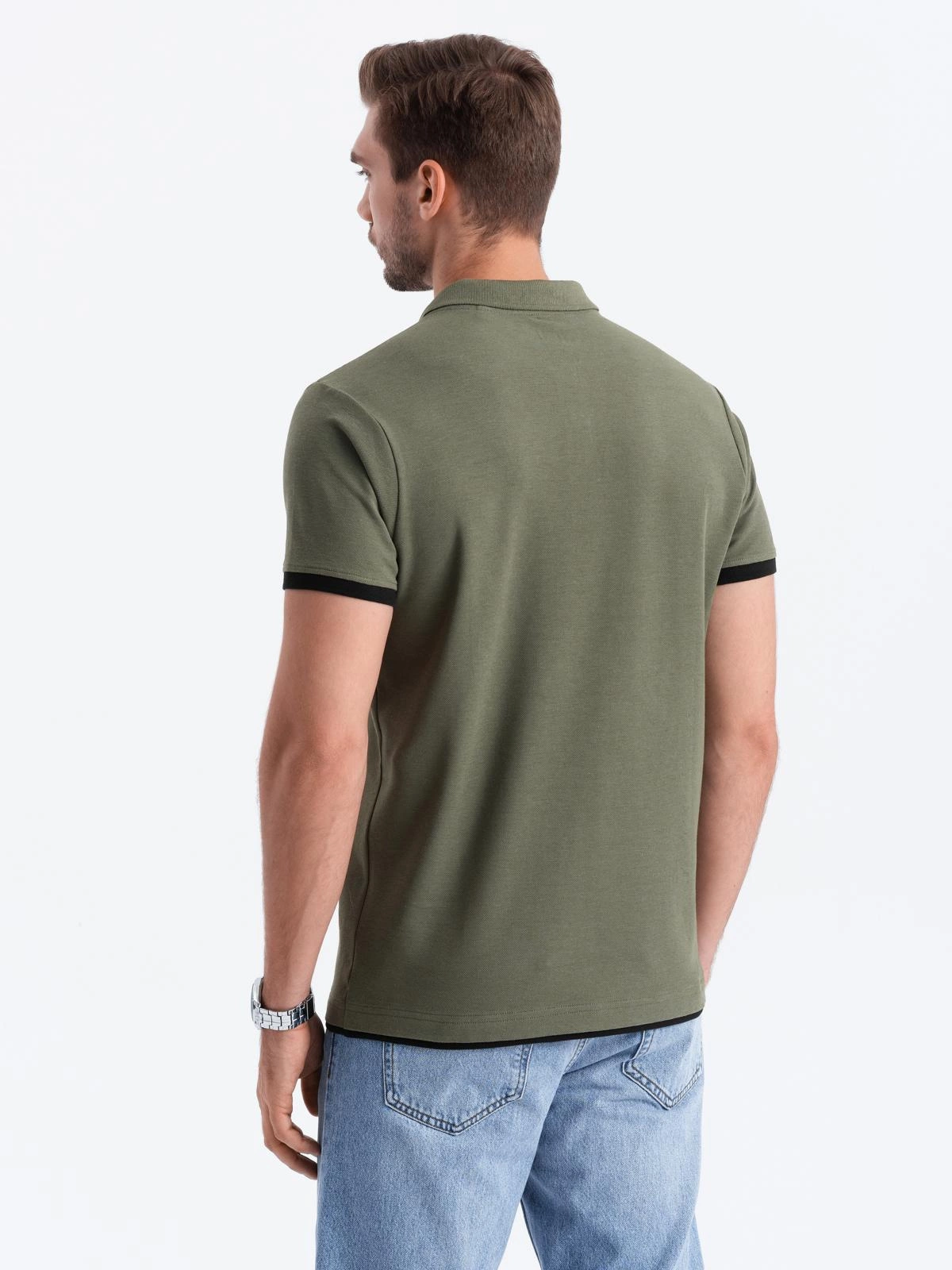 - Męska bawełniana koszulka polo z kontrastowymi wykończeniami – oliwkowa V6 OM-POSS-0113