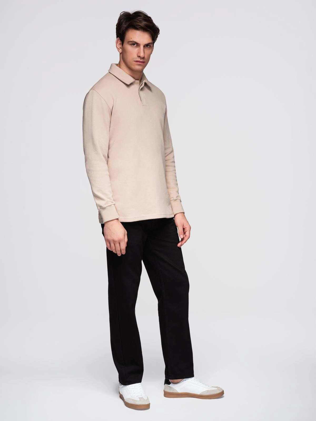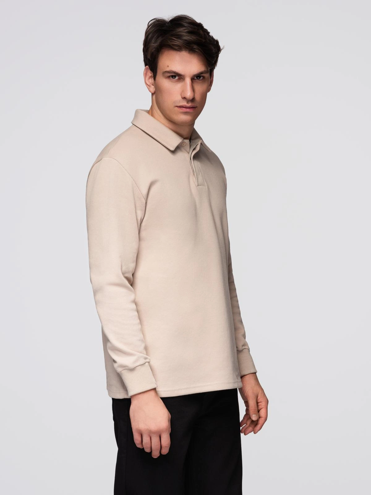 Opinie o Bluza męska z kołnierzykiem polo ze strukturalnej dzianiny - beżowa V2 OM-SSNZ-0149