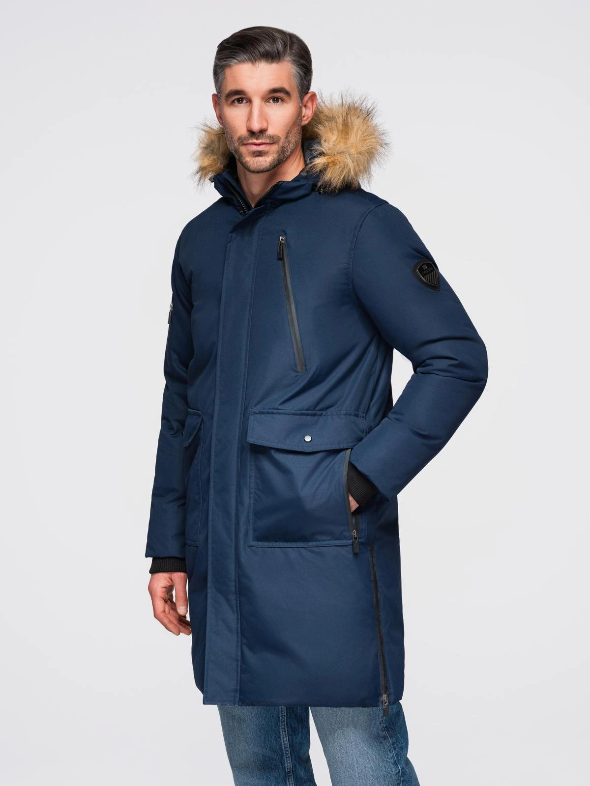 - Ocieplana kurtka męska alaska z kieszeniami i rozpinanym dołem – granatowa V1 OM-JALJ-0148