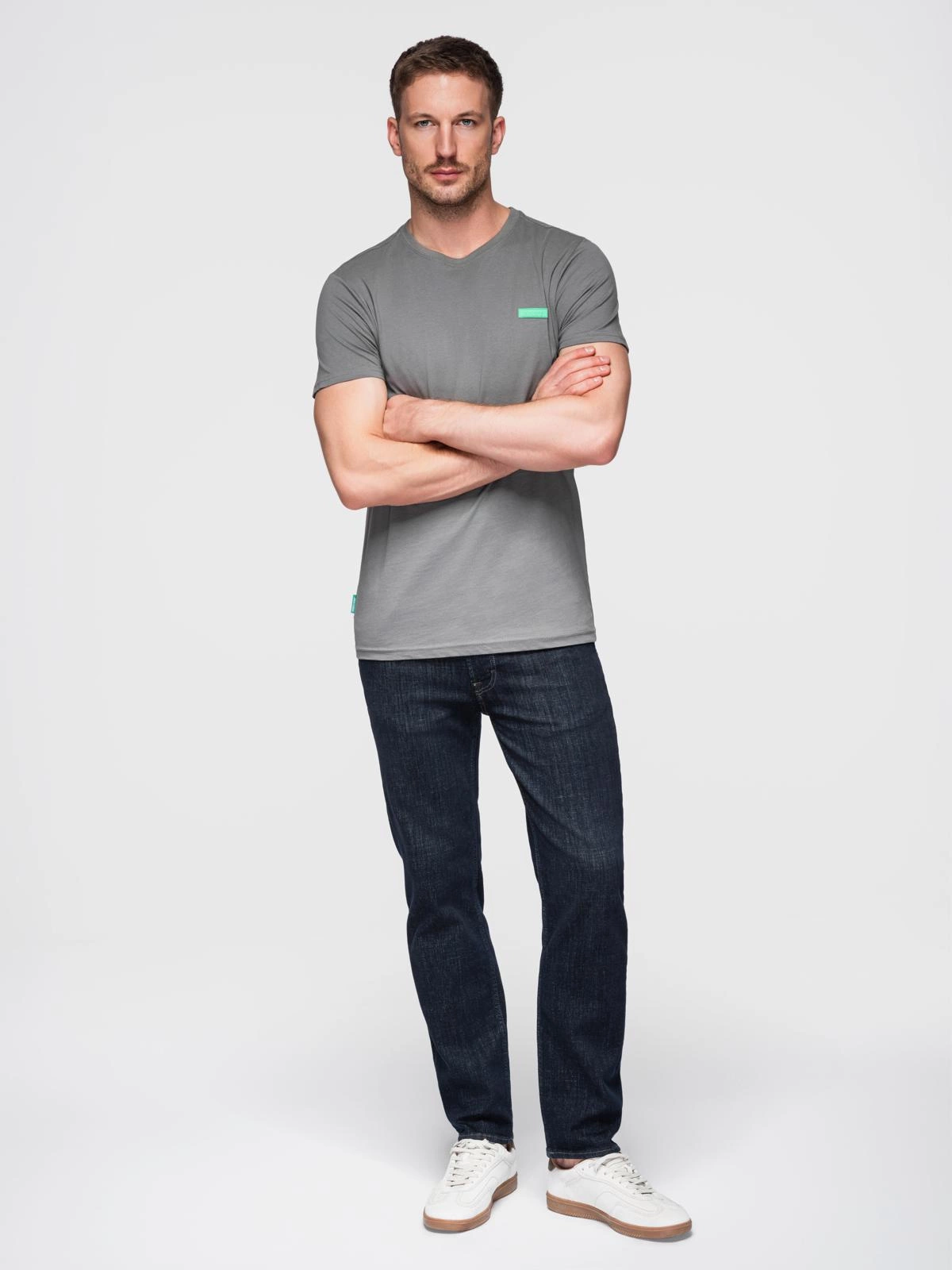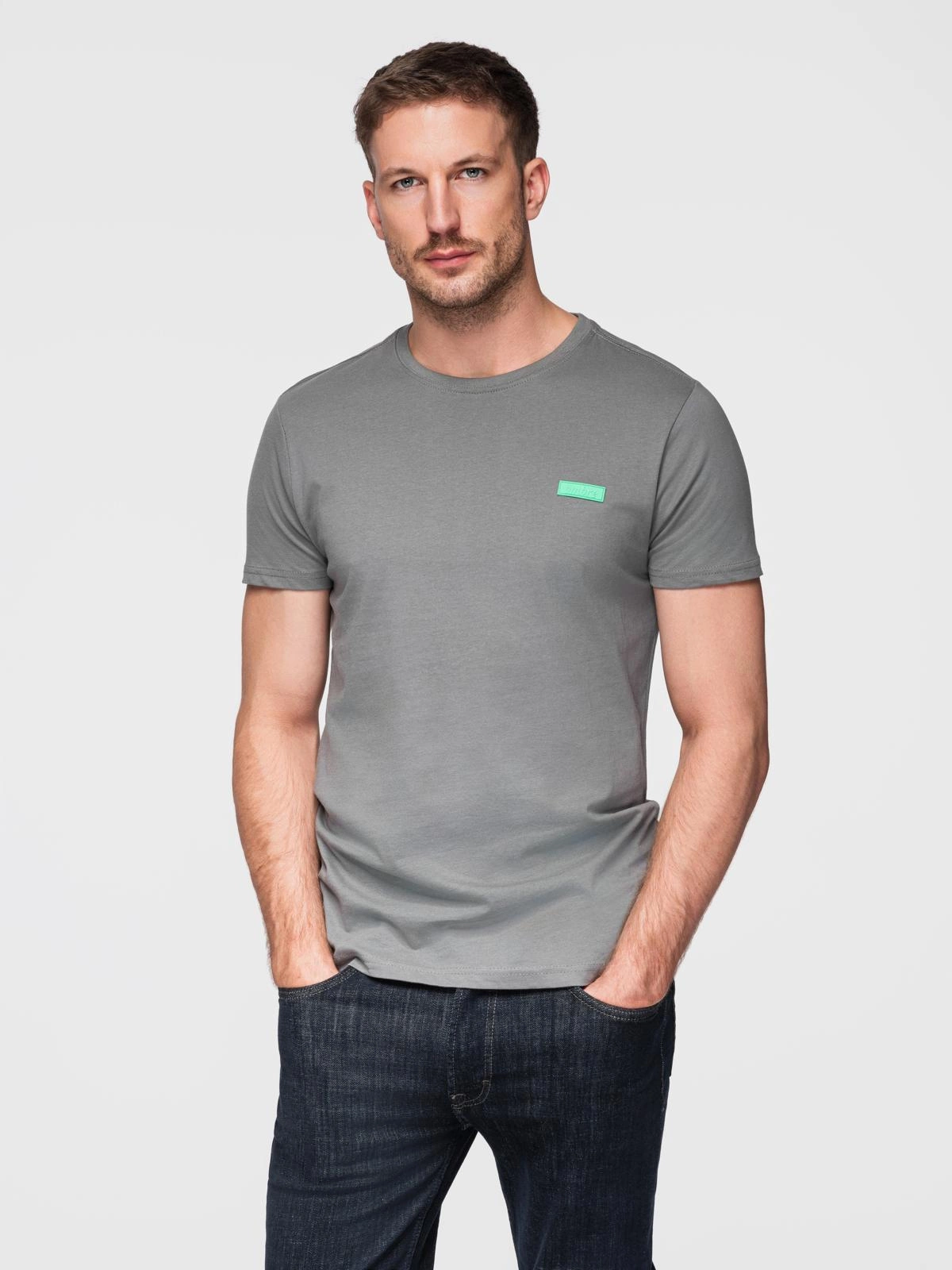 Opinie o Bawełniany męski t-shirt z zieloną naszywką na piersi – szary V1 OM-TSCT-0151