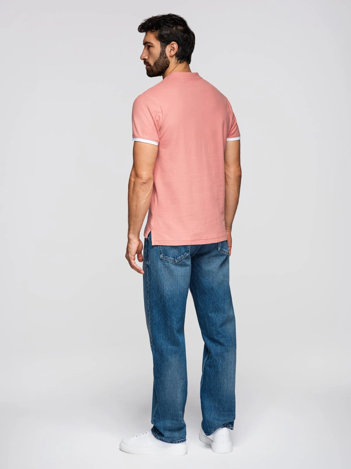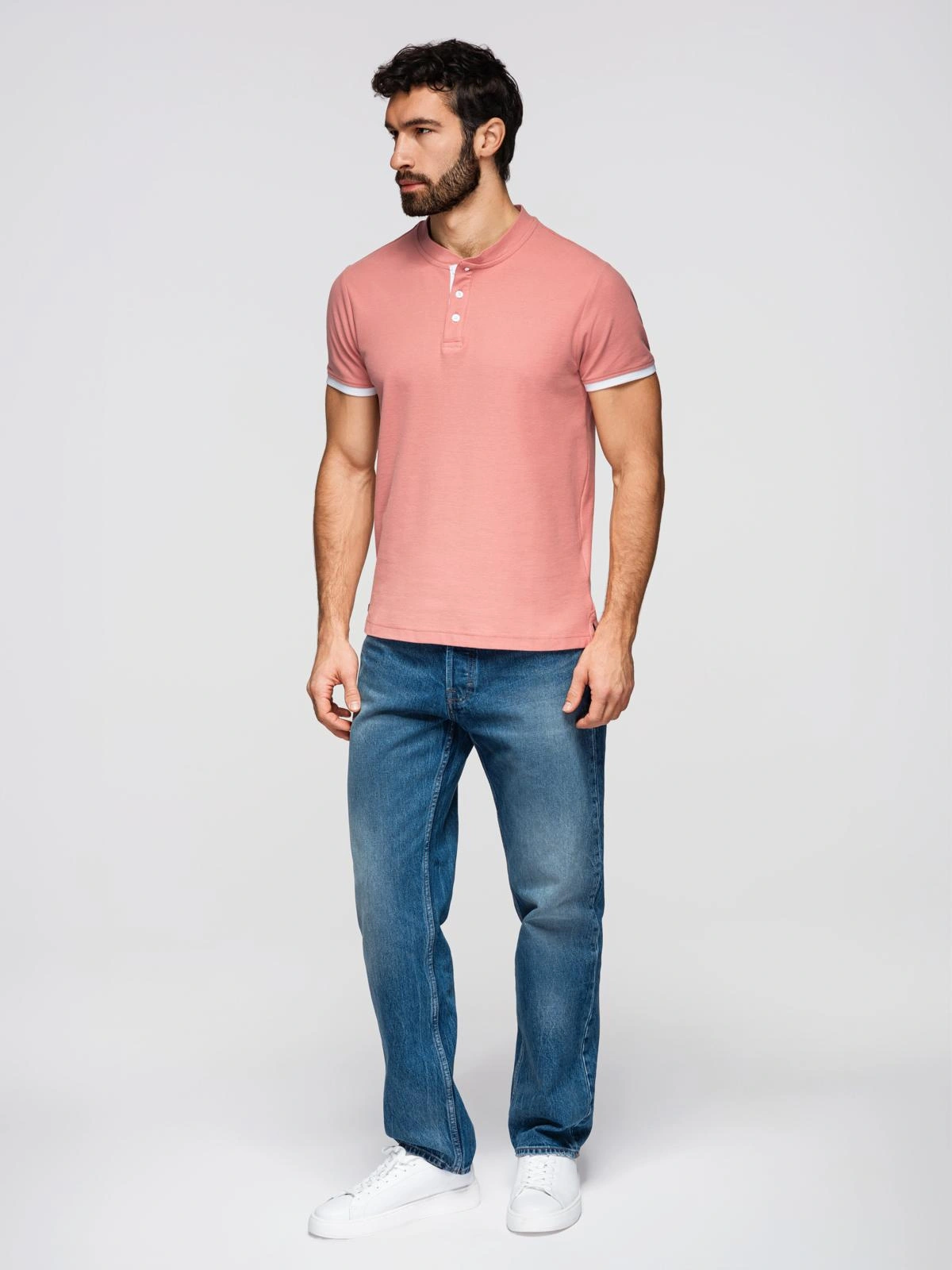 Opinie o Męska koszulka polo bez kołnierzyka - różowa V7 OM-TSCT-0156