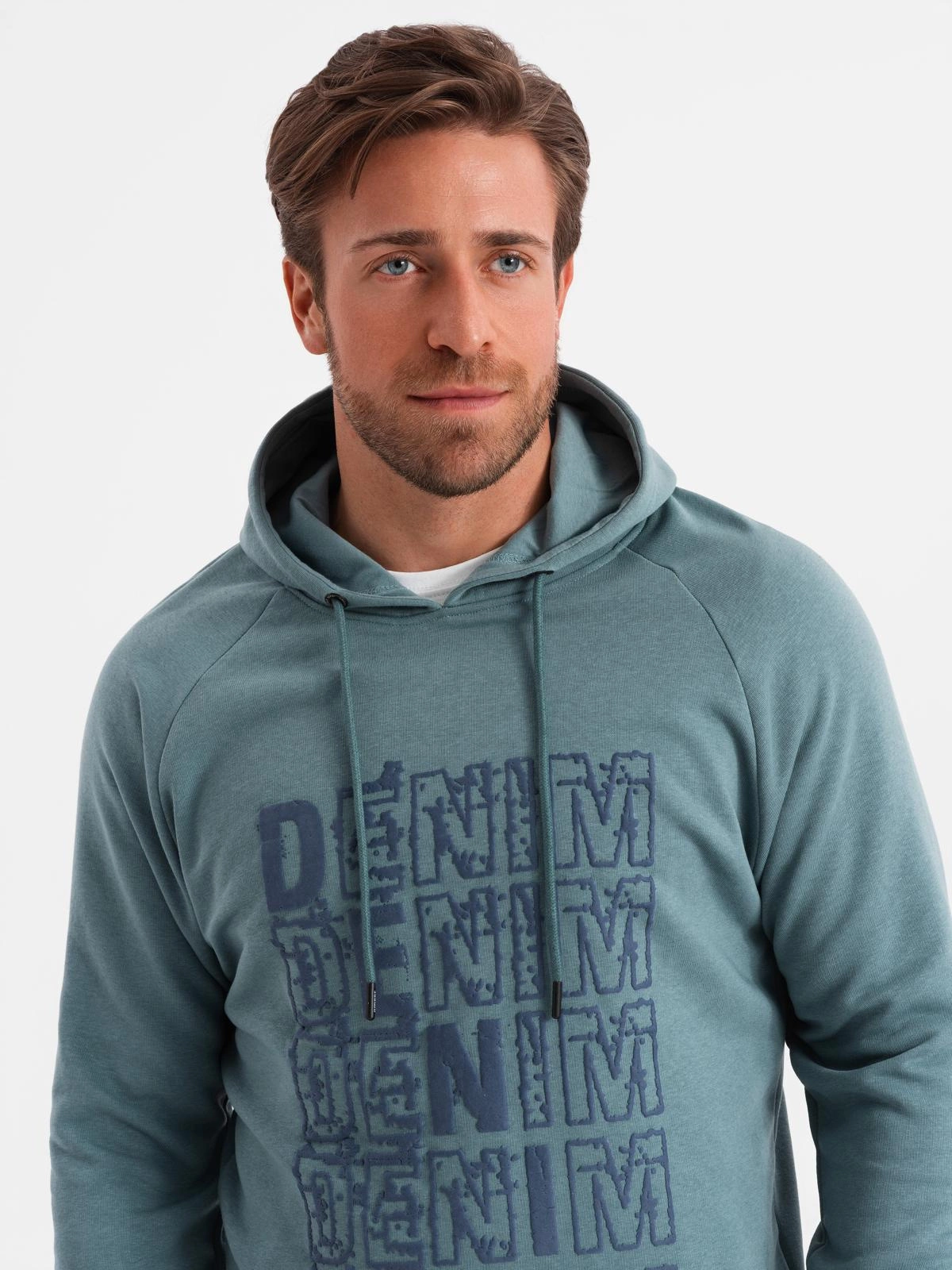 Bluza męska kangurka nierozpinana z kapturem i nadrukiem - turkusowa V2 OM-SSPS-0158