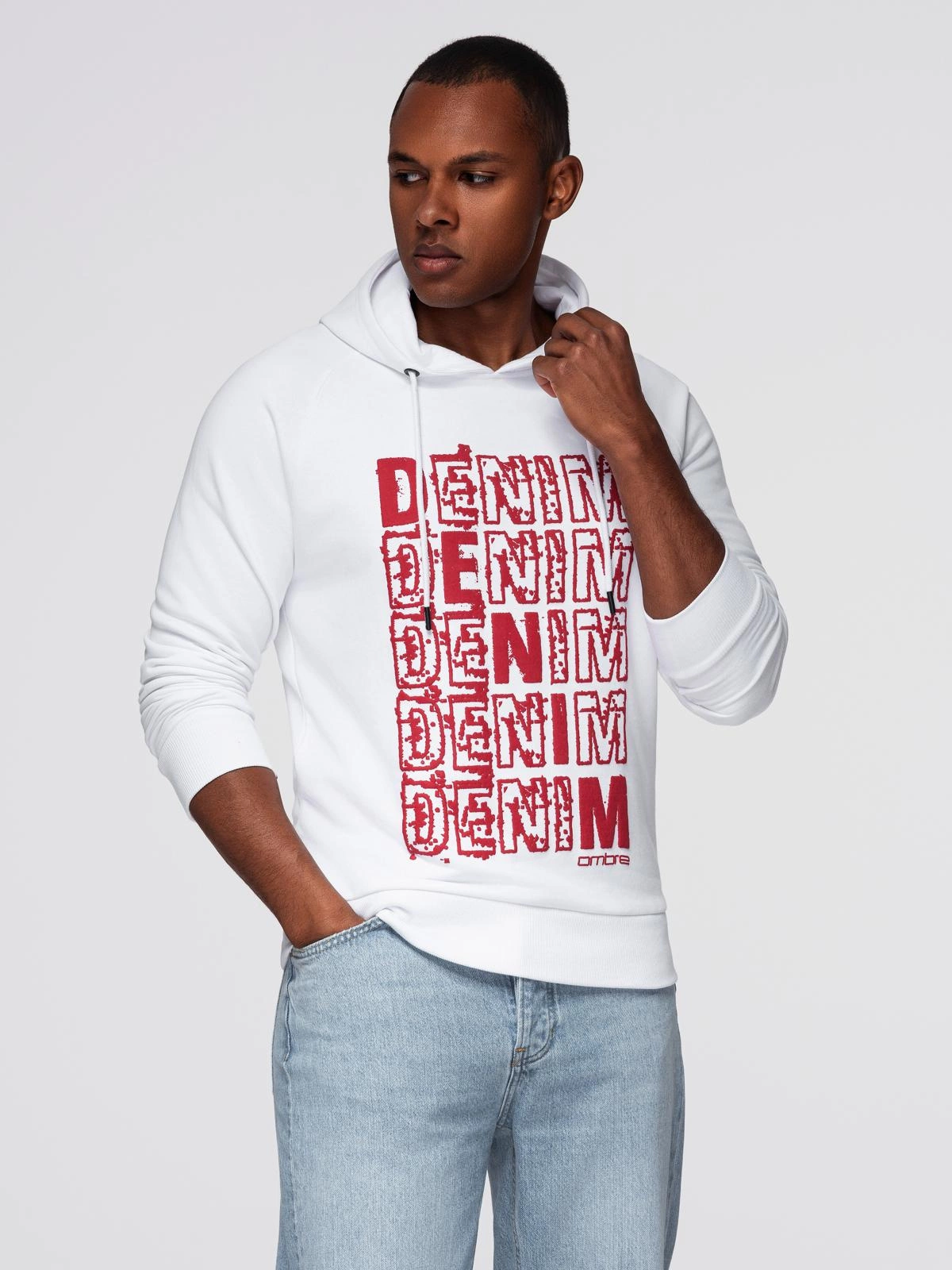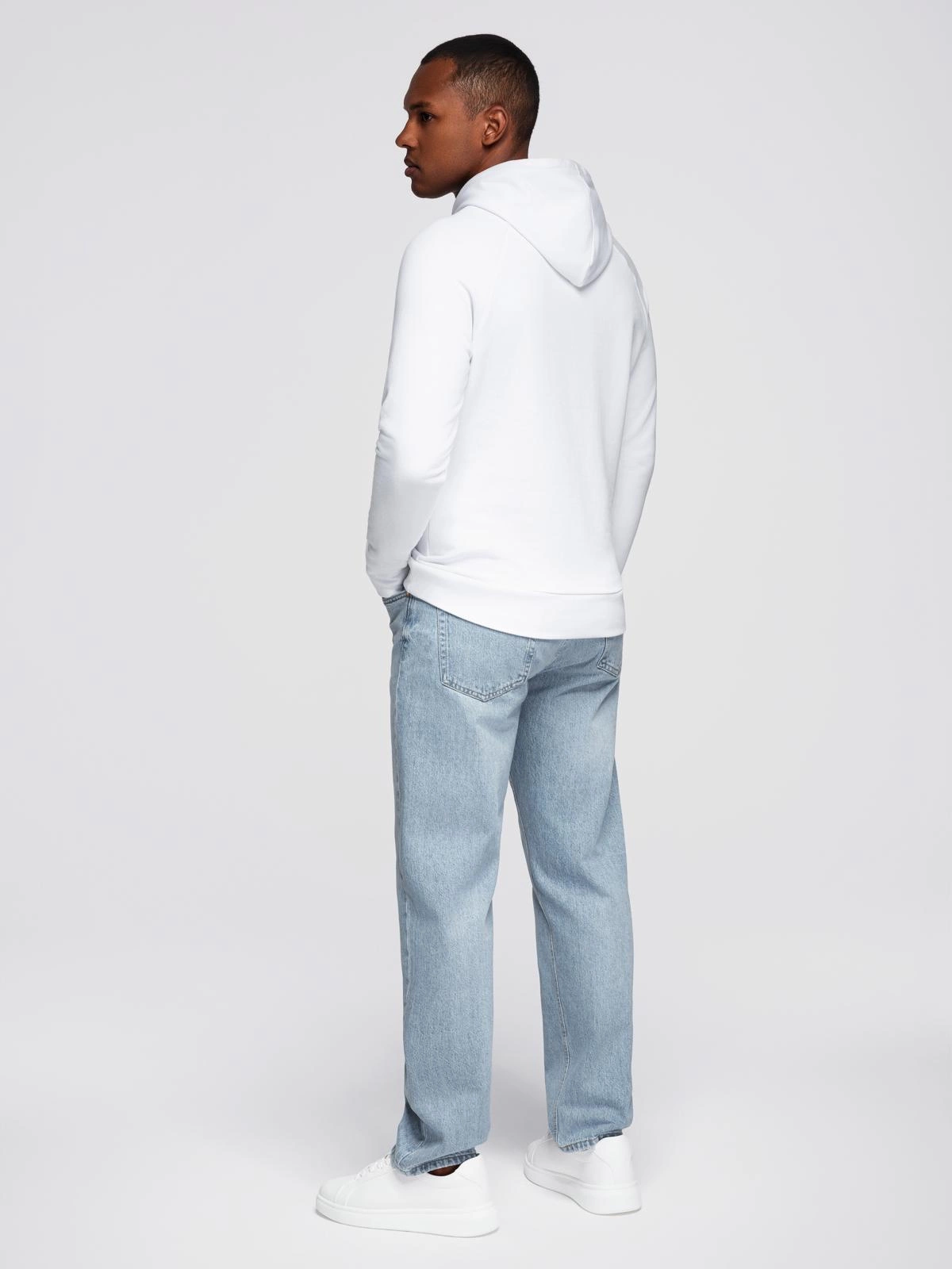 Nierozpinana męska bluza kangurka z kapturem i nadrukiem - biała V3 OM-SSPS-0158