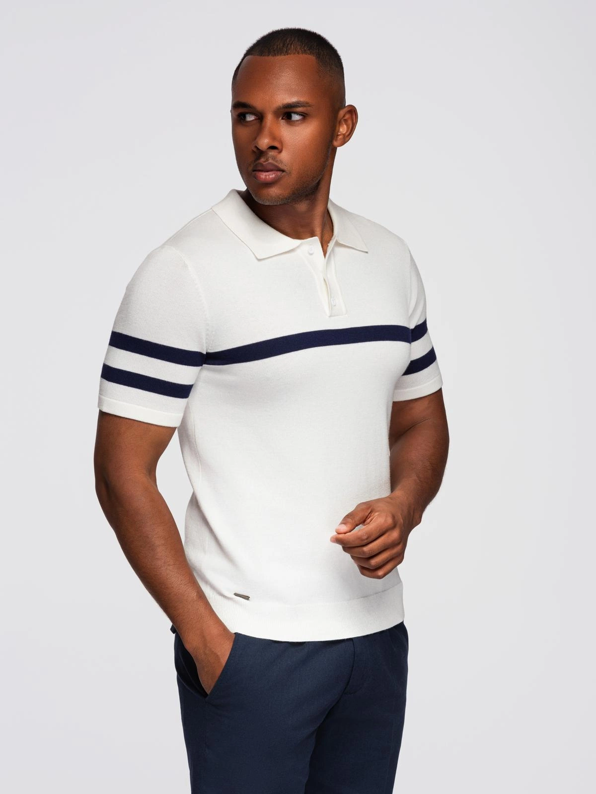 Opinie o Koszulka męska polo z miękkiej dzianiny z kontrastowymi pasami - biała V1 OM-POSS-0118