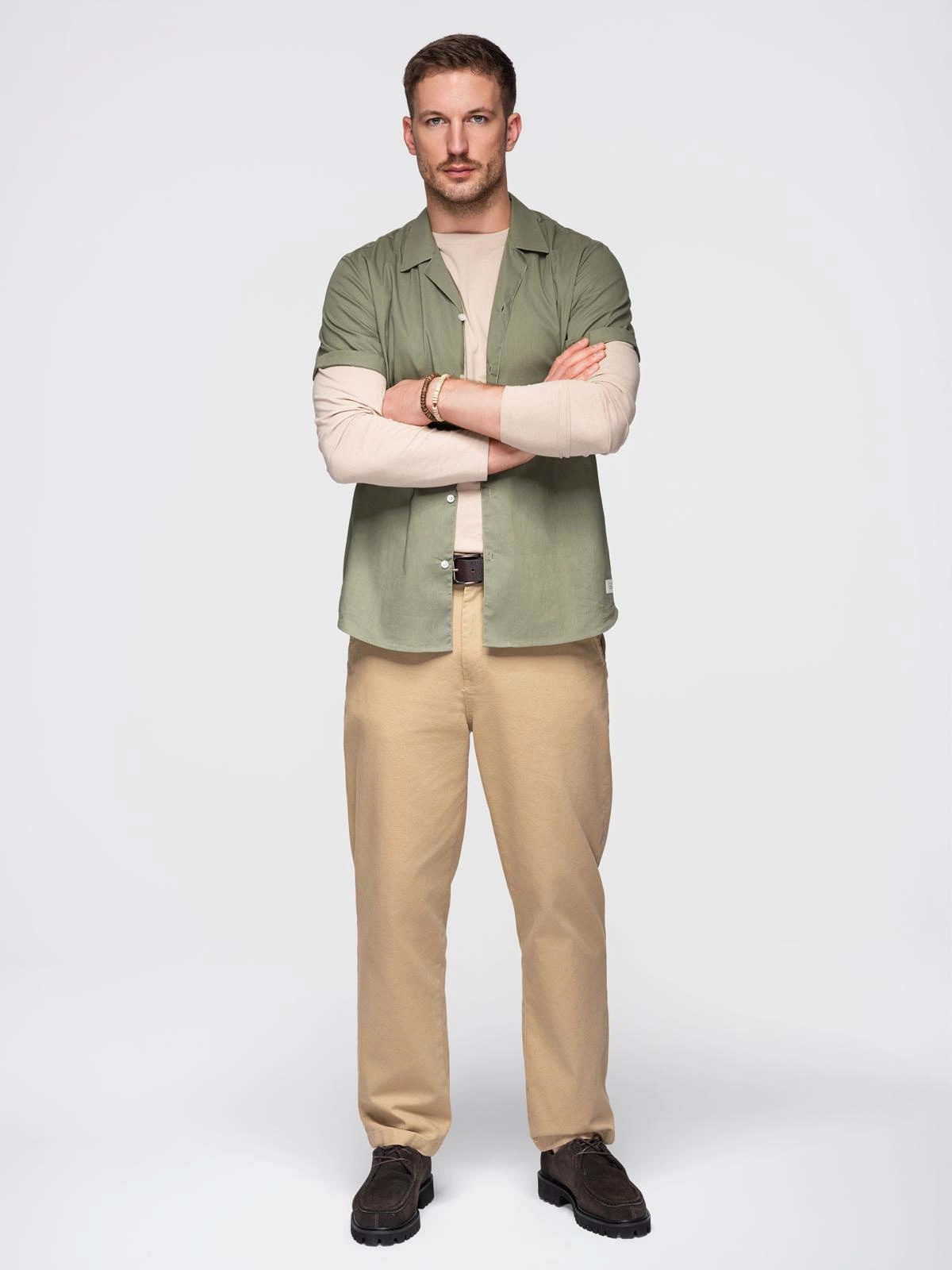 Opinie o Koszula męska z krótkim rękawem i kubańskim kołnierzem - khaki V4 OM-SHSS-0168