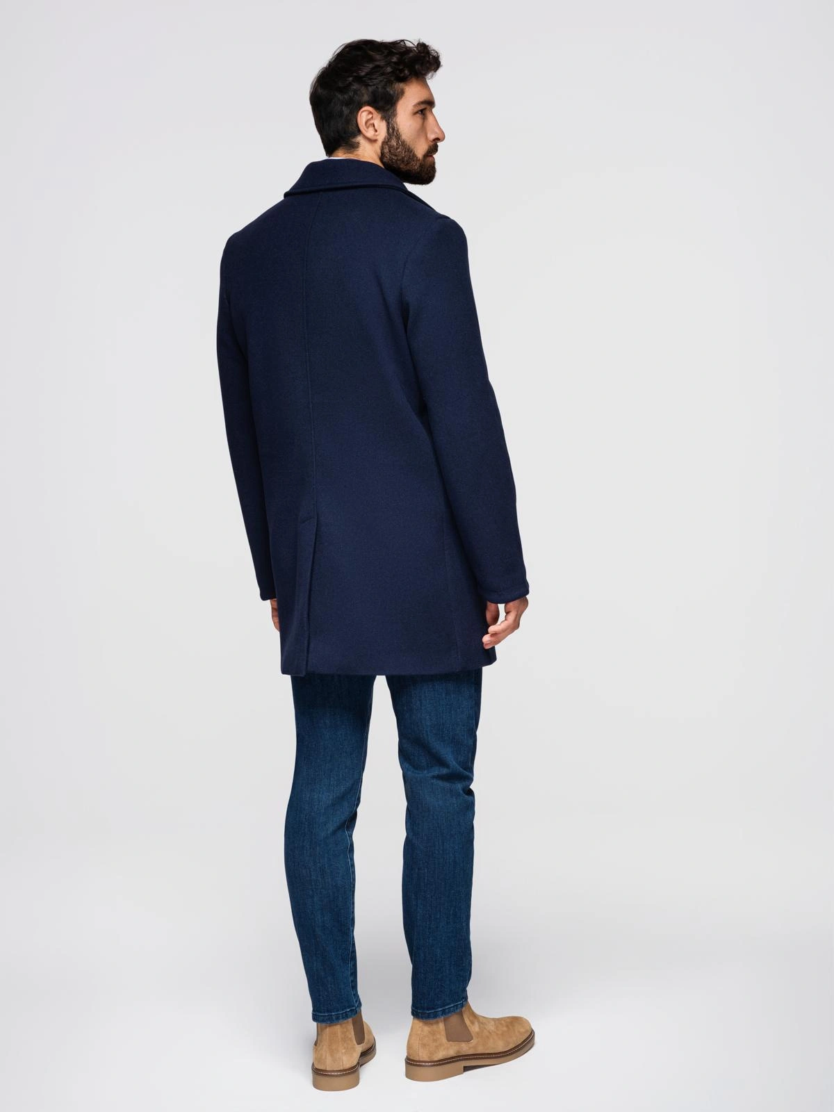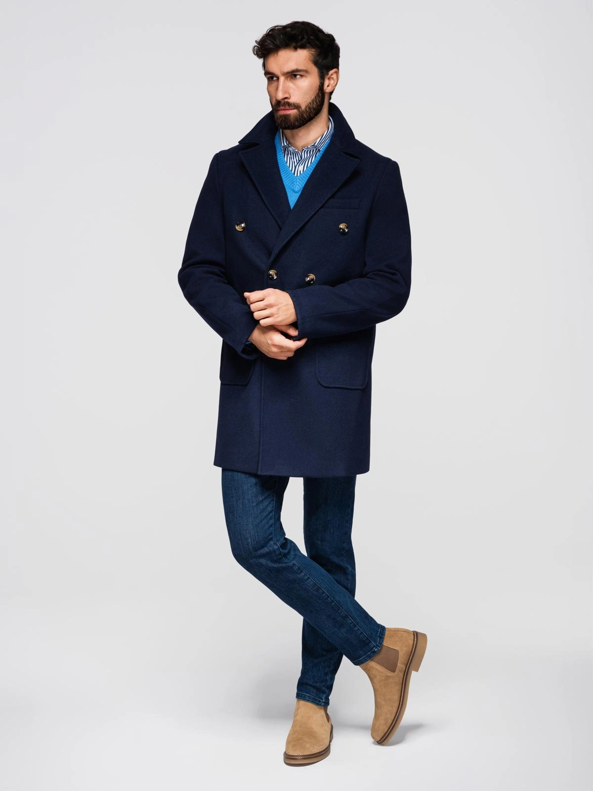 Opinie o Dwurzędowy męski płaszcz z ozdobnymi guzikami – indygo V1 OM-COWC-0109