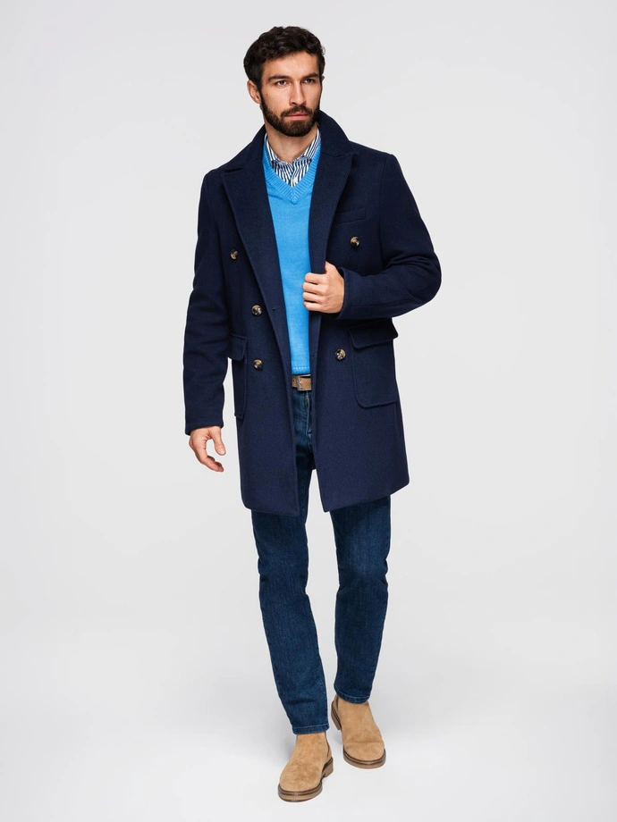 Dwurzędowy męski płaszcz z ozdobnymi guzikami – indygo V1 OM-COWC-0109