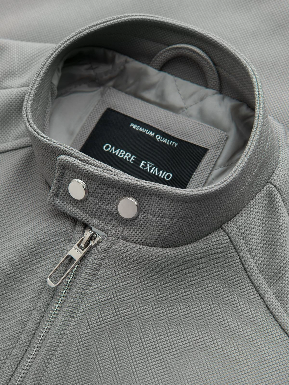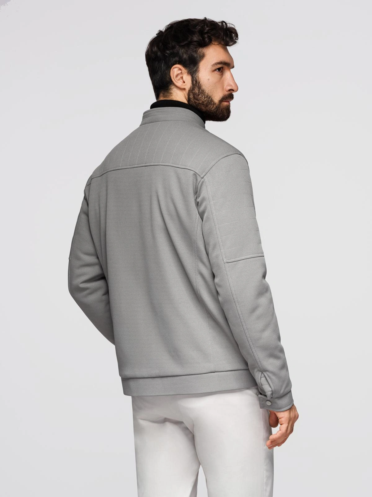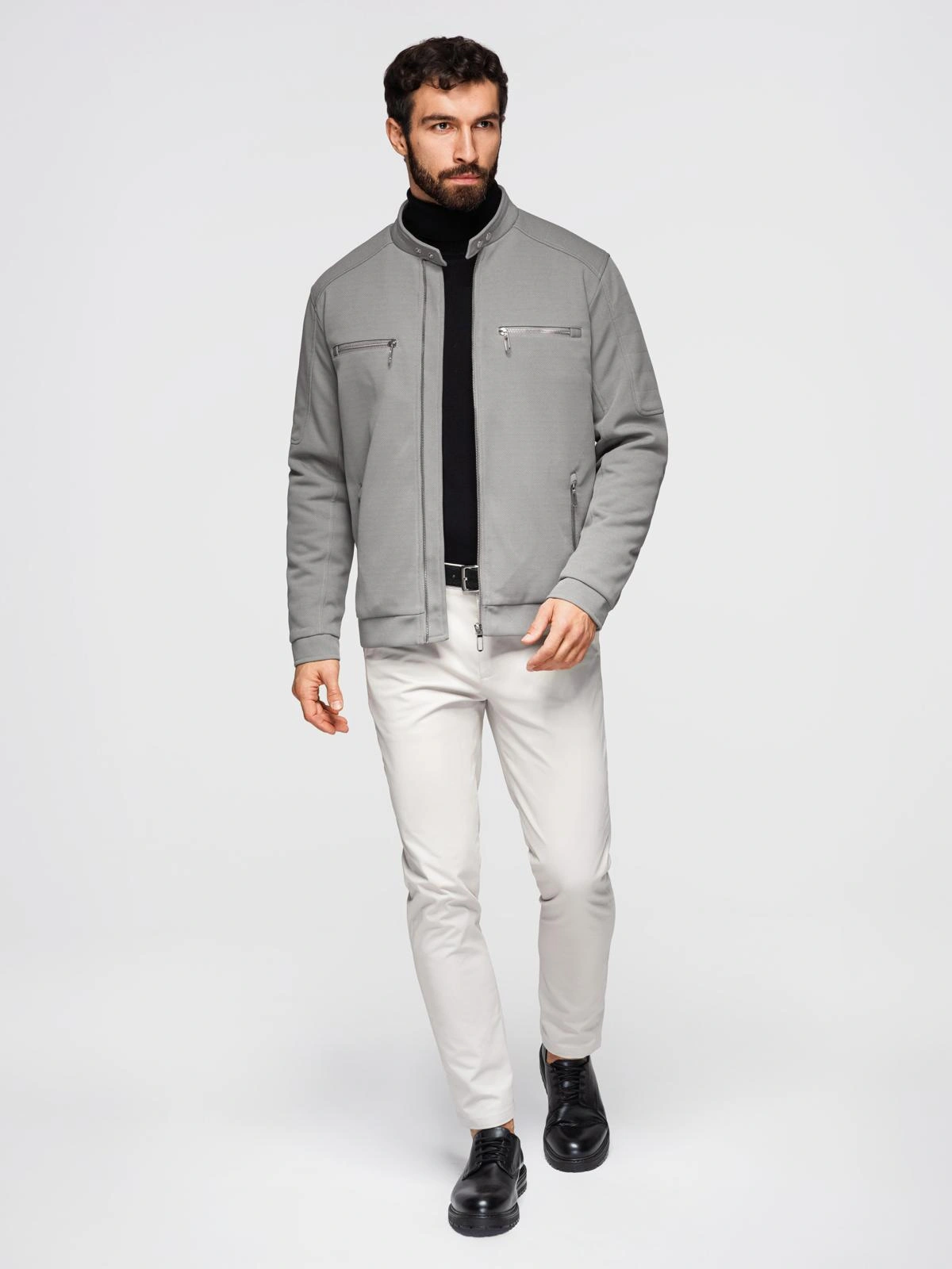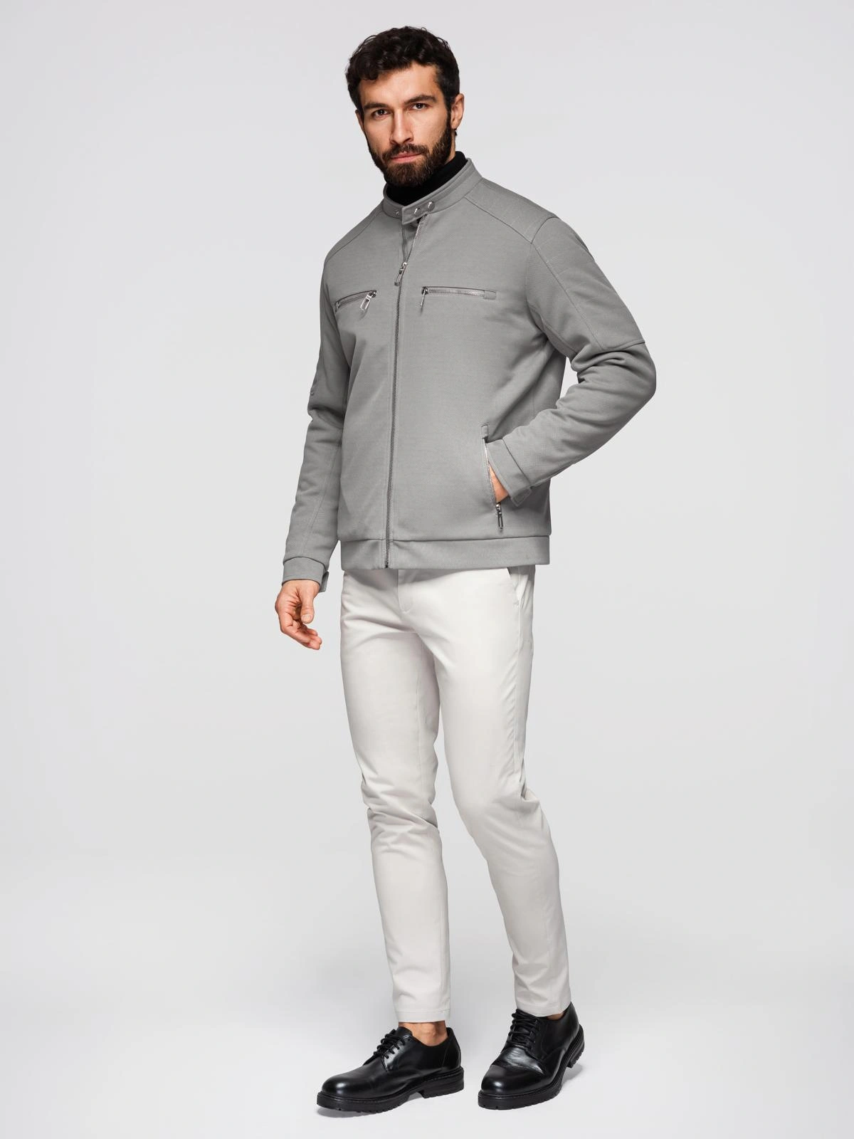 Męska kurtka typu biker z kieszeniami i stójką – szara V3 OM-JALP-0157