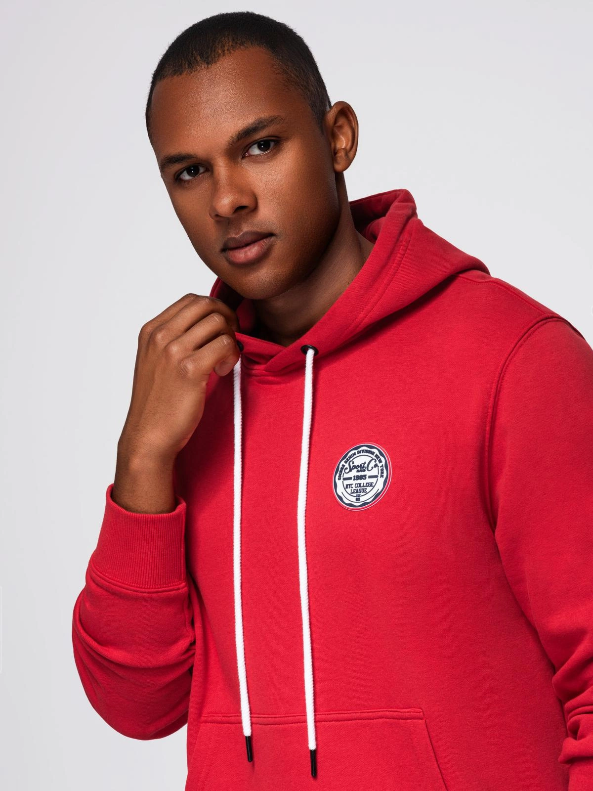 - Męska bluza dresowa kangurka z kapturem i naszywką w stylu college – czerwona V1 OM-SSNZ-0144