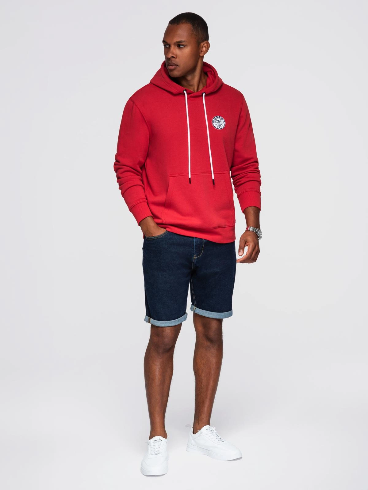 Męska bluza dresowa kangurka z kapturem i naszywką w stylu college – czerwona V1 OM-SSNZ-0144