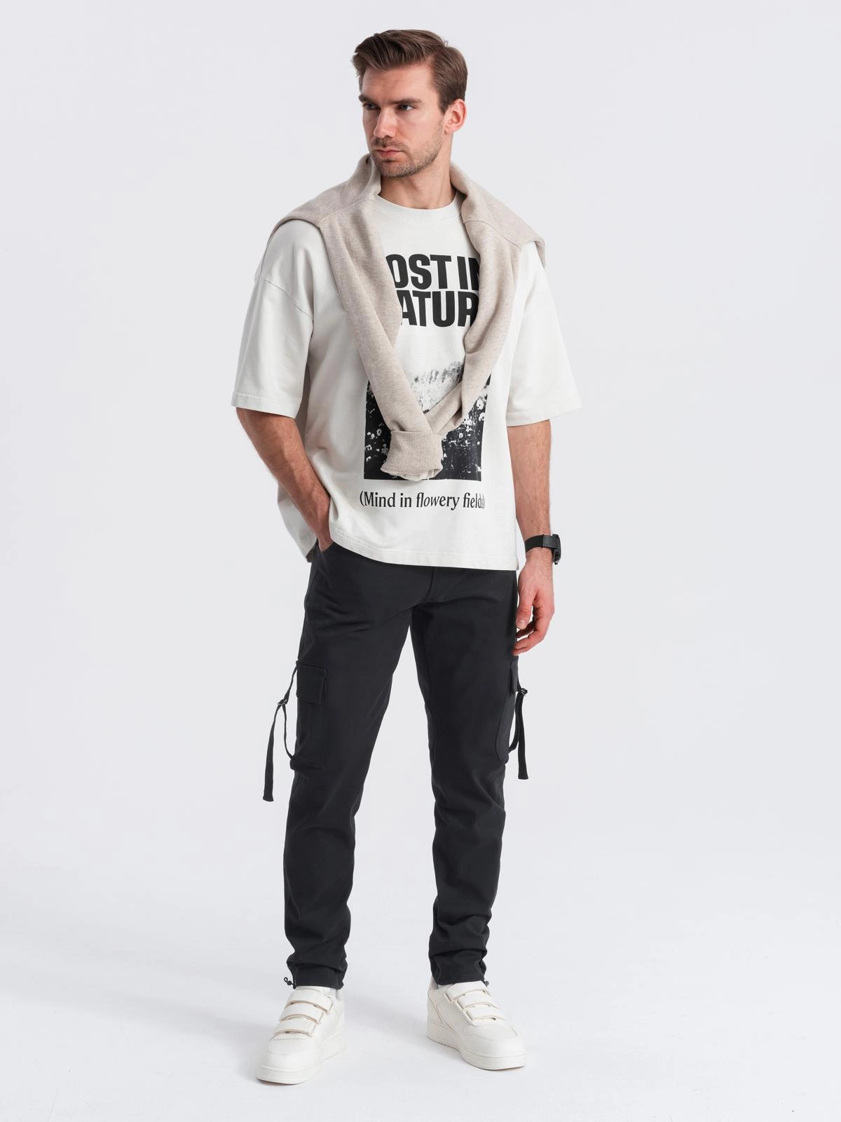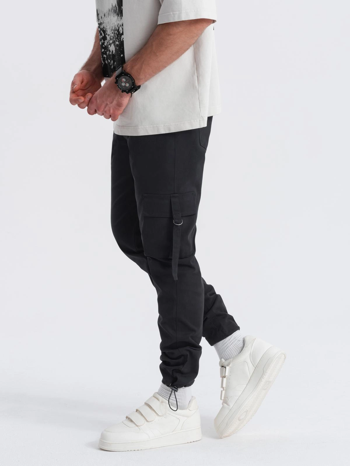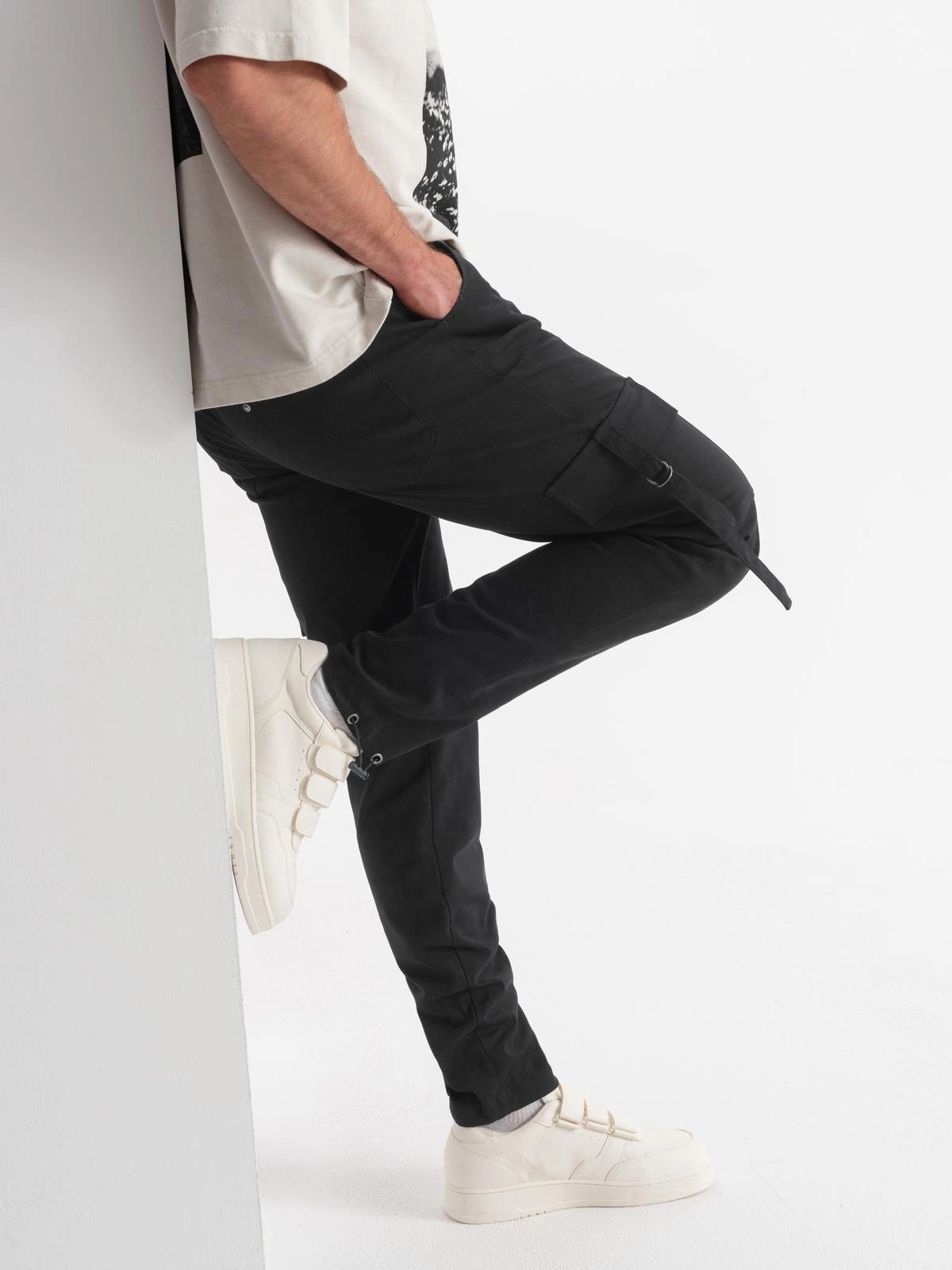 Ten model spodni cargo spodoba się miłośnikom stylu techwear i estetyki industrialnej. Zaprojektowano je z myślą o użytkowym zastosowaniu, inspirując się stylem nowoczesnego mężczyzny. Spodnie są wygodne w zakładaniu dzięki domieszce elastanu w składzie oraz gumce w pasie. Boczne kieszenie cargo z ozdobnymi regulowanymi pasami po bokach dobrze spełniają swoją funkcję – można w nich pomieścić niezbędne drobiazgi, takie jak portfel czy klucze. Bojówki można łatwo spersonalizować dobierając do nich stylowy pasek lub zawieszki.