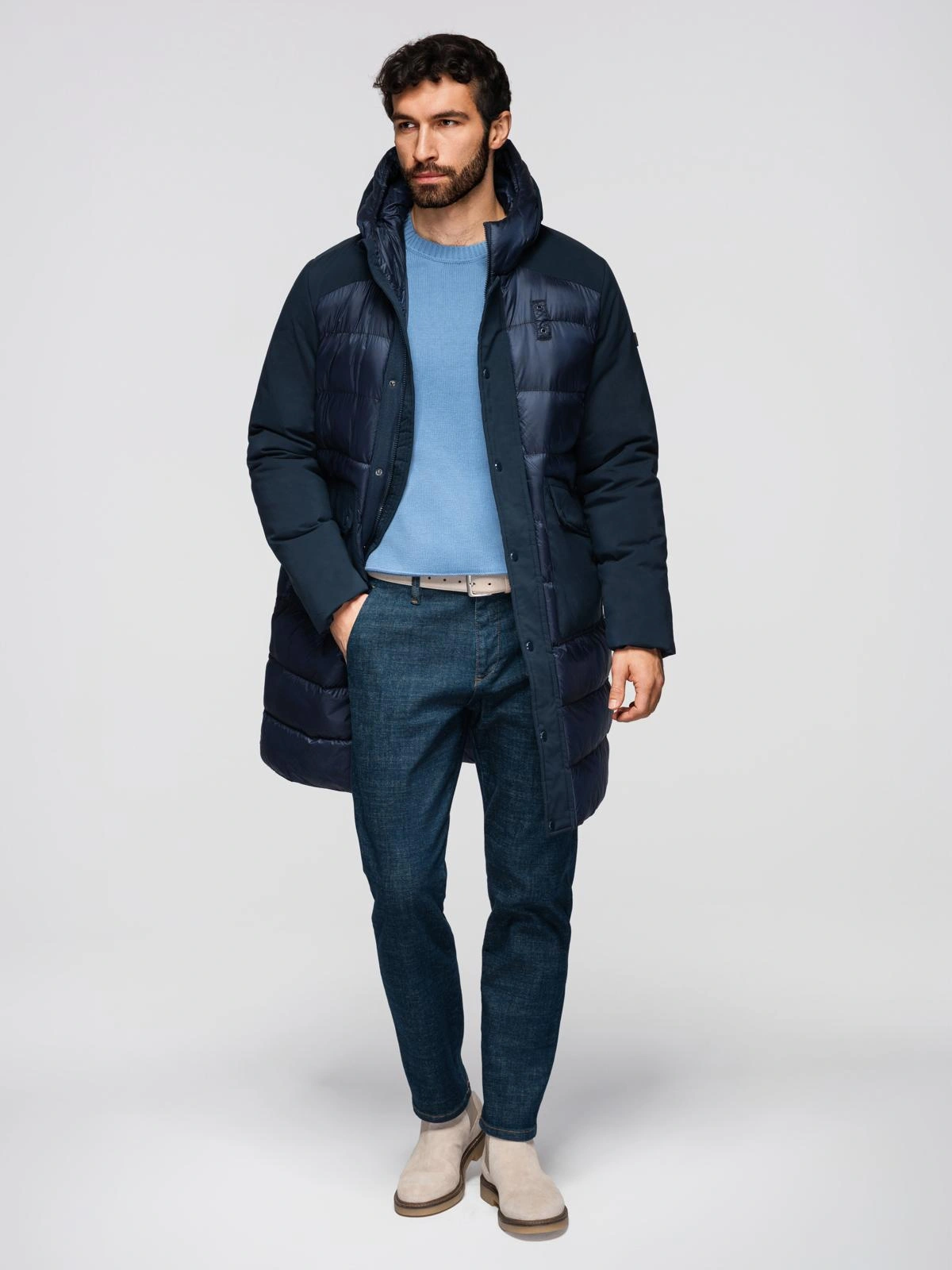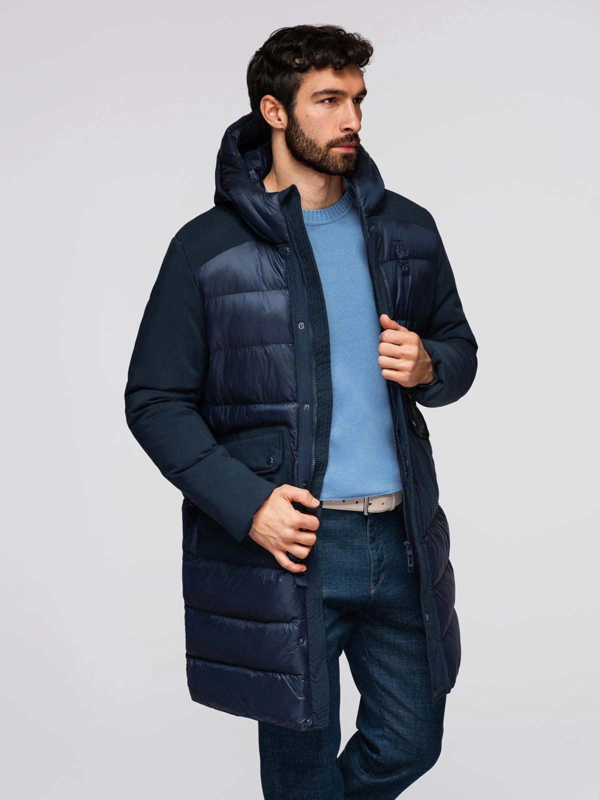 Opinie o Pikowana długa męska kurtka z dużymi kieszeniami – granatowa V4 OM-JALJ-0165