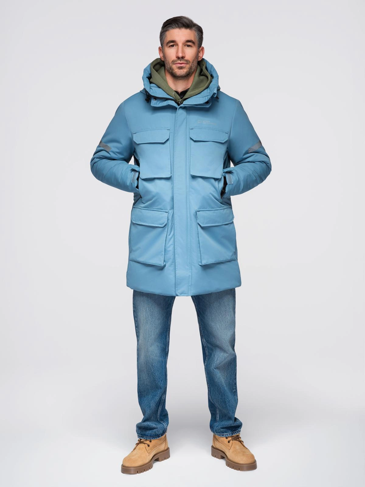 Ocieplana długa męska kurtka z odblaskowymi elementami – niebieska V4 OM-JALJ-0169