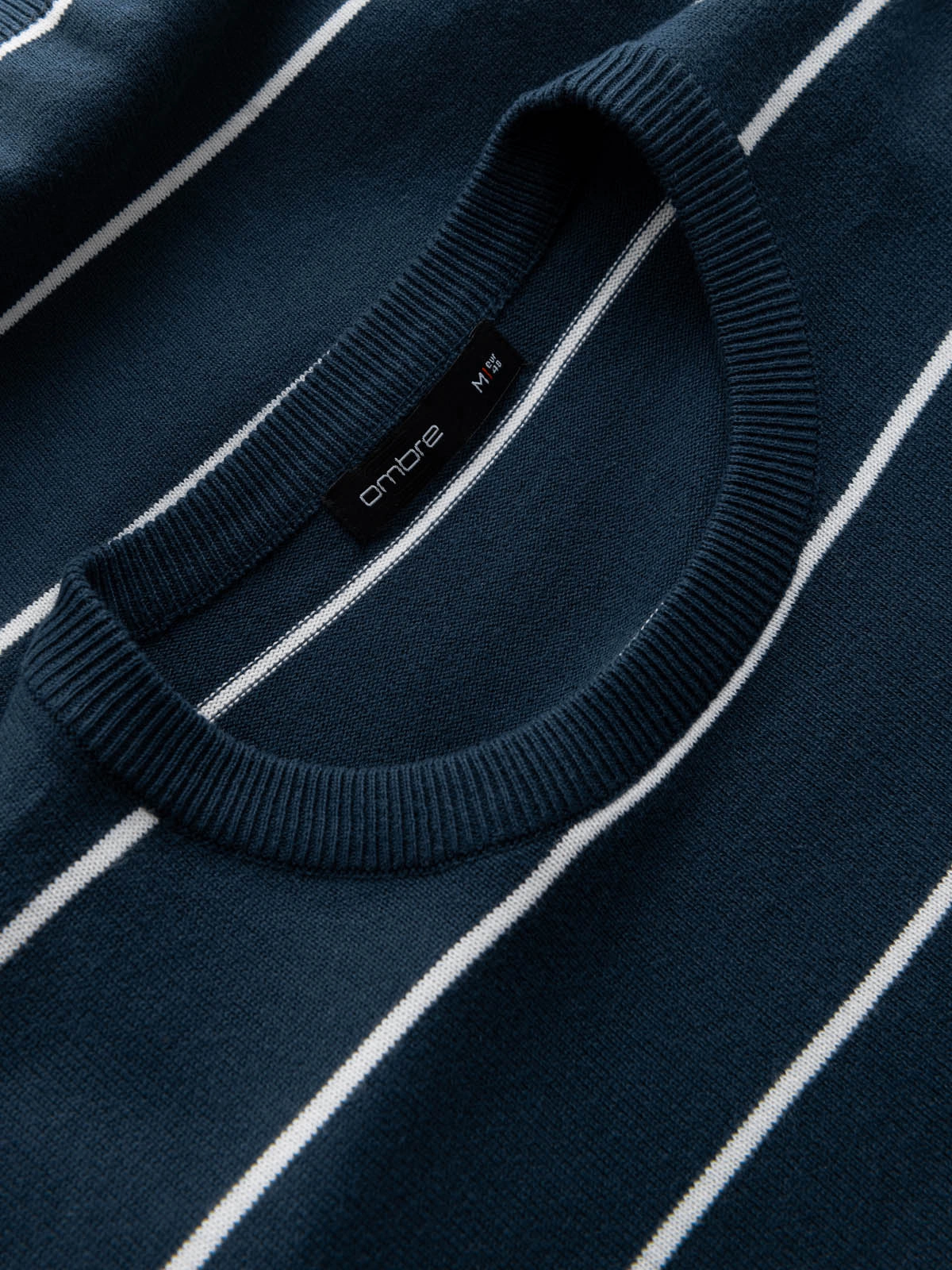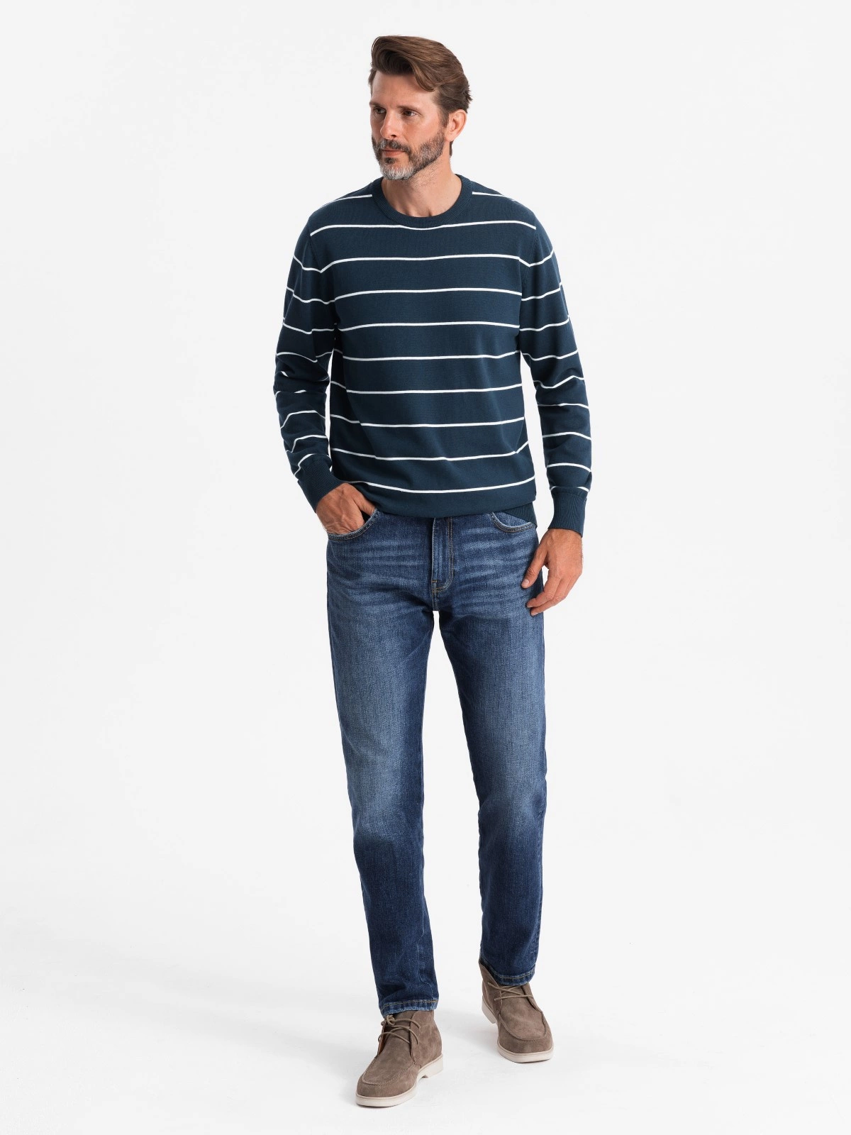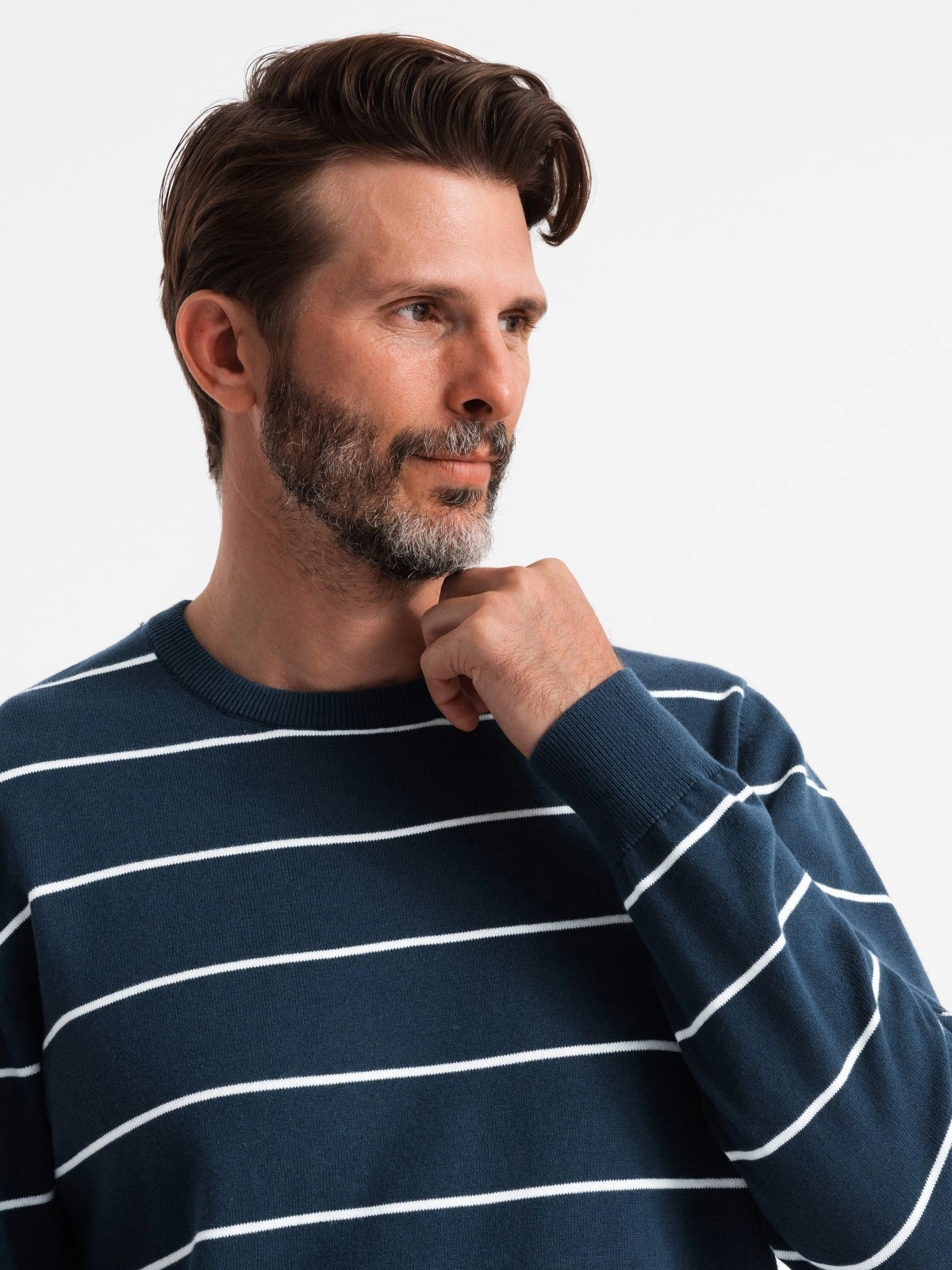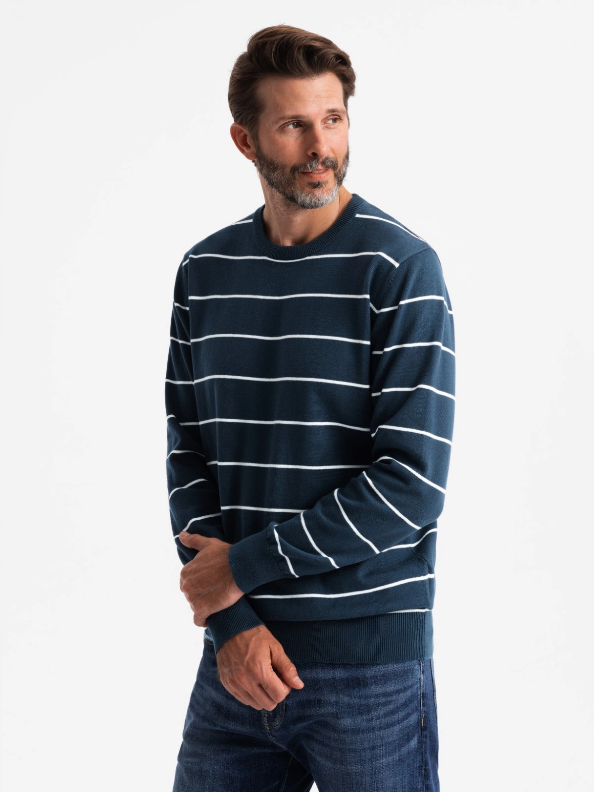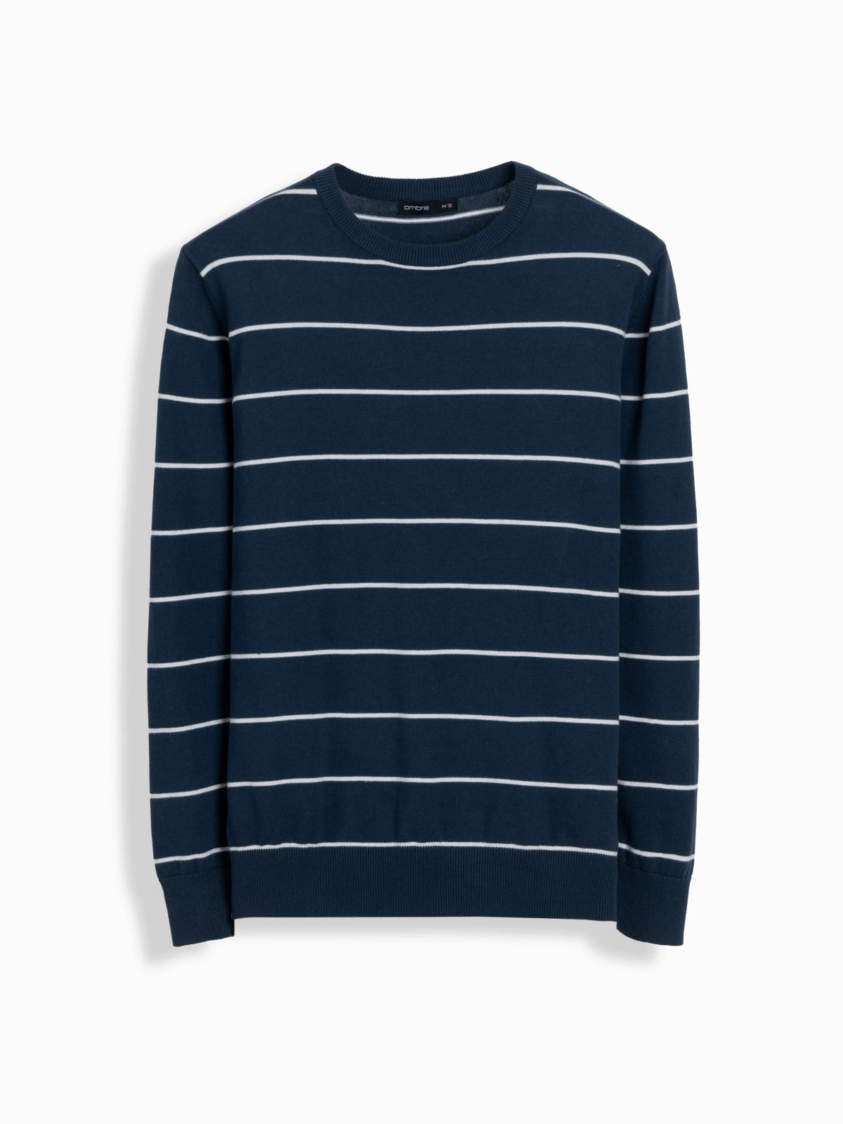 Ponadczasowa klasyka, którą pokochało wielu mężczyzn! Sweter w dwukolorowe paski niezmiennie kojarzy się ze stylem codziennym. To prosty sposób na urozmaicenie stonowanych zestawów – nieregularny deseń skutecznie przyciąga wzrok, nadając luźny ton kompozycji. Miły w dotyku materiał z mieszanych włókien zapewnia komfort oraz pełną swobodę ruchów.