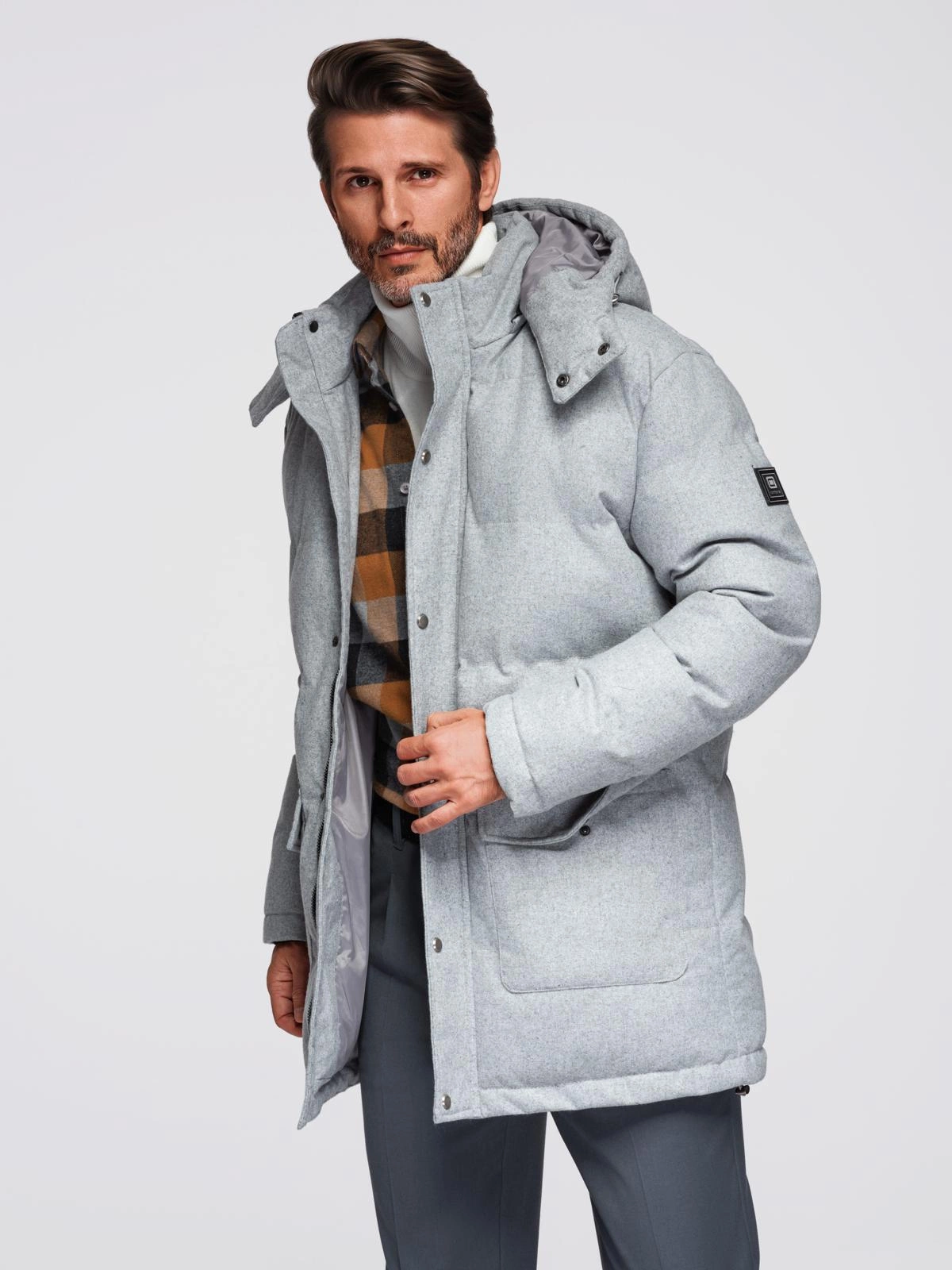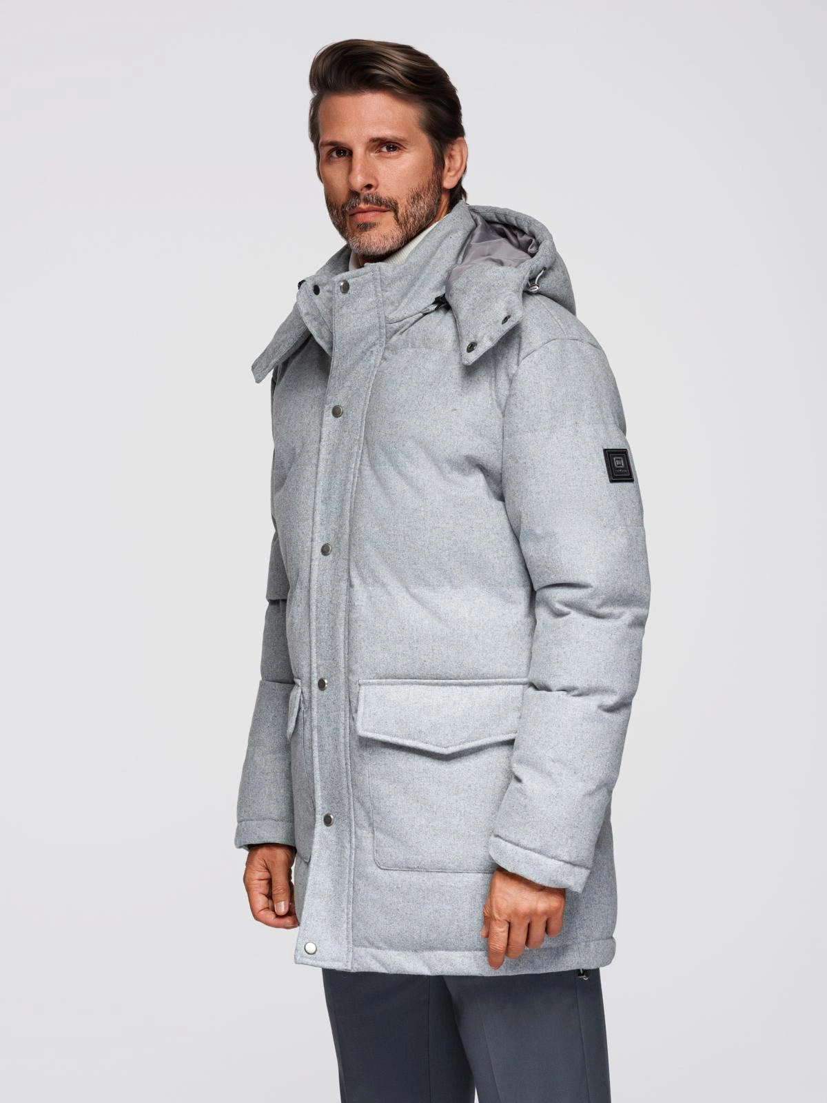 - Ciepła długa męska kurtka typu parka z wełną – jasnoszary melanż V3 OM-JALJ-0217