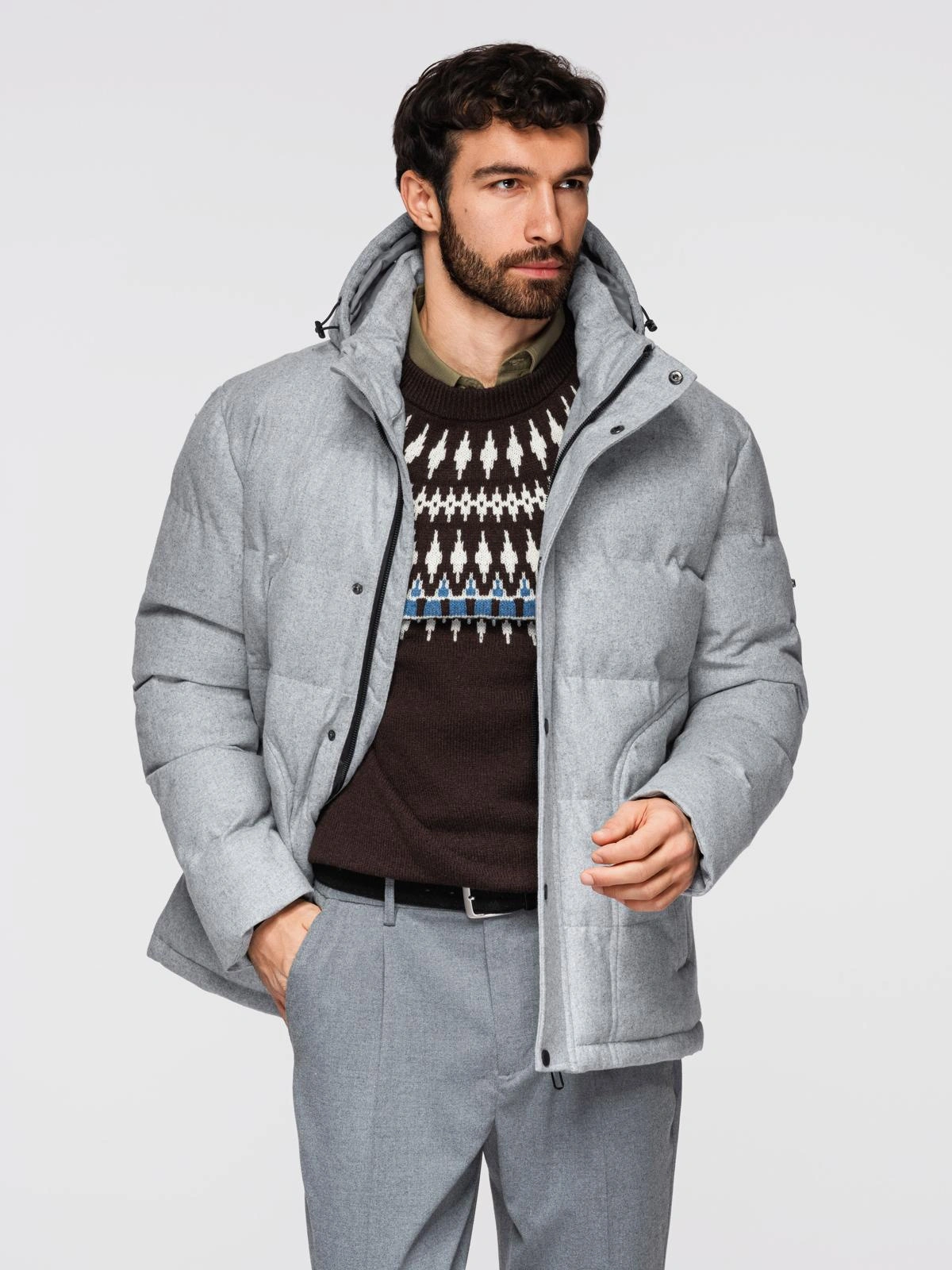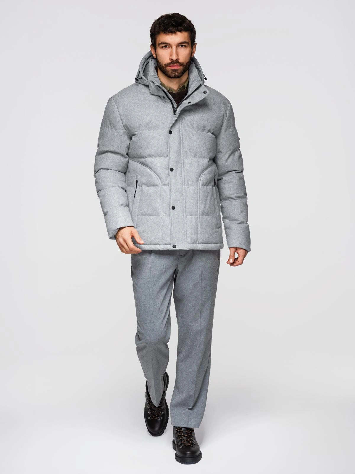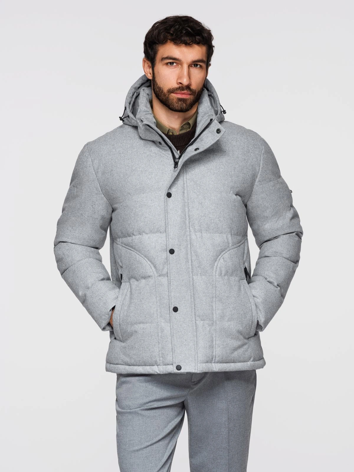 Męska casualowa kurtka puffer z wełną – jasnoszary melanż V3 OM-JAHP-0203