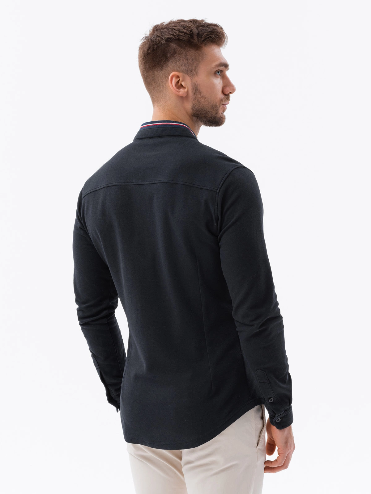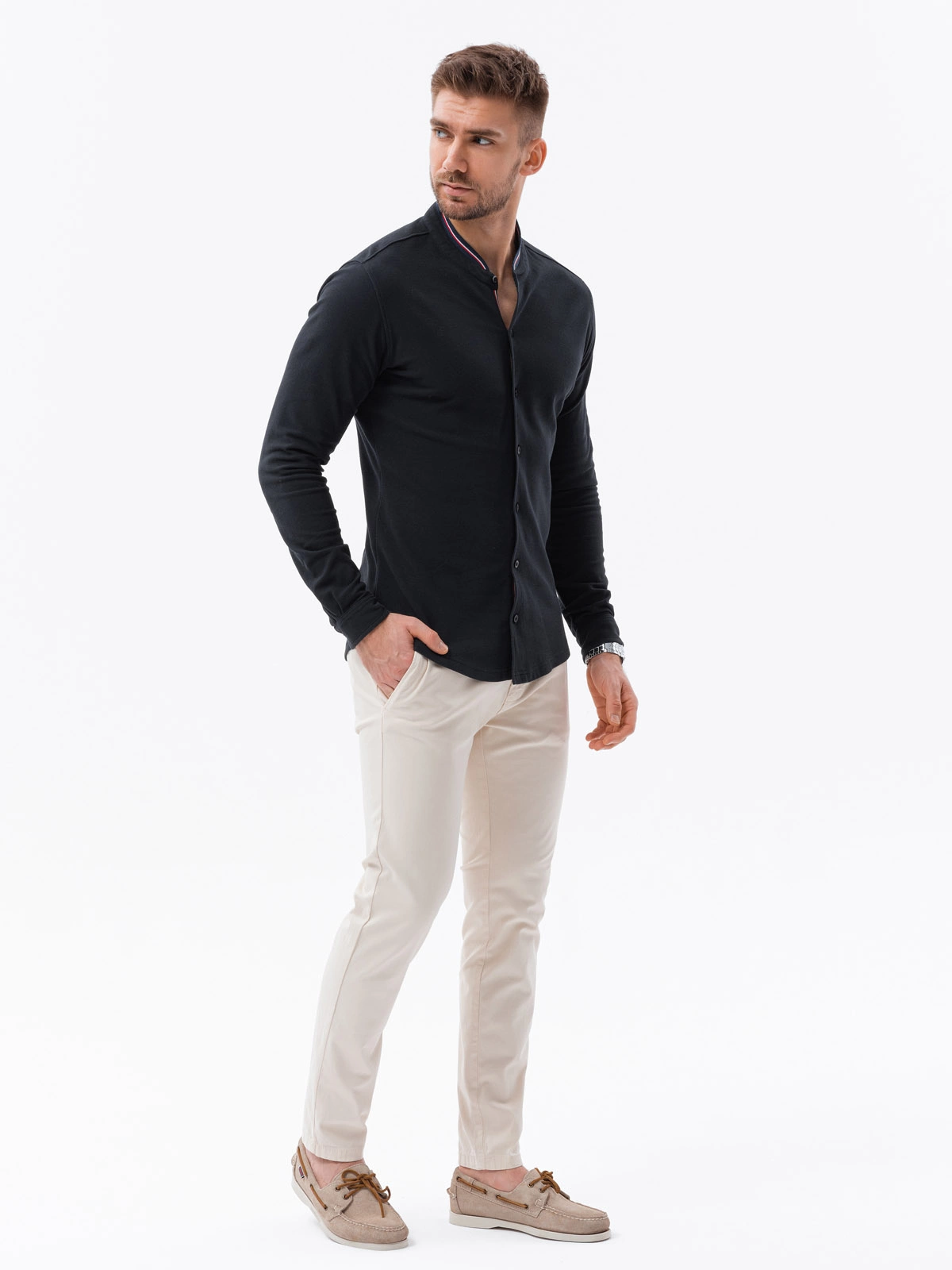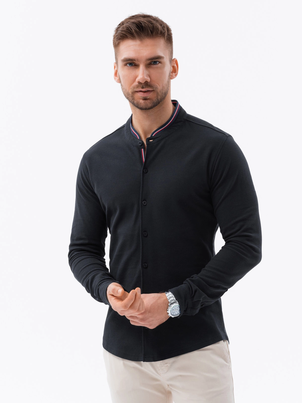 Bawełniana koszula męska SLIM FIT ze stójką w kolorowe paski – czarna V4 OM-SHCS-0178