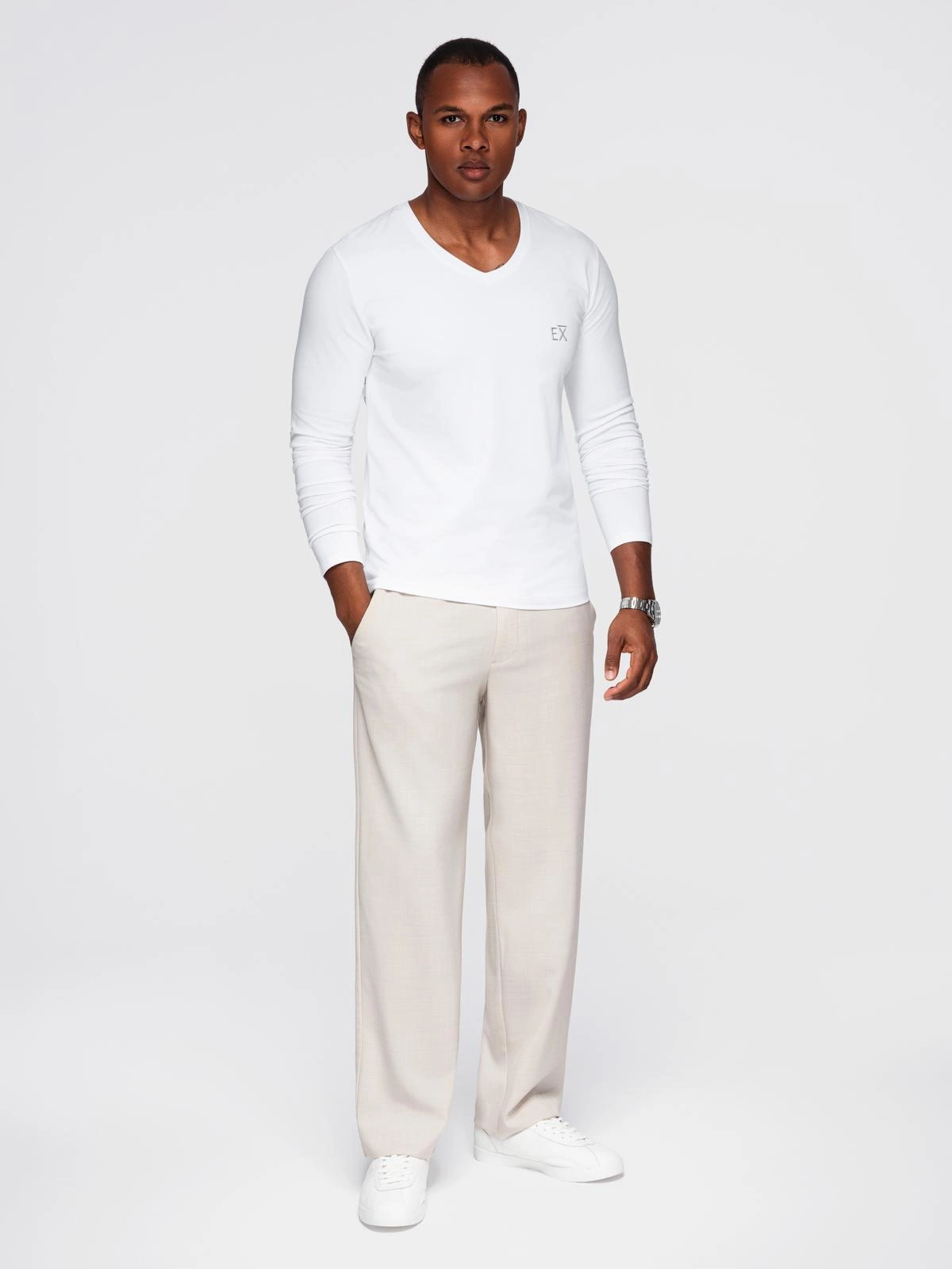 Męski longsleeve V-neck SLIM FIT z elastanem i printem – biały V2 OM-LSBC-0123