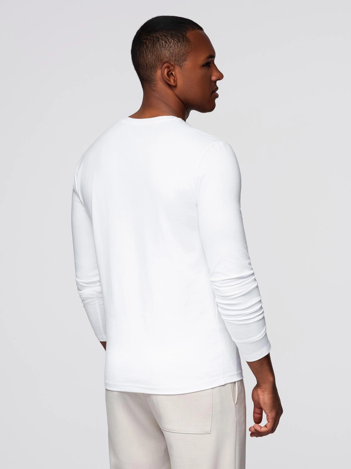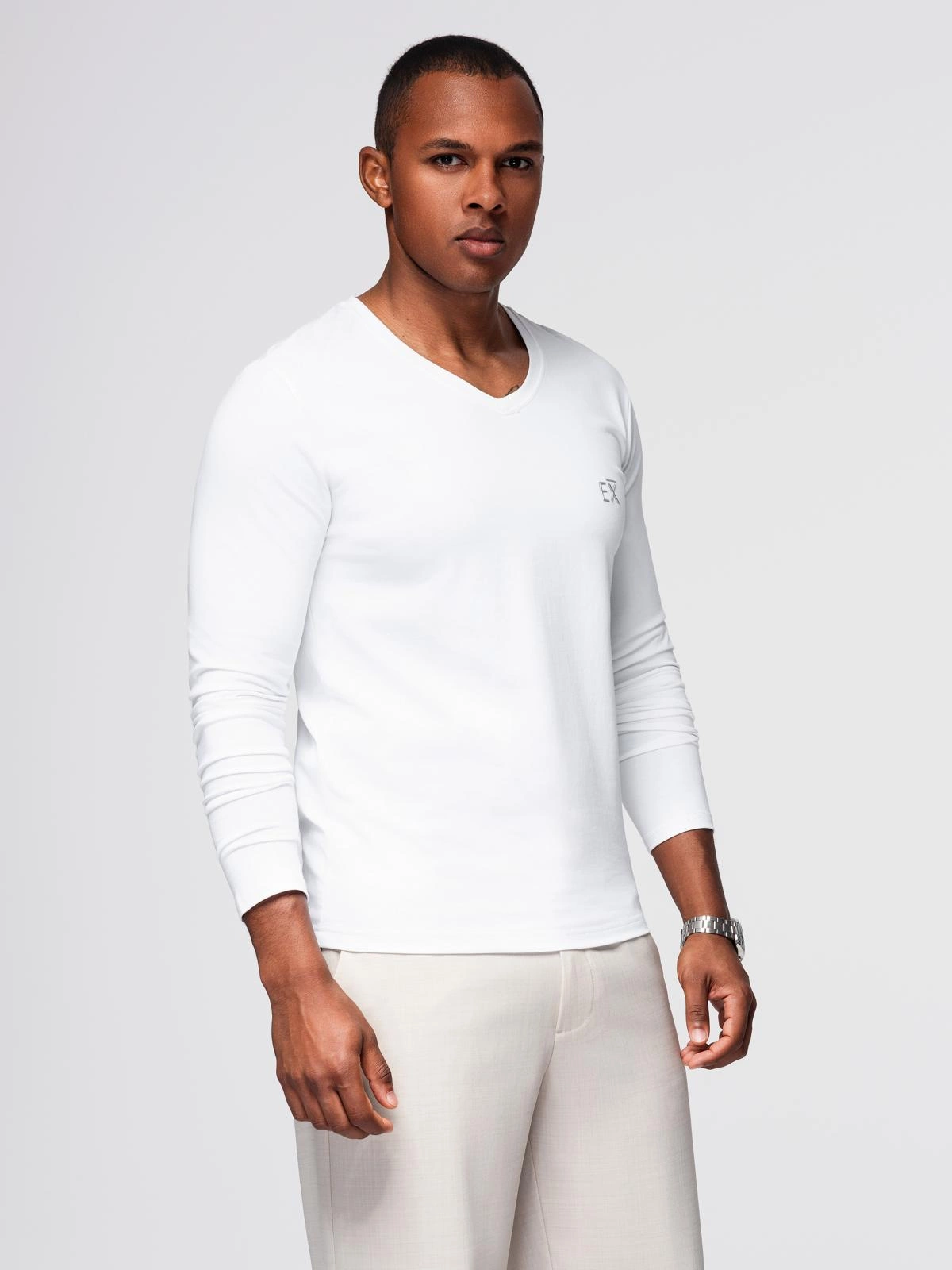- Męski longsleeve V-neck SLIM FIT z elastanem i printem – biały V2 OM-LSBC-0123