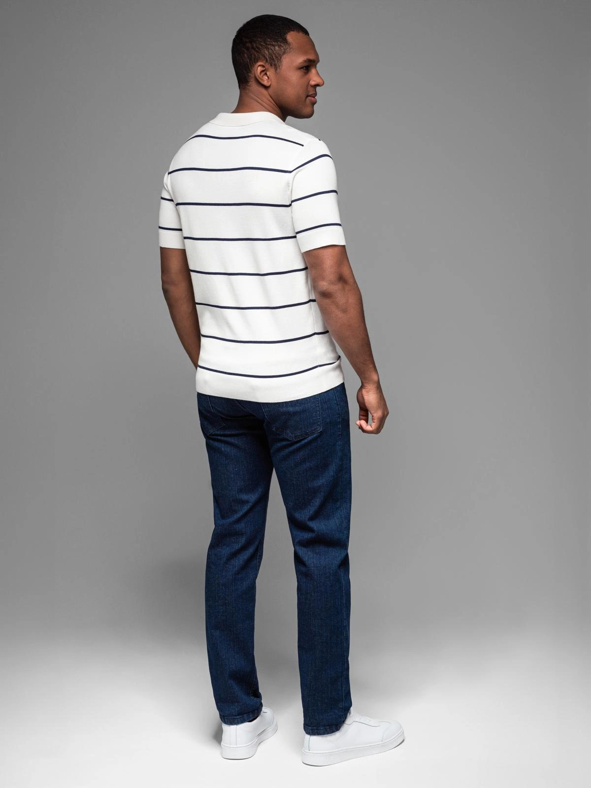 Koszulka męska polo w poziome paski z wiskozą – biało-granatowa V2 OM-POSS-0145