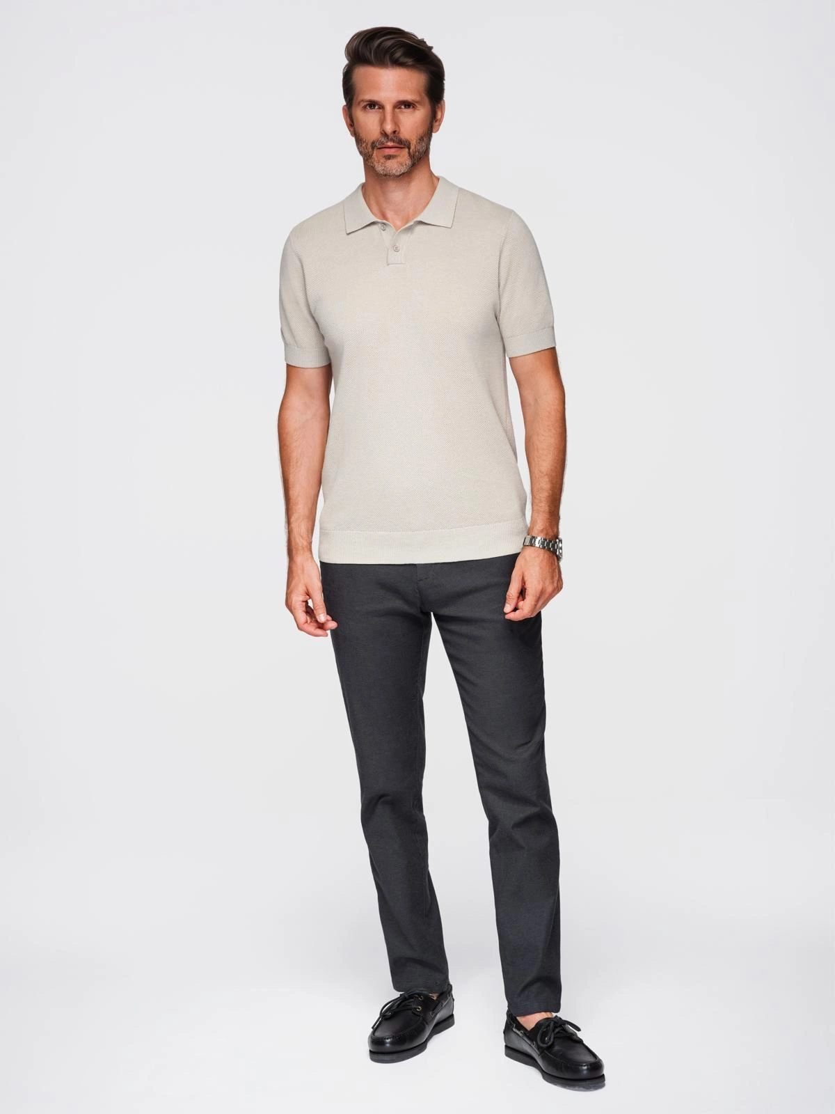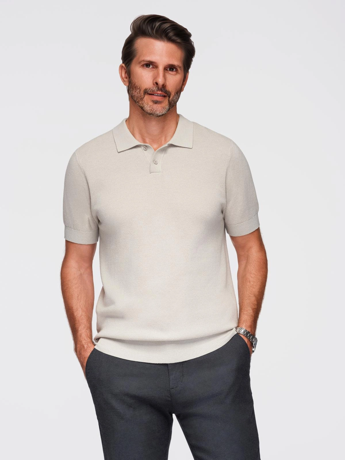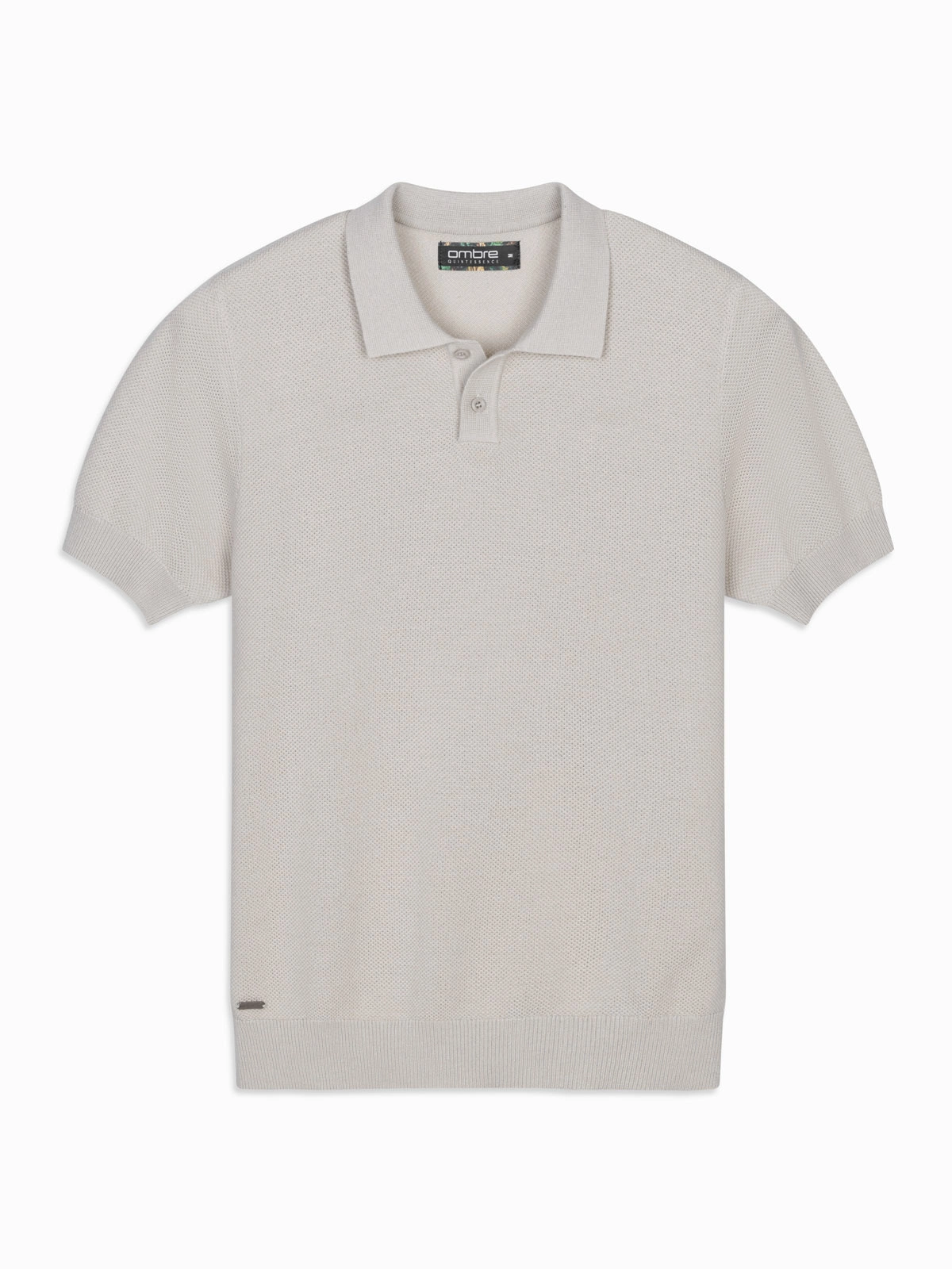 - Męska bawełniana koszulka polo ze strukturalnej dzianiny – beżowa V6 OM-POSS-0117