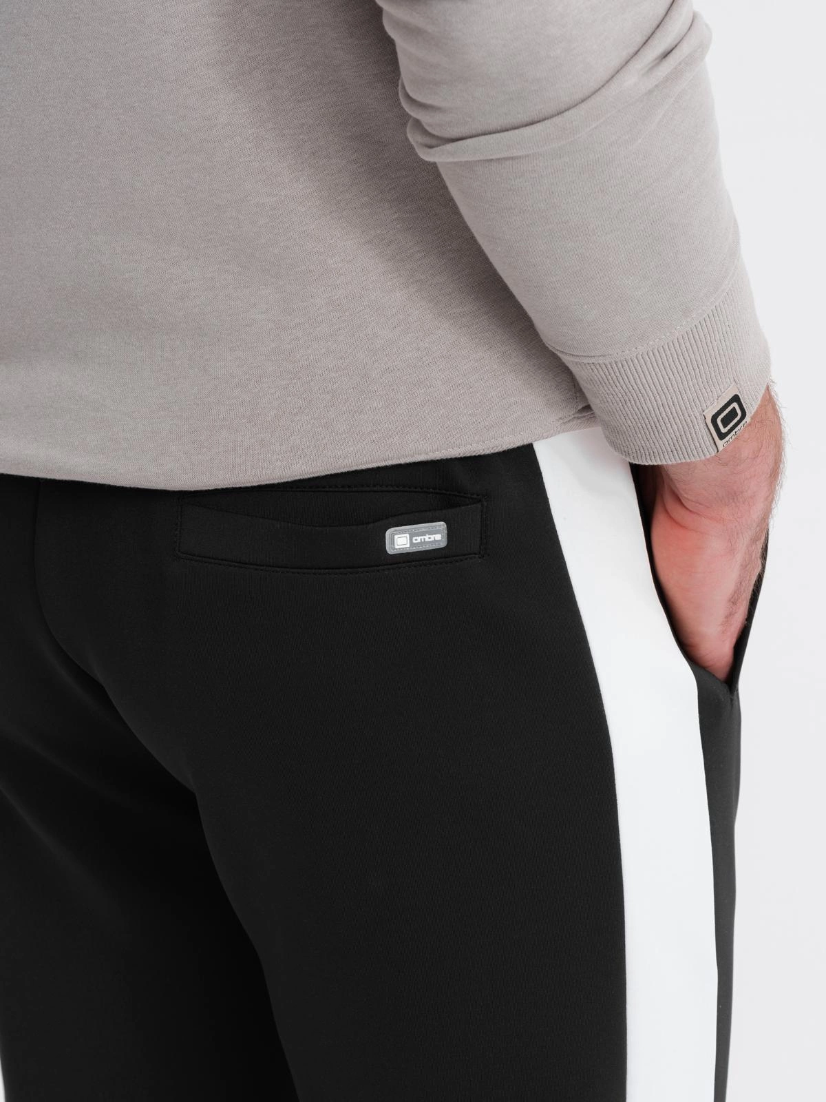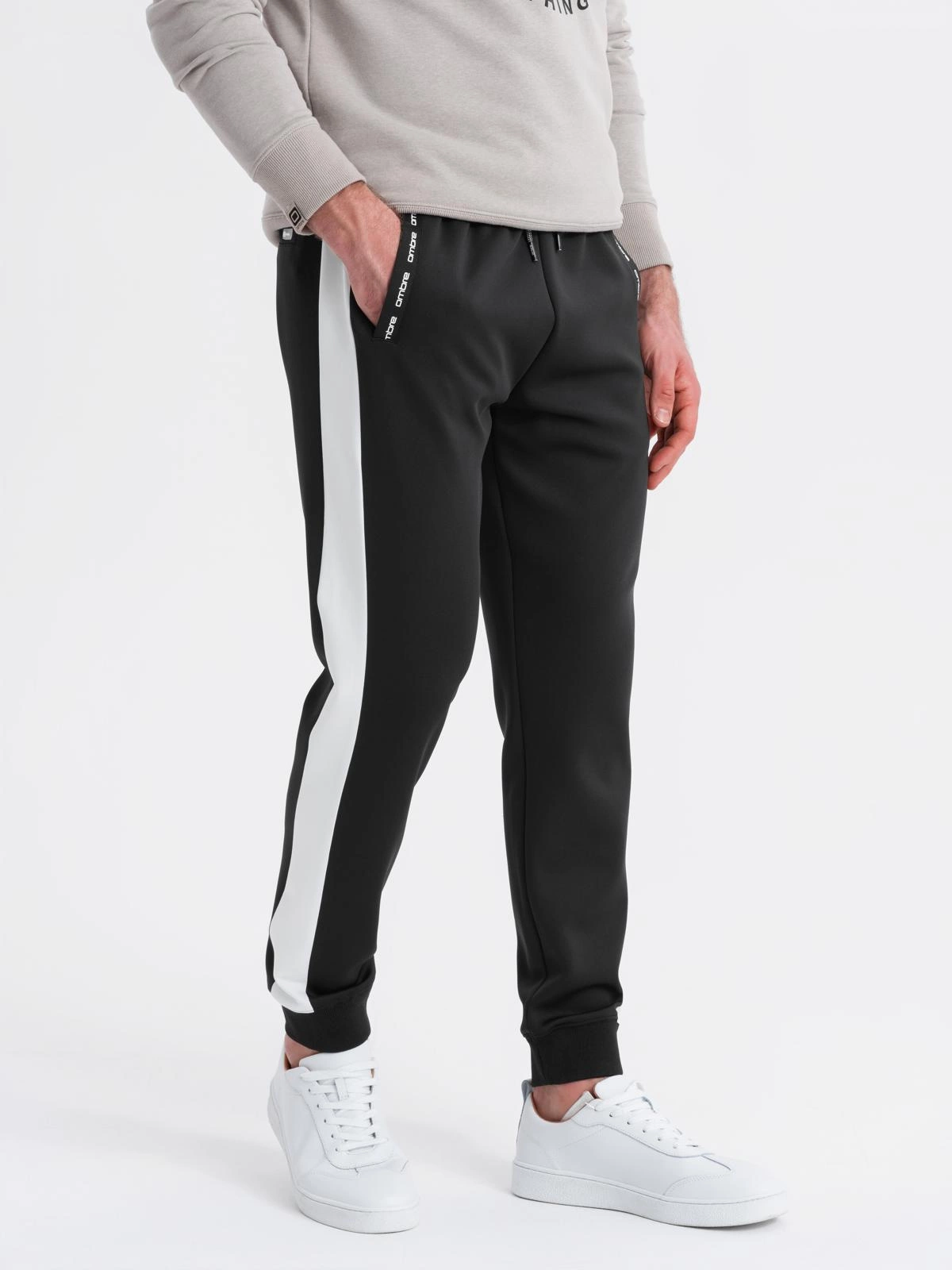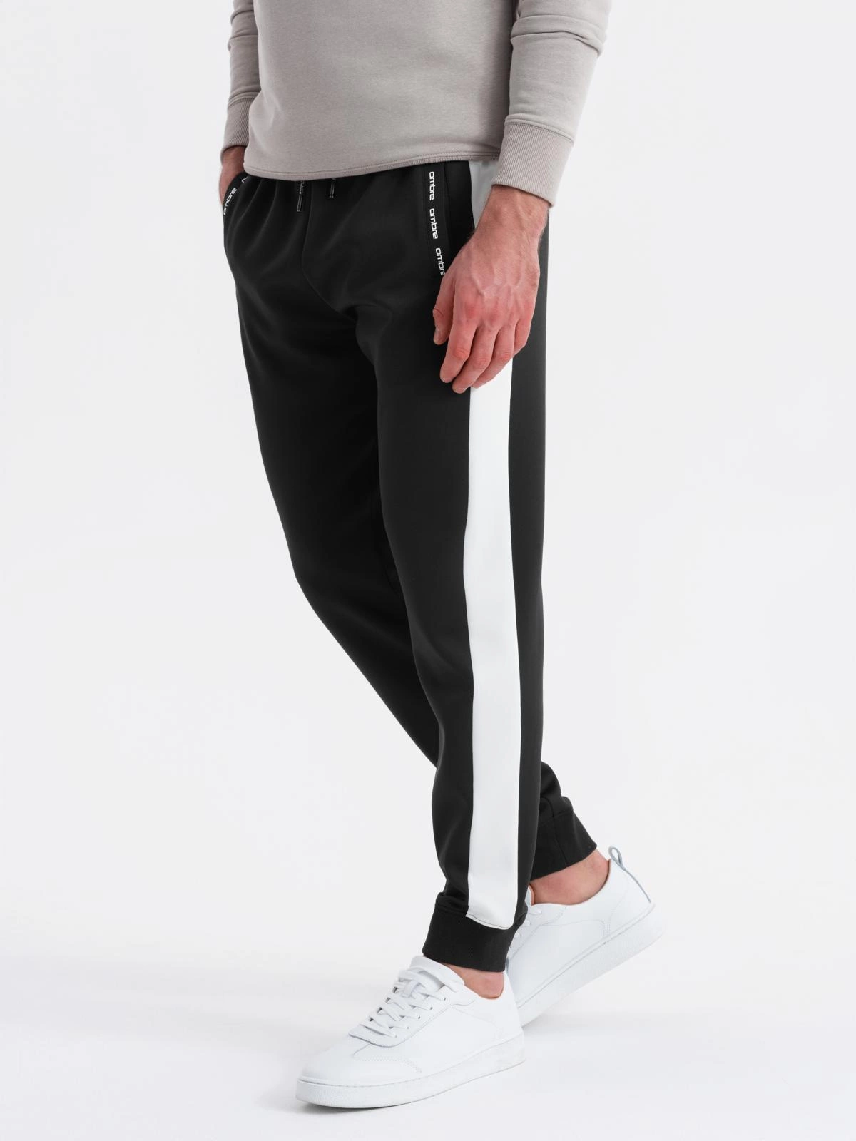 Dresowe męskie spodnie joggery z kontrastowymi lampasami – czarne V1 OM-PASK-0229