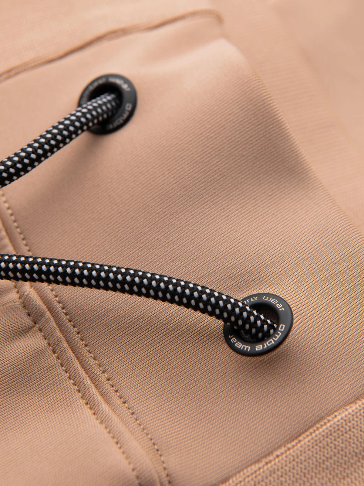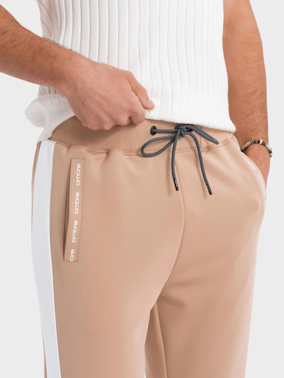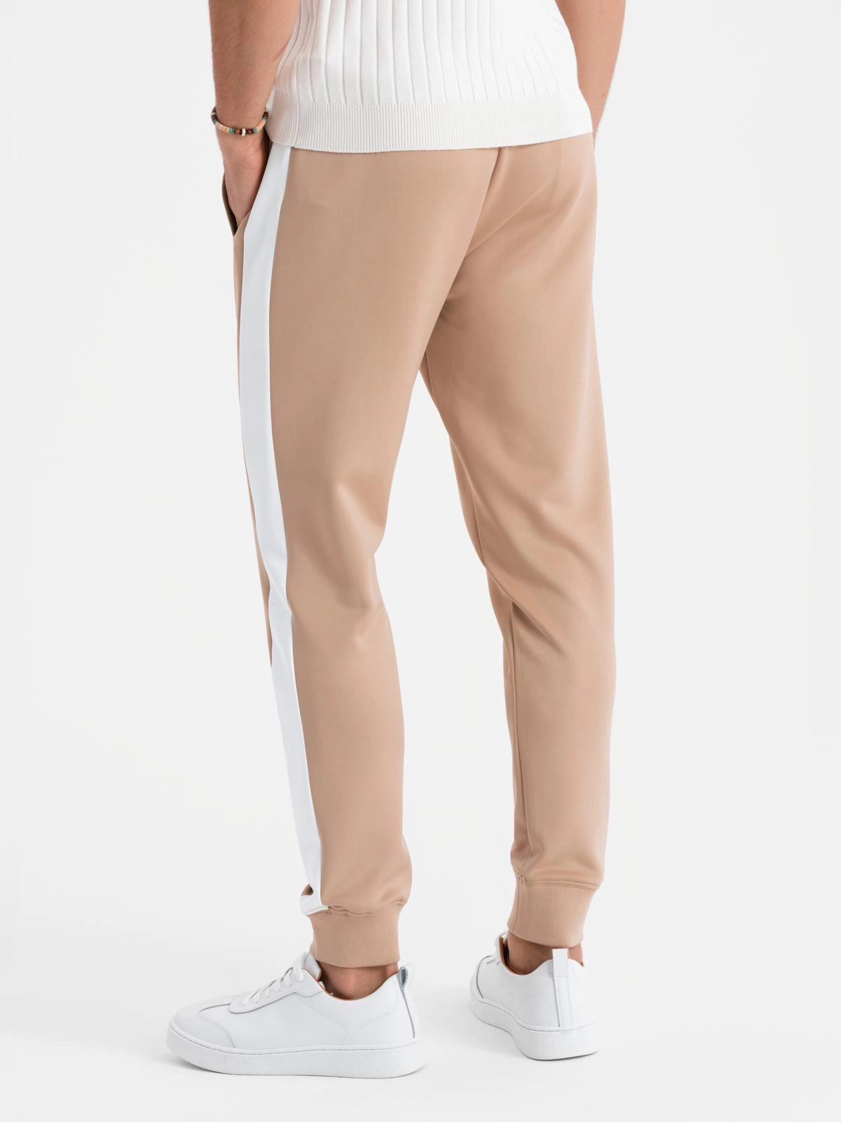 Męskie dresowe spodnie joggery z kontrastowymi lampasami – beżowe V4 OM-PASK-0229