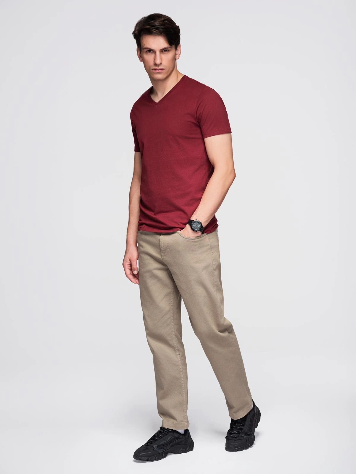 Bawełniana klasyczna męska koszulka z dekoltem w serek BASIC – bordowa V10 OM-TSBS-0237