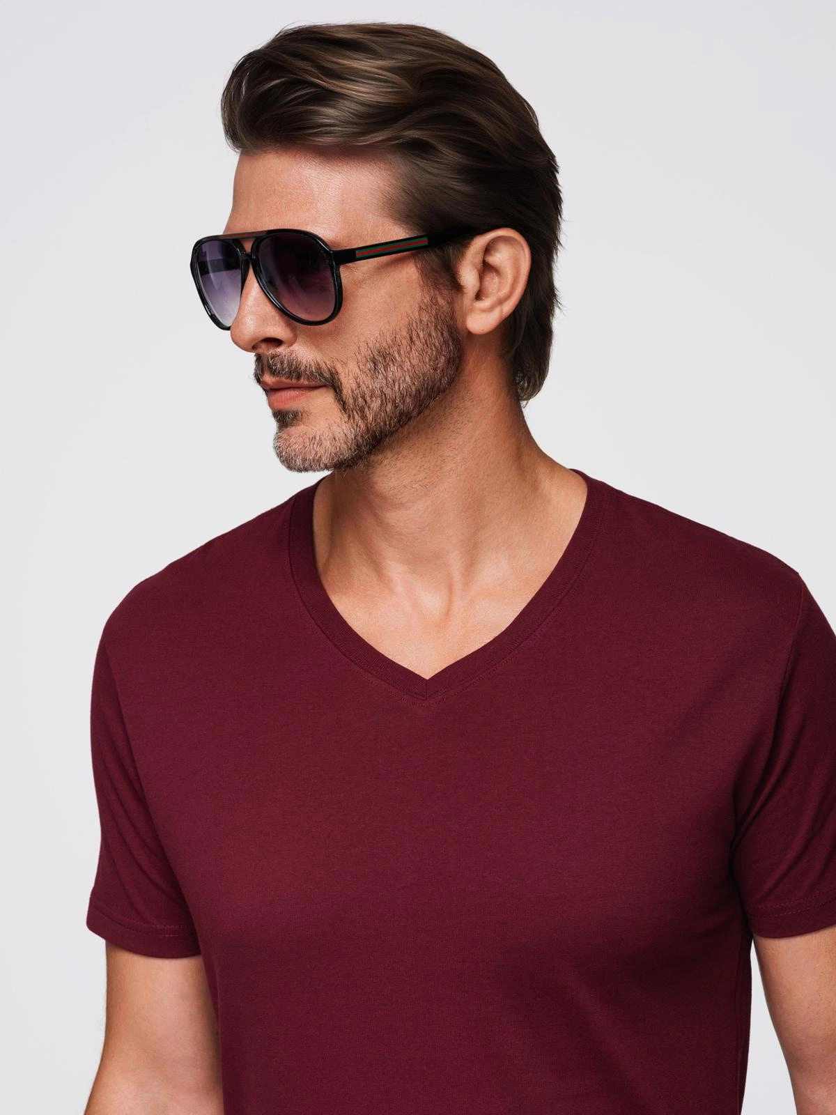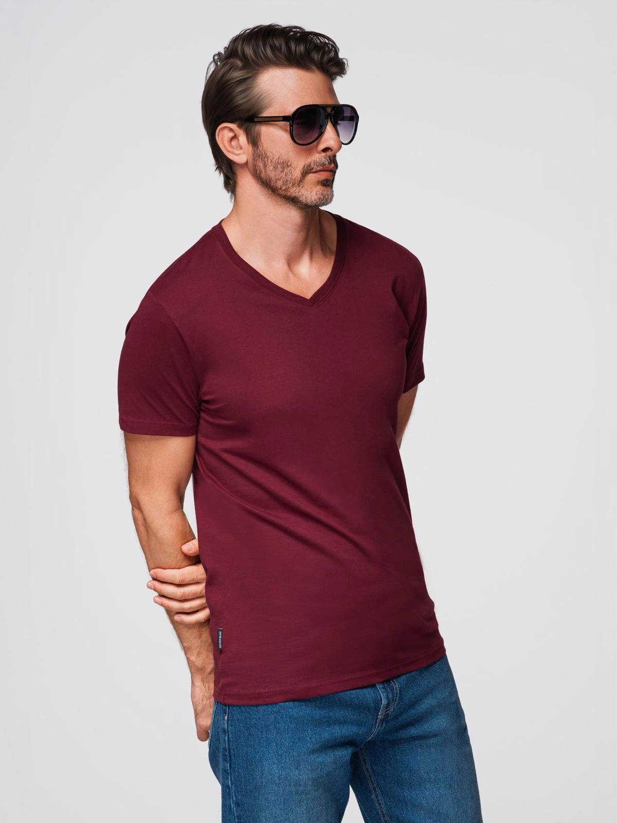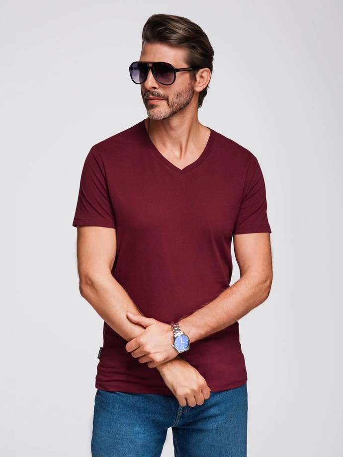 Bawełniana klasyczna męska koszulka z dekoltem w serek BASIC – bordowa V10 OM-TSBS-0237