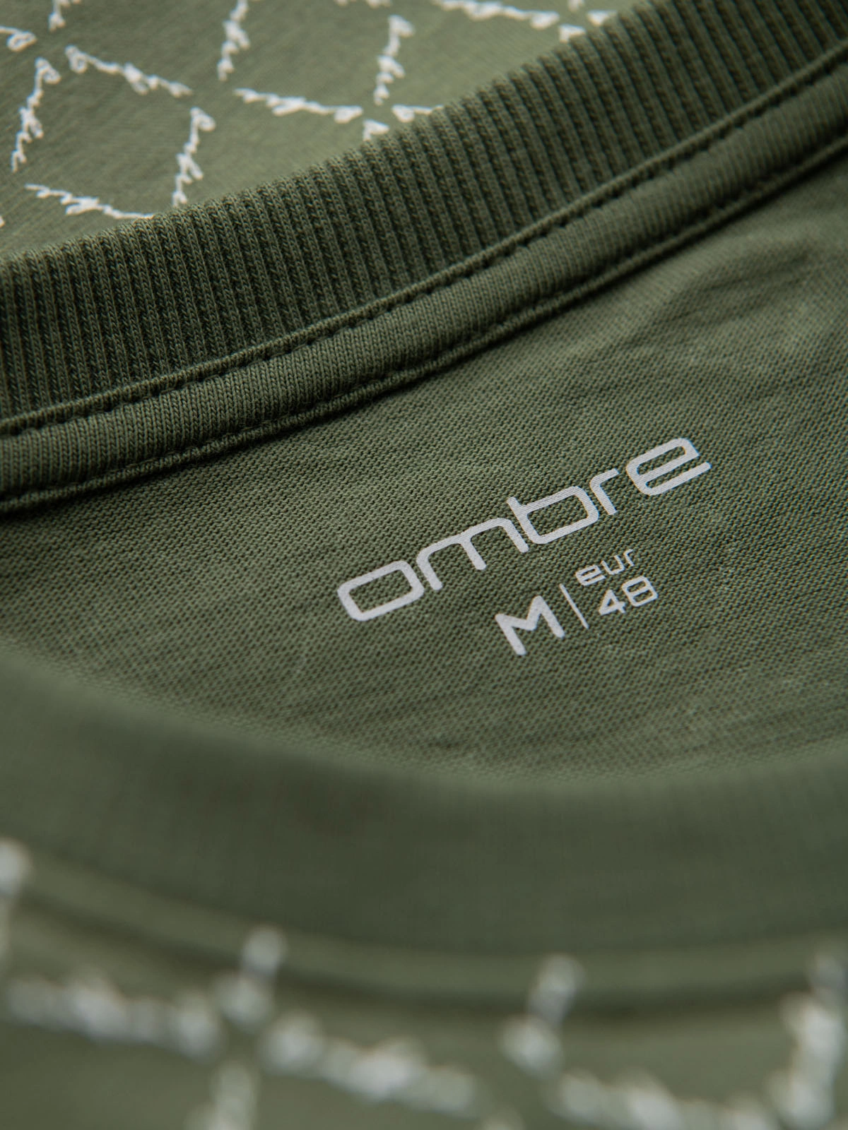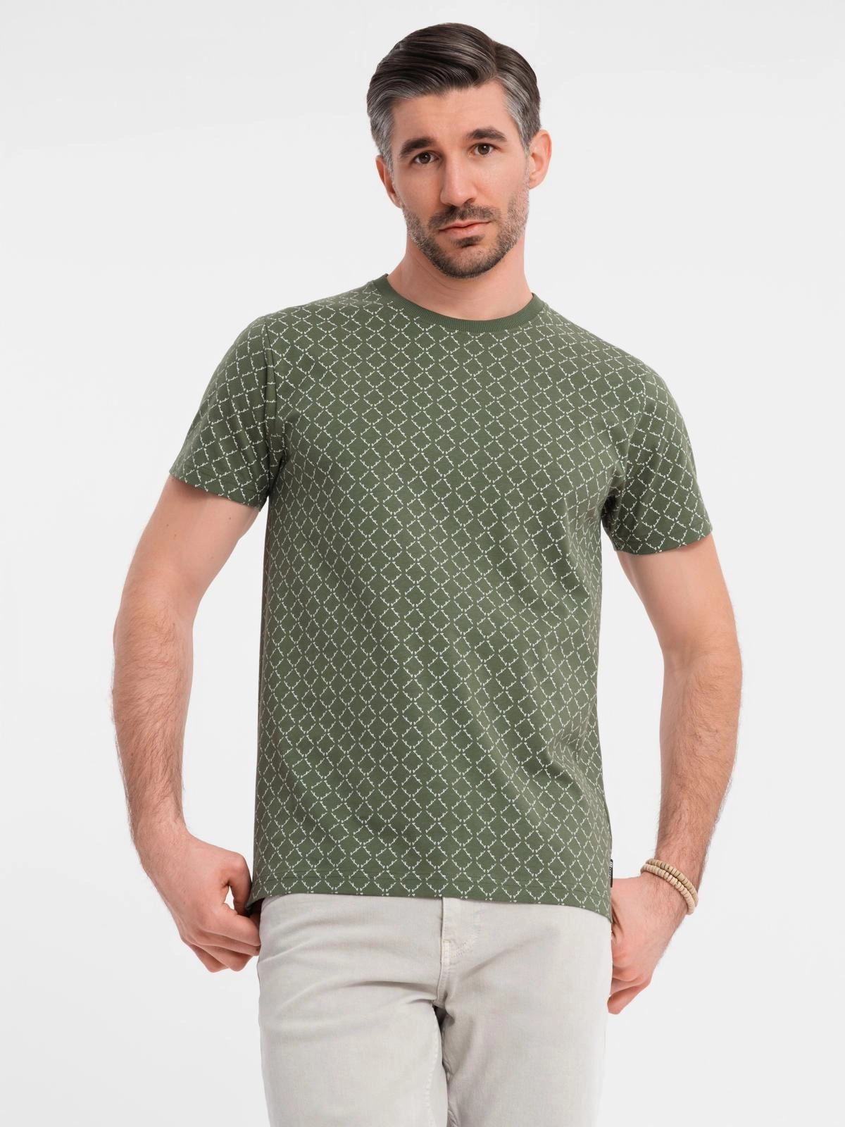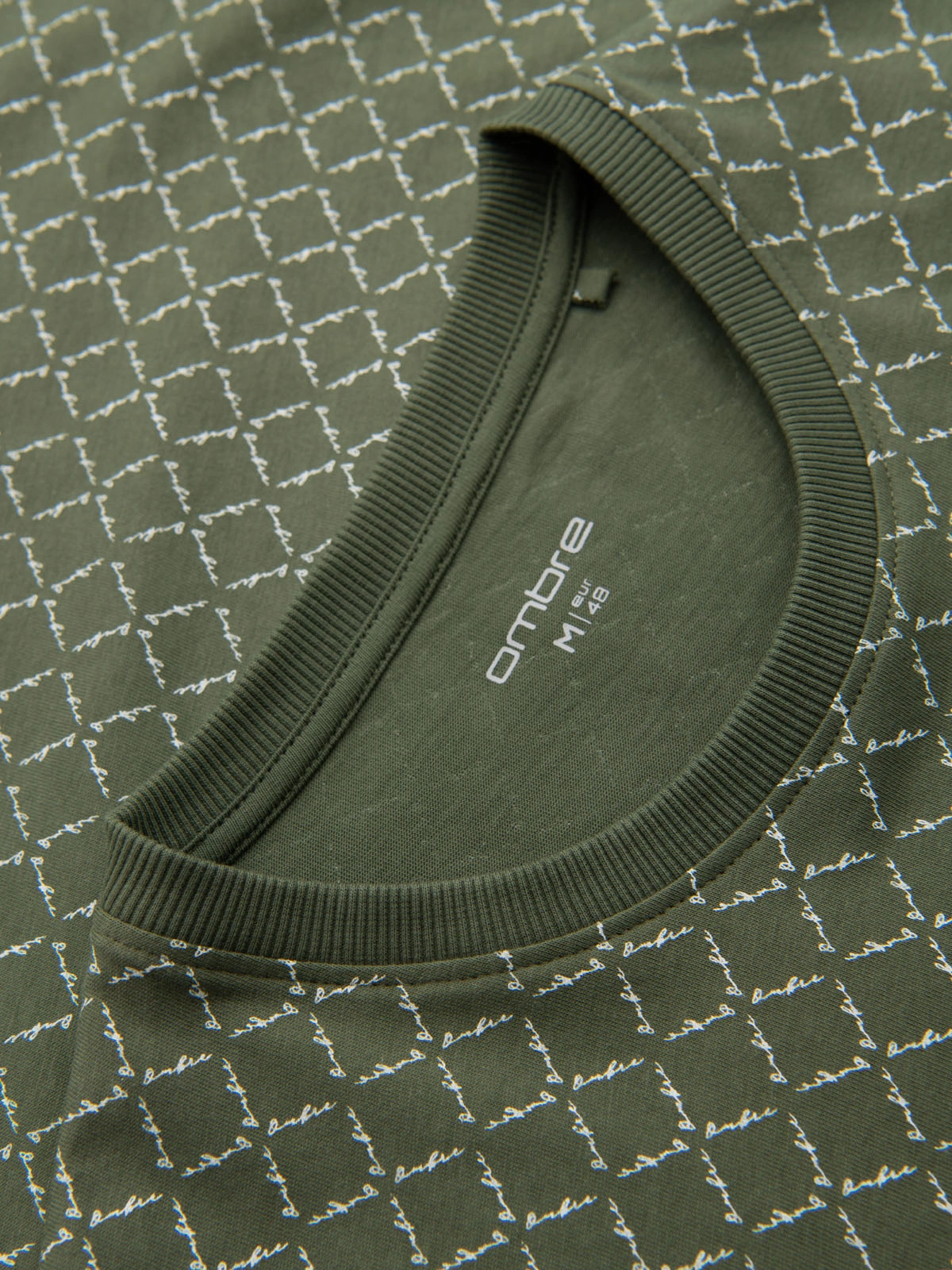 - Koszulka męska dzianinowa z nadrukiem full print – oliwkowa V2 OM-TSFP-0250
