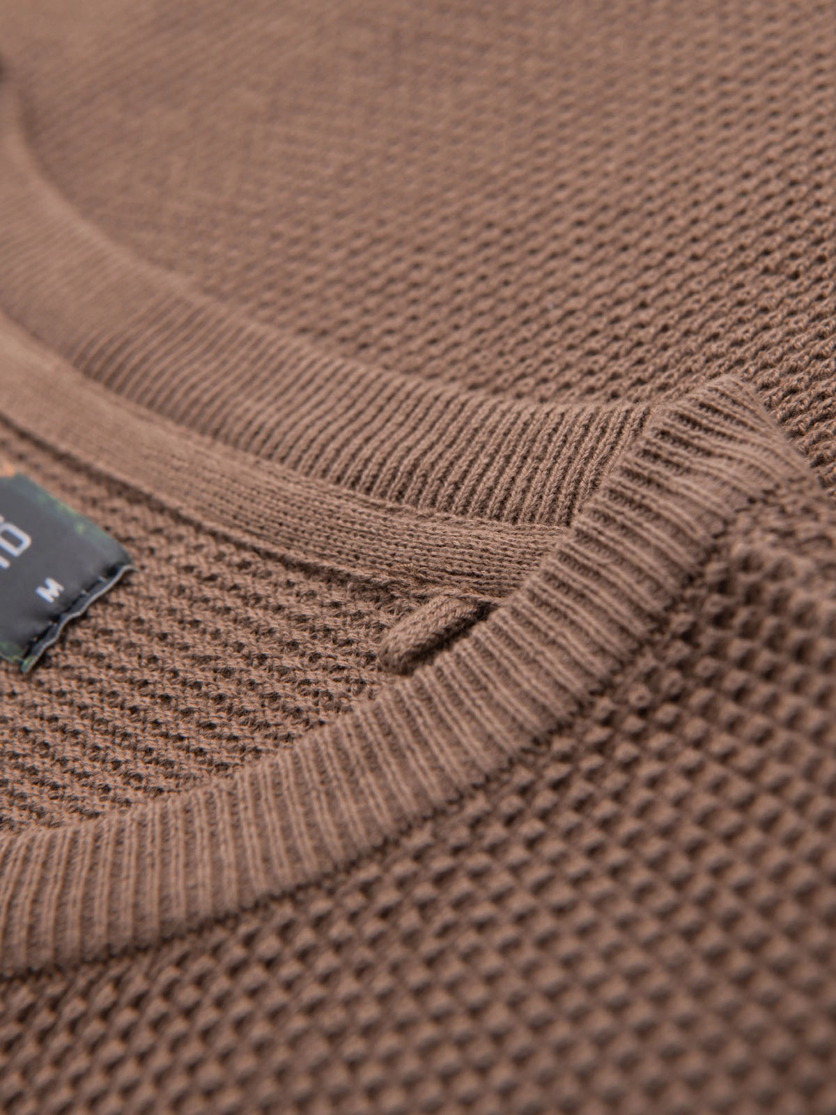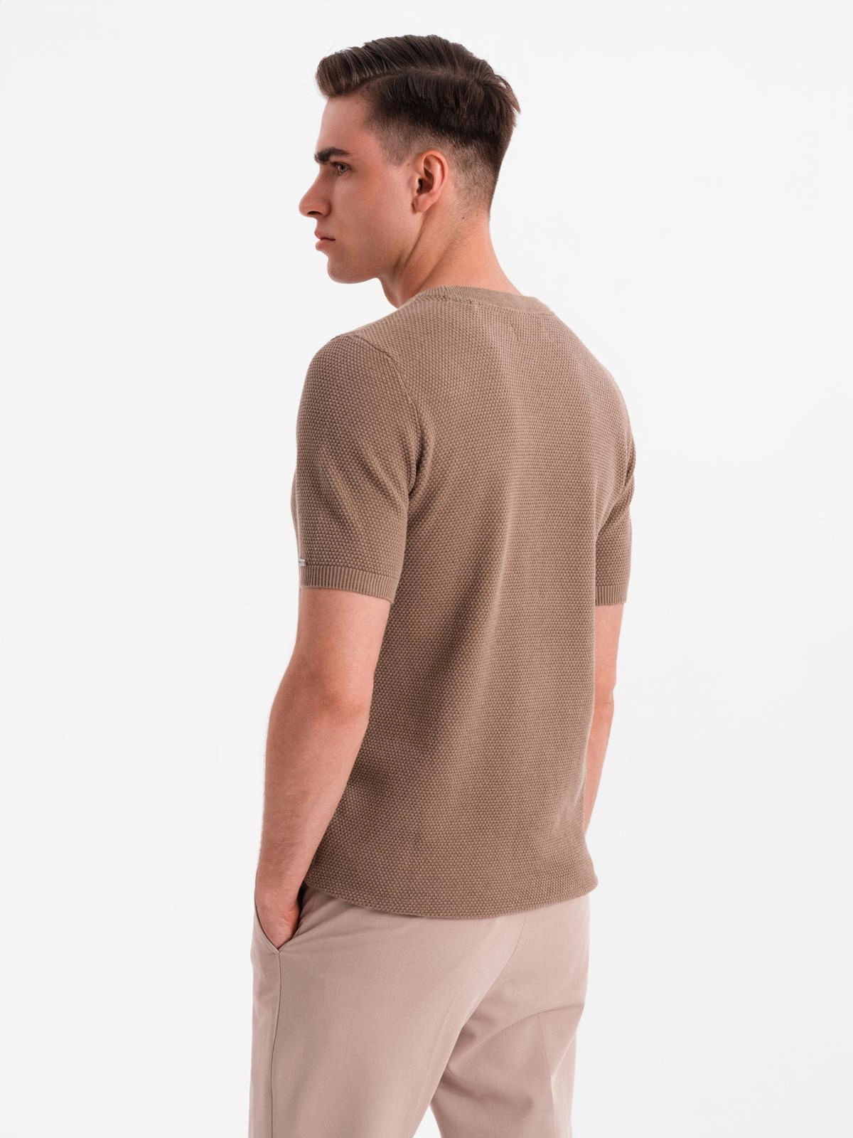 Koszulka męska dzianinowa z delikatną drobną strukturą - jasnobrązowa V2 OM-TSCT-0244