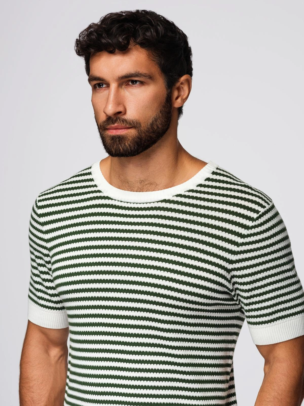 - Męski dzianinowy t-shirt w marynarskie paski z ażurowym splotem – oliwkowo-biały V3 OM-TSCT-0255