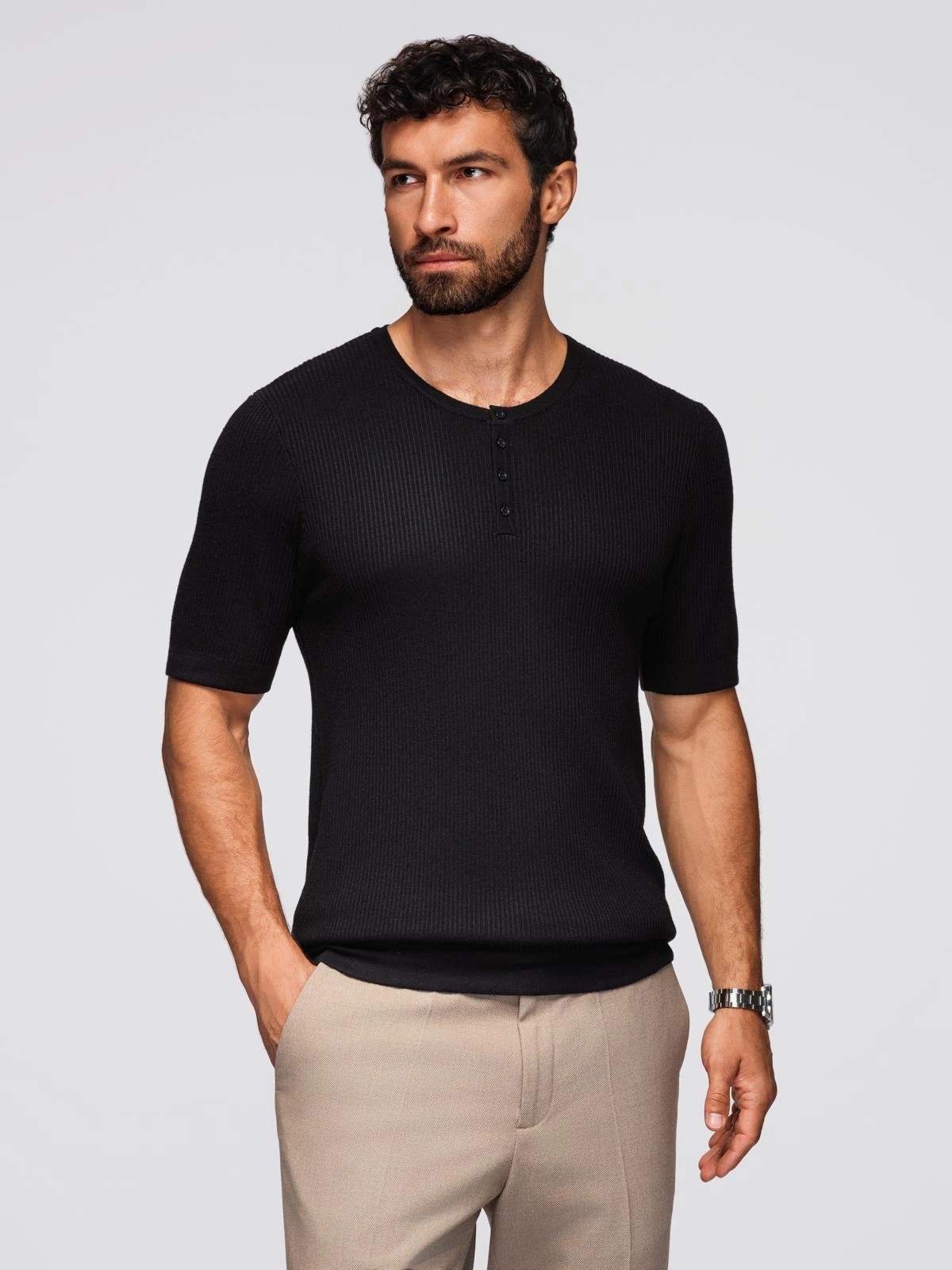 - T-shirt męski dzianinowy z guzikami przy dekolcie – czarny V2 OM-TSCT-0254