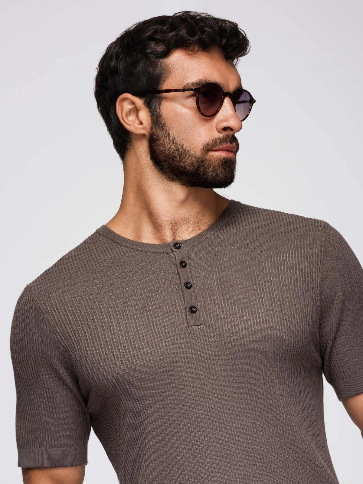 - T-shirt męski dzianinowy z guzikami przy dekolcie – popielaty V4 OM-TSCT-0254