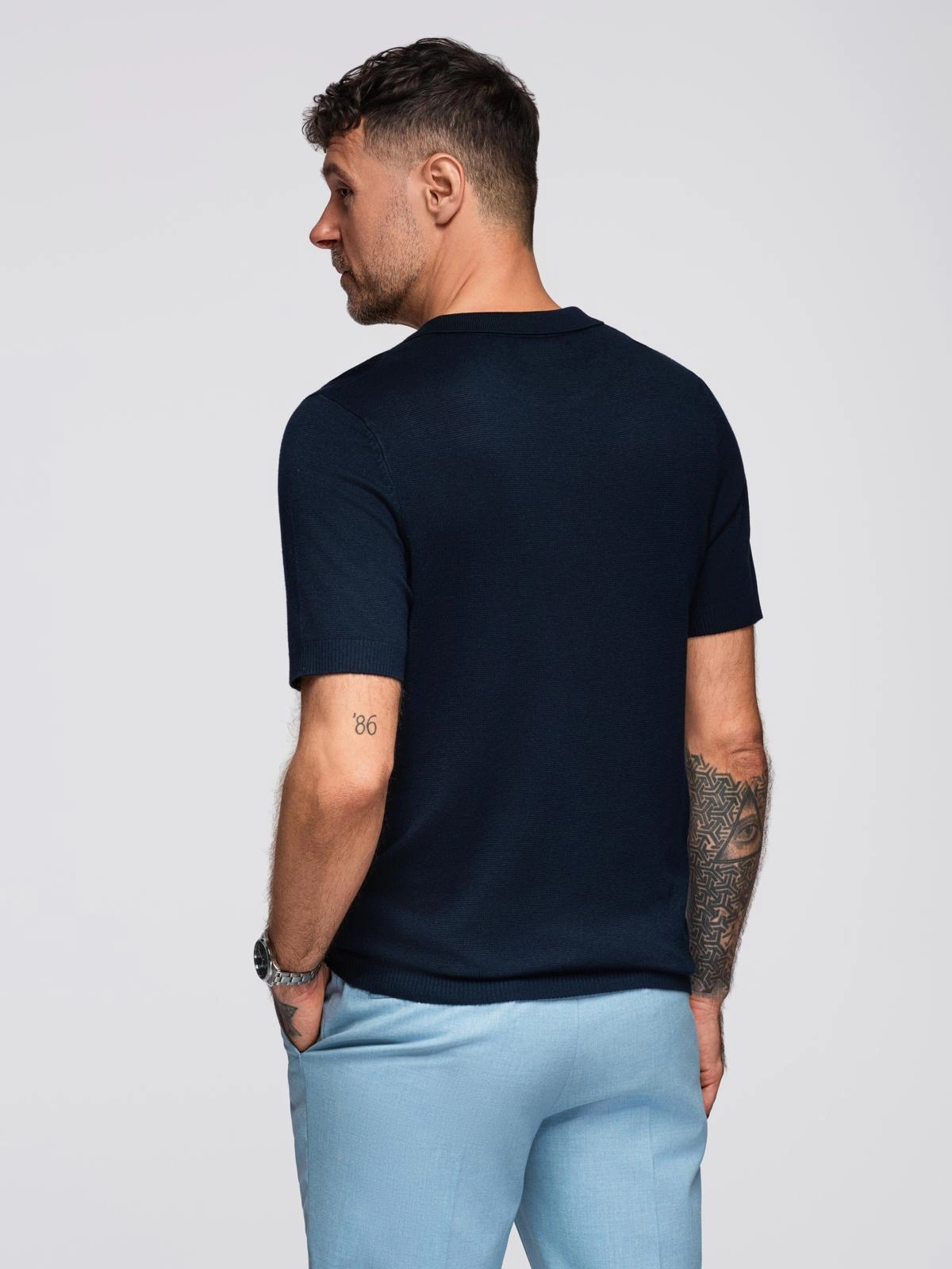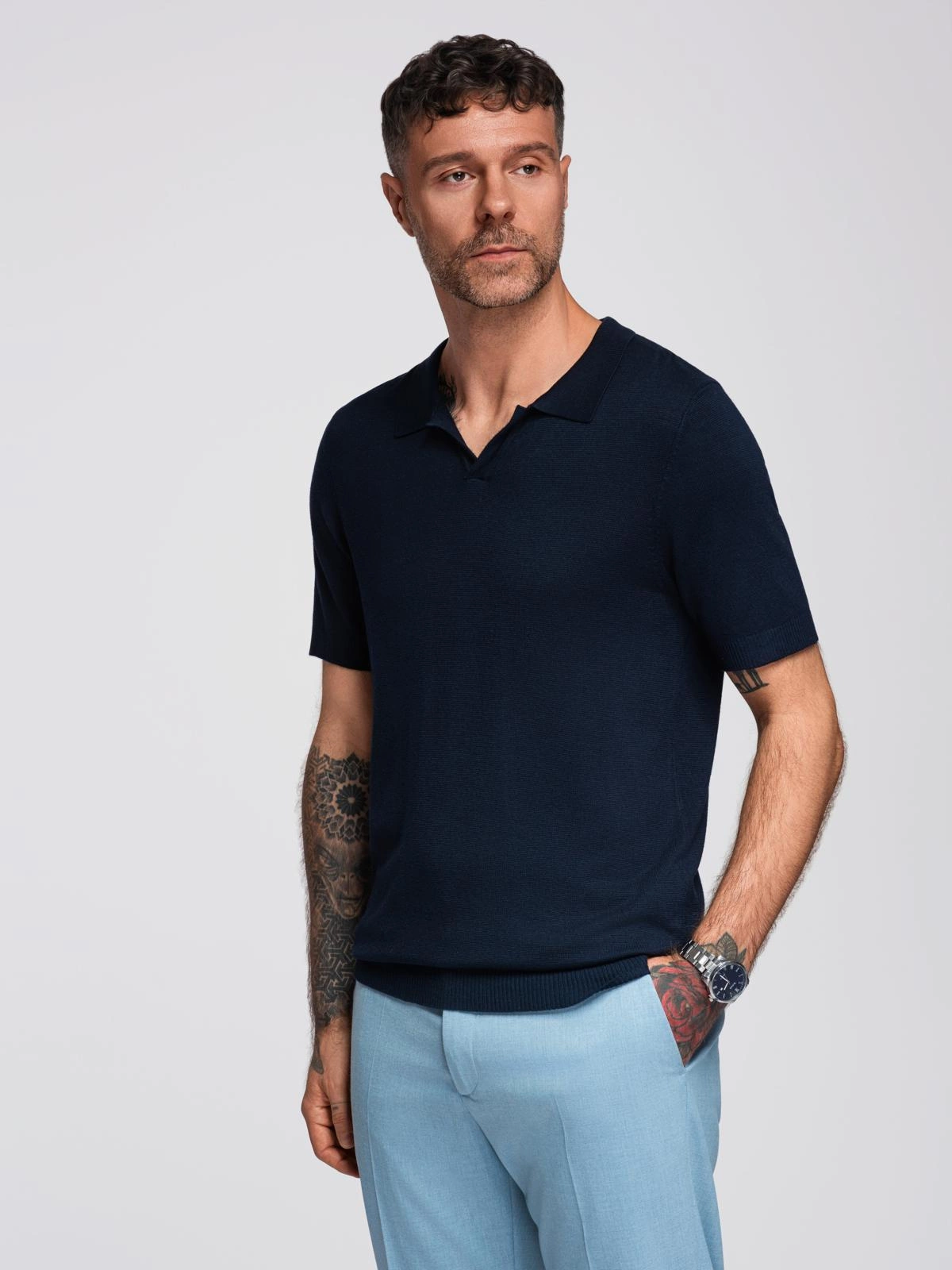 Koszulka męska polo bez guzików z klasycznym splotem – granatowa V1 OM-POSS-0159
