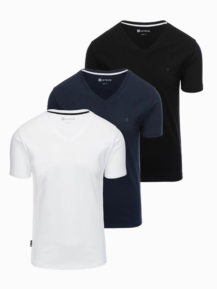 Komplet koszulek z dekoltem V i elastanem oraz subtelnym logotypem 3-pak – mix biały/granatowy/czarny V1 Z100