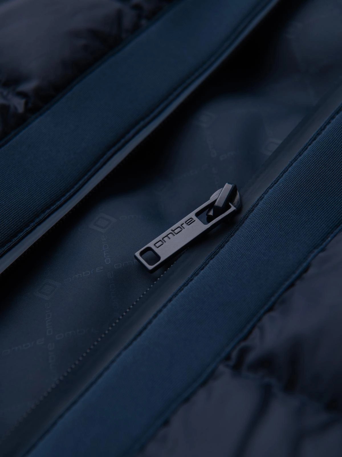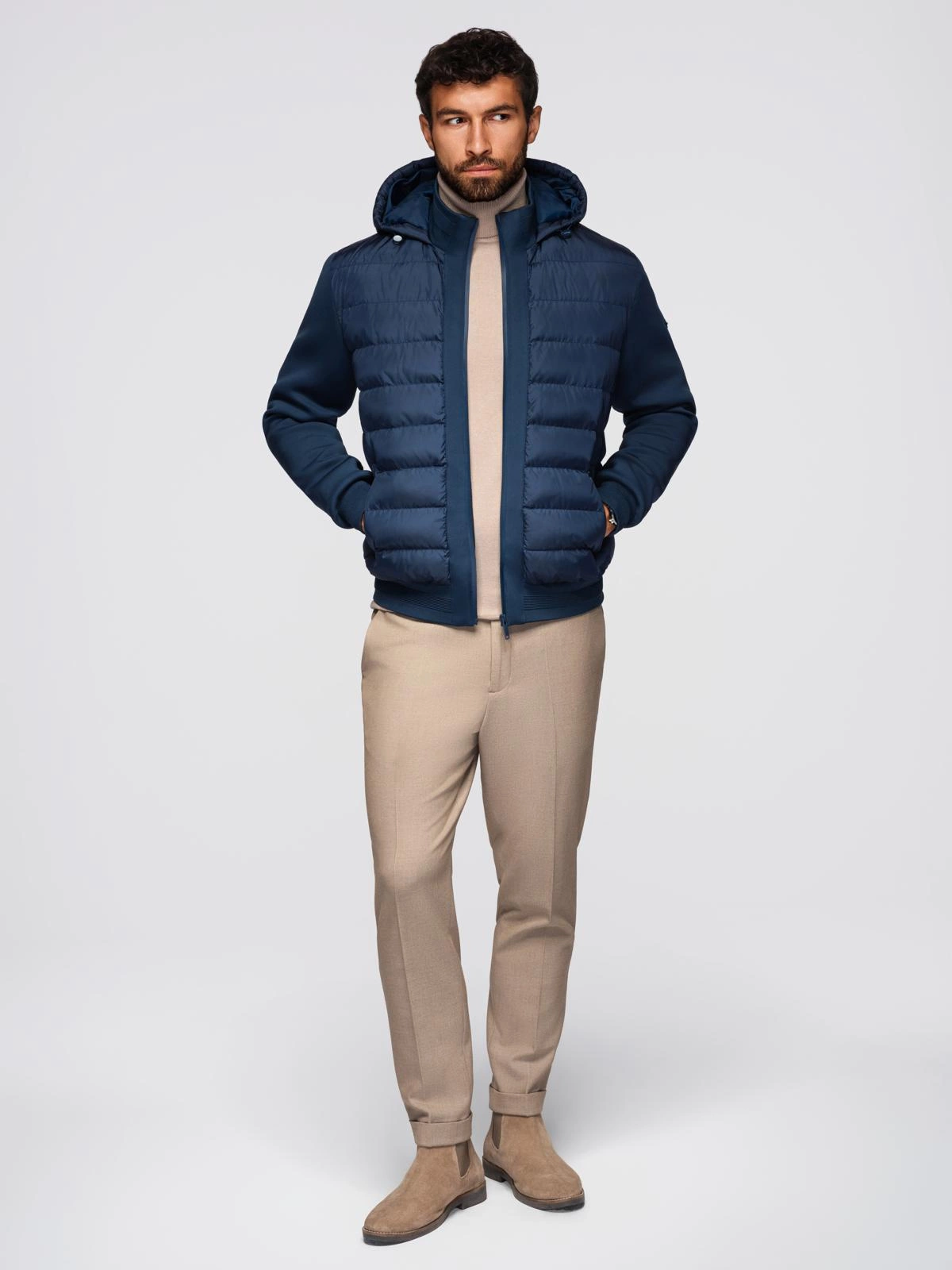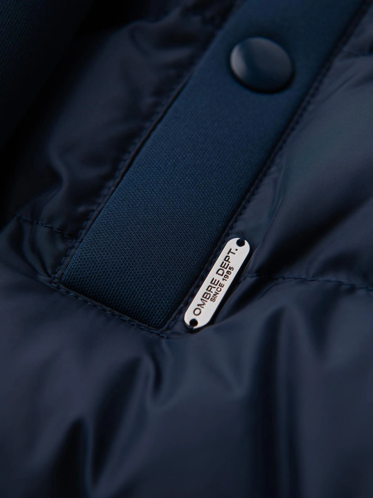 Pikowana kurtka bomberka z kapturem i dzianinowymi rękawami – granatowa V2 OM-JALP-0298