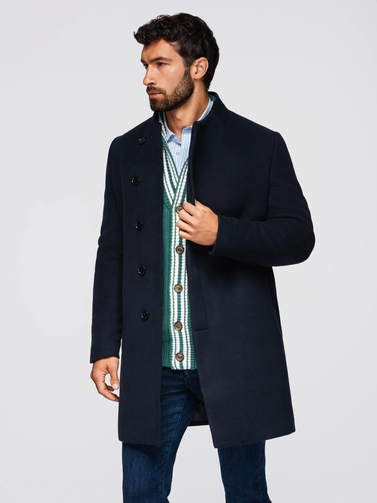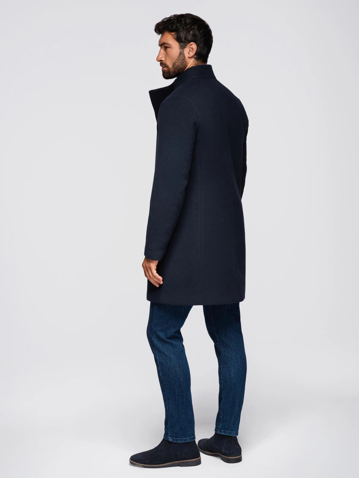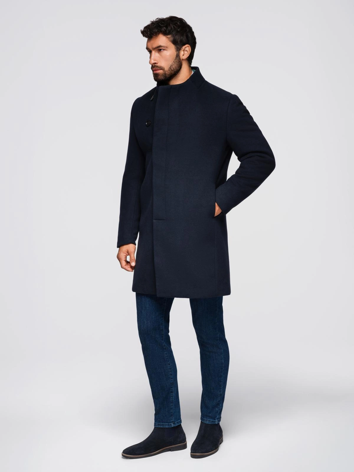 Płaszcz męski z asymetrycznym zapięciem i wysokim kołnierzem – granatowy V3 OM-COWC-0141