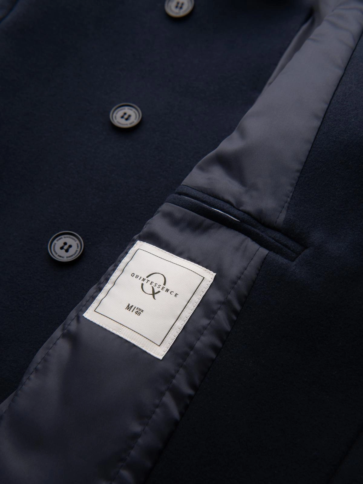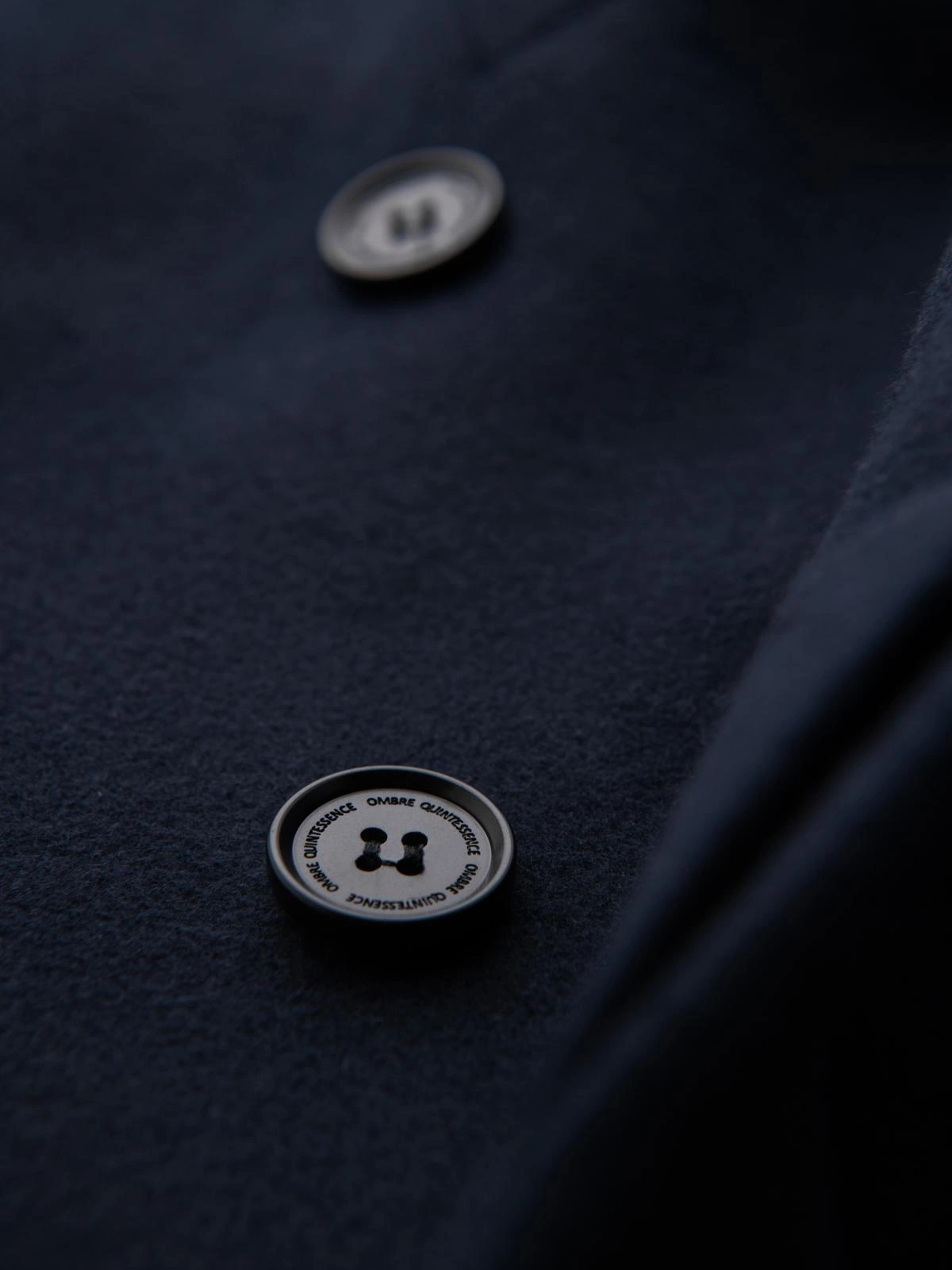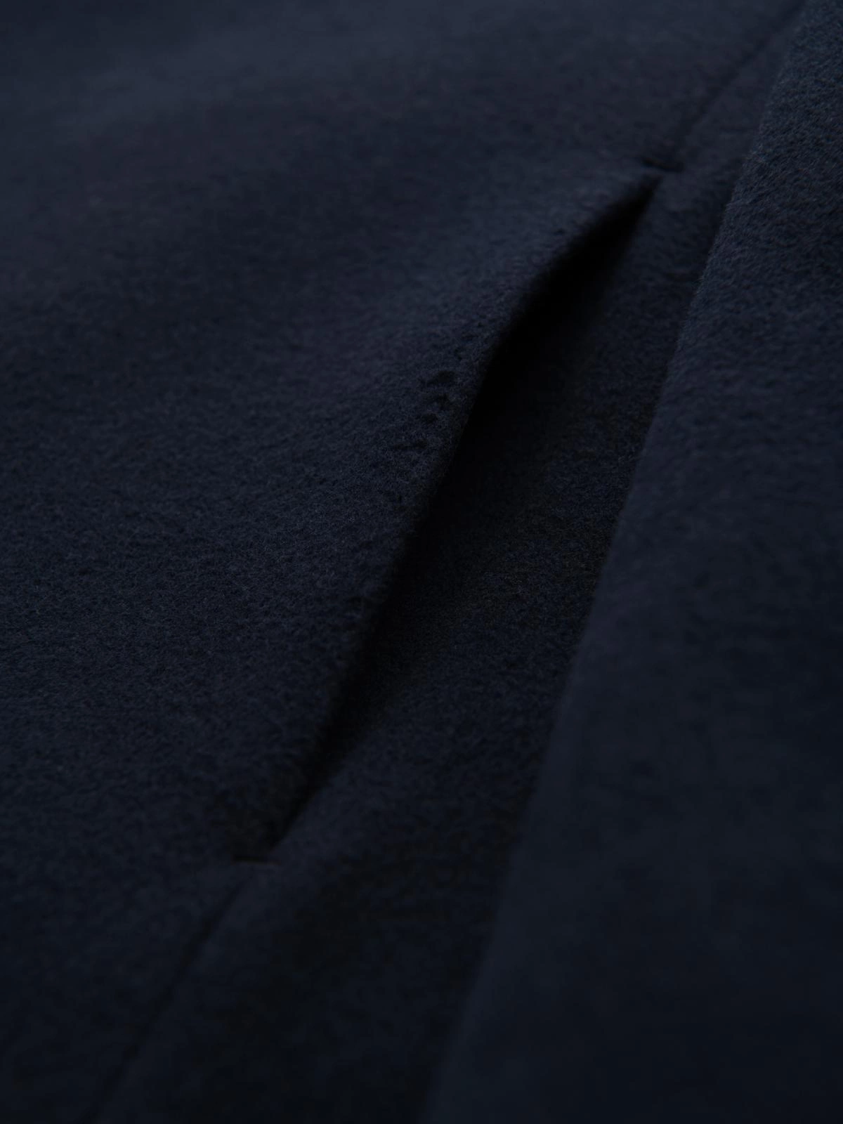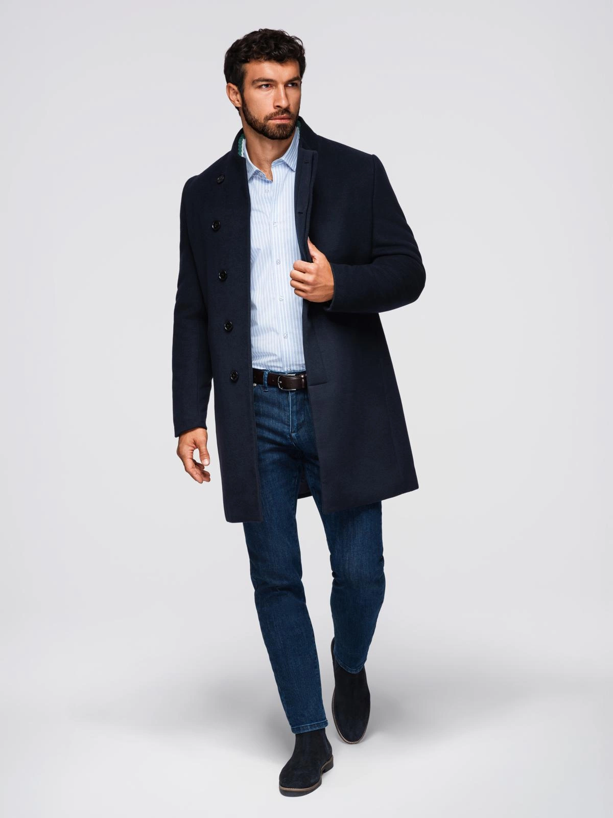 Płaszcz męski z asymetrycznym zapięciem i wysokim kołnierzem – granatowy V3 OM-COWC-0141