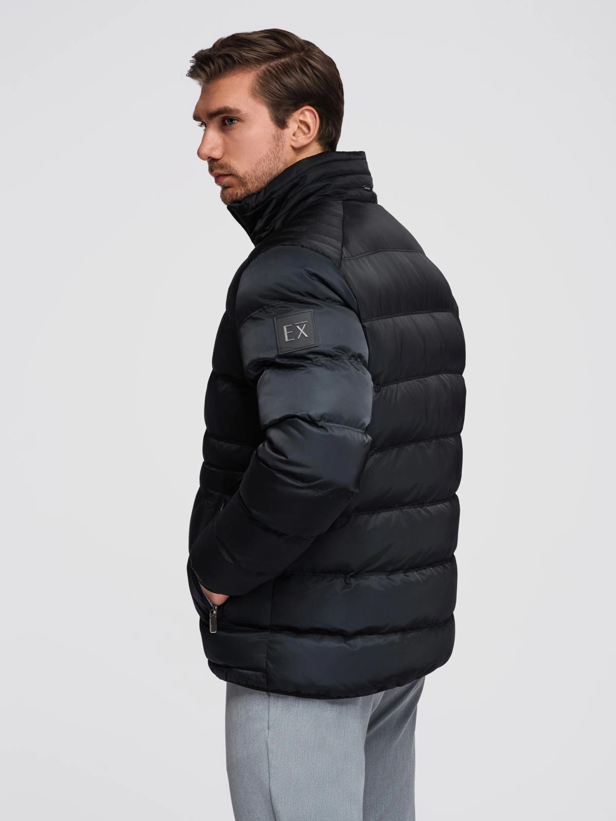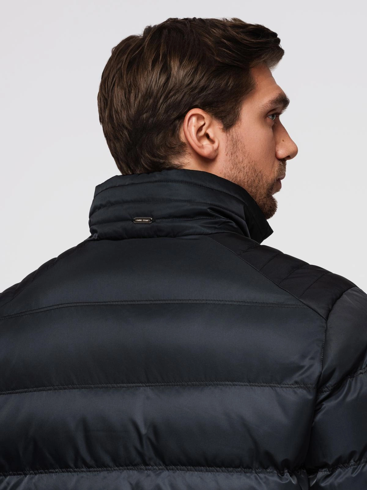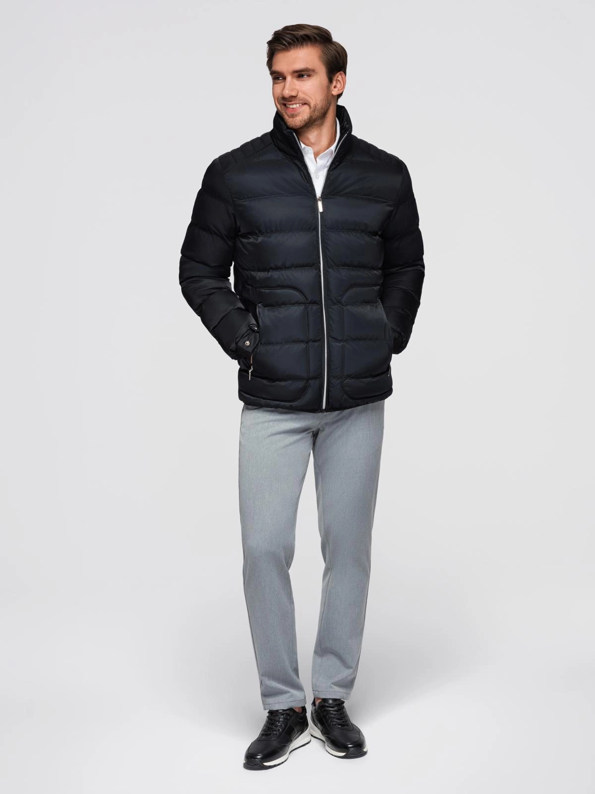 Pikowana męska kurtka z połyskiem i stójką – czarna V1 OM-JALP-0218