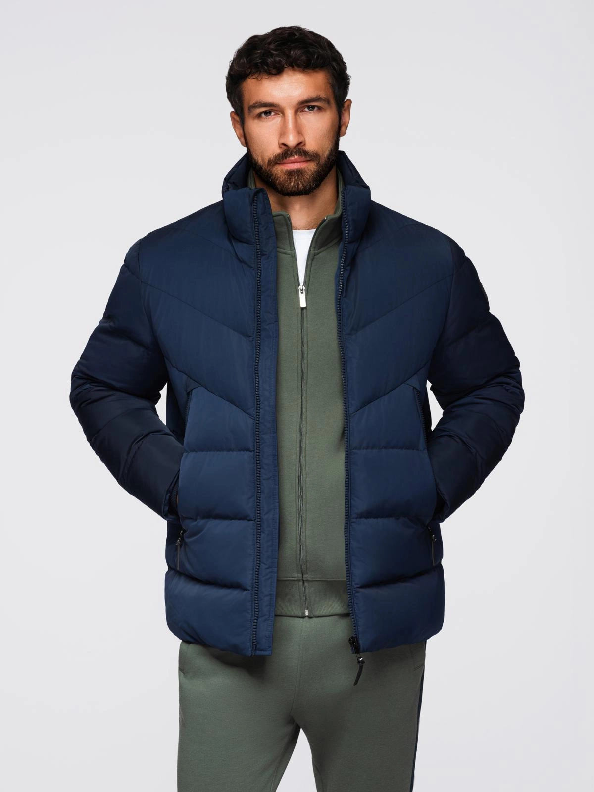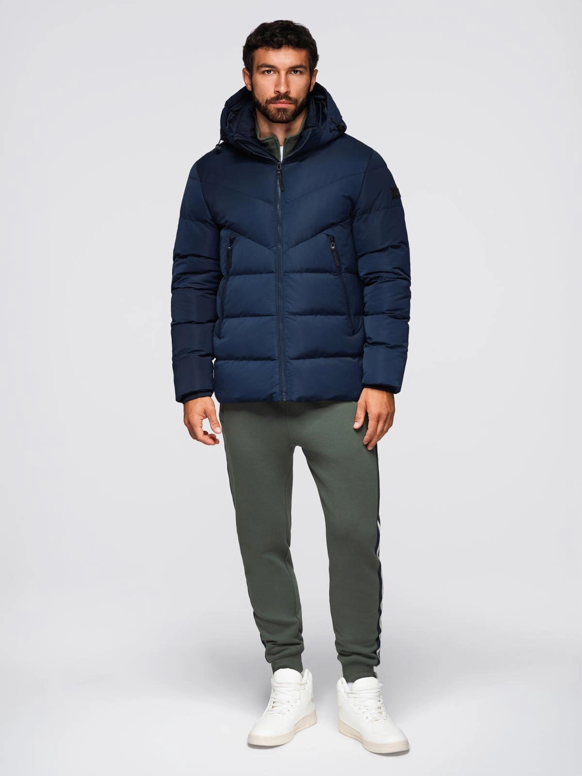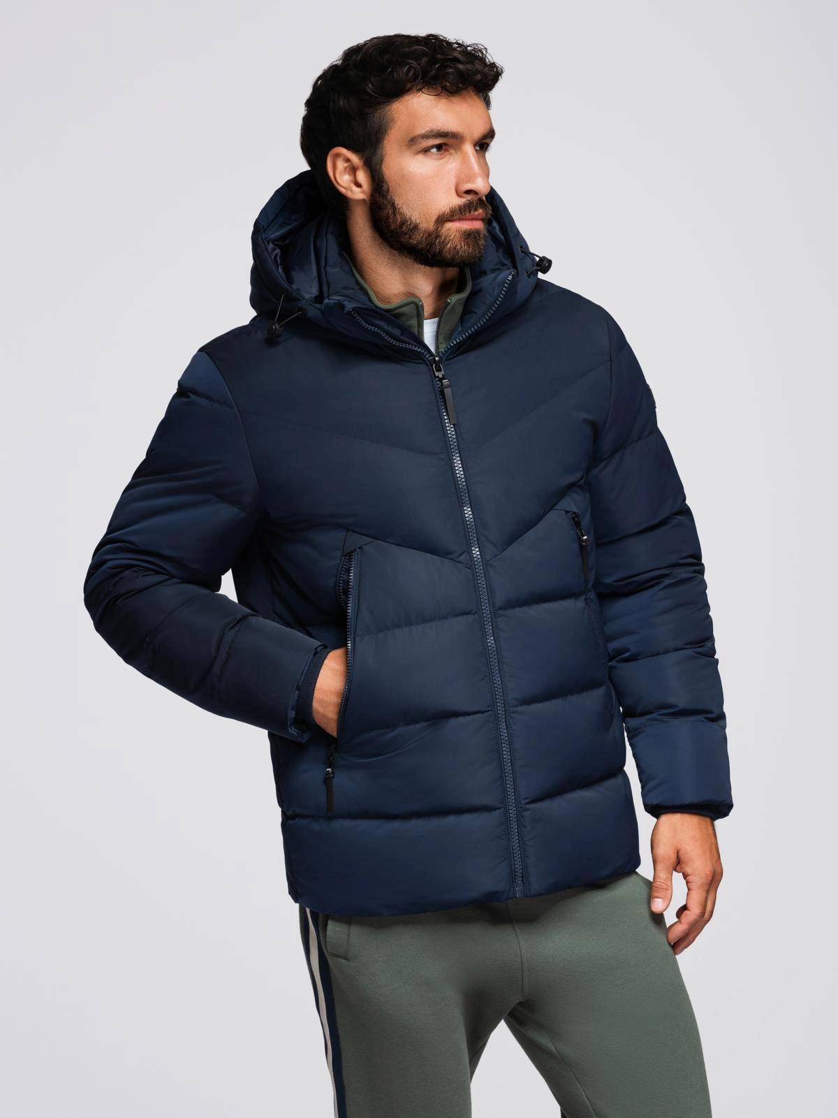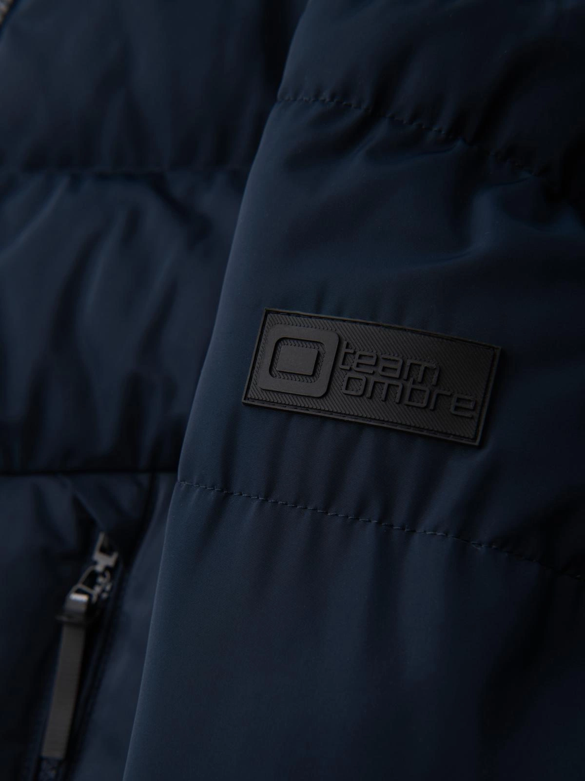 Męska kurtka z asymetrycznym pikowaniem i kapturem - granatowa V4 OM-JAHP-0304