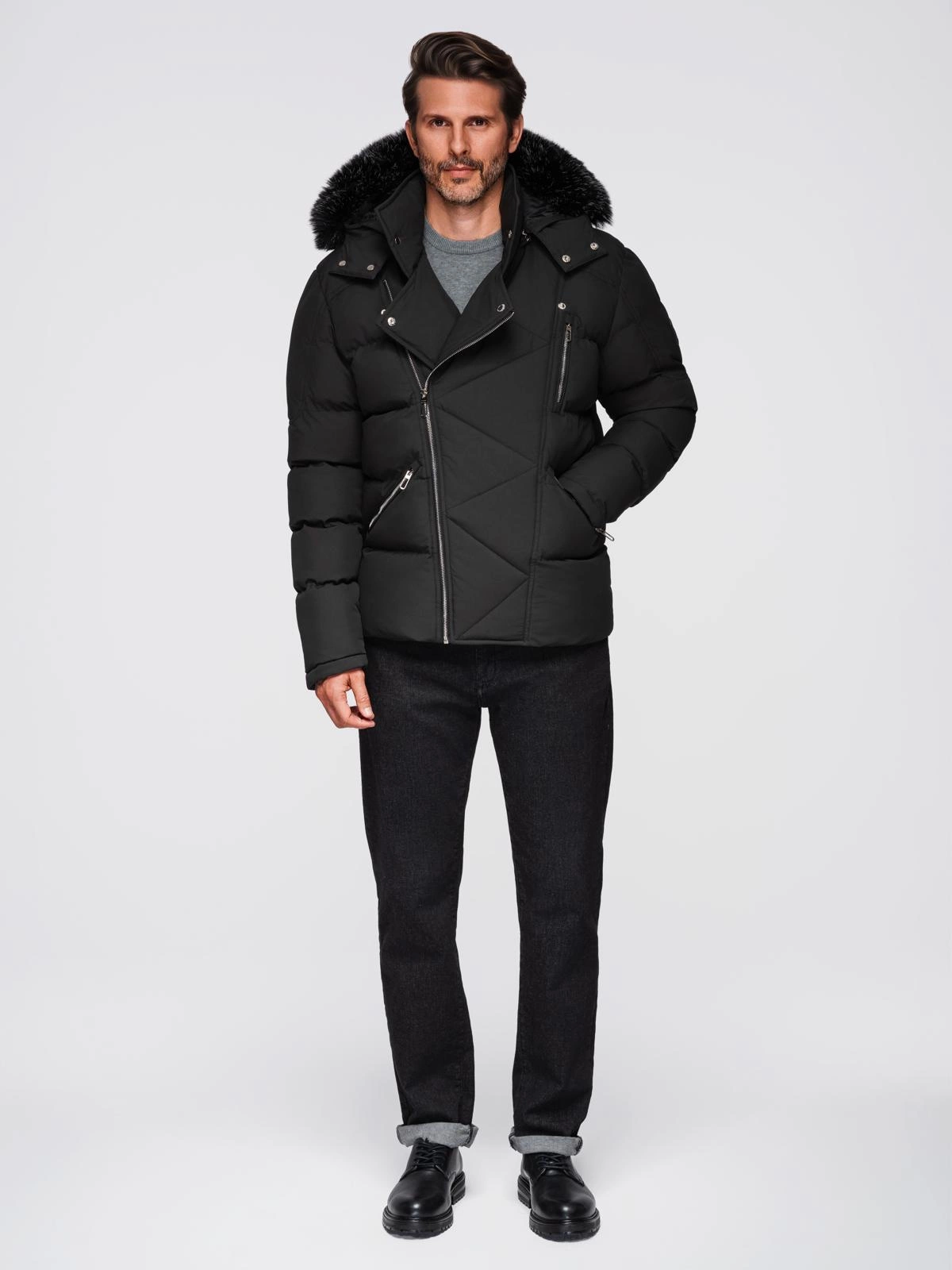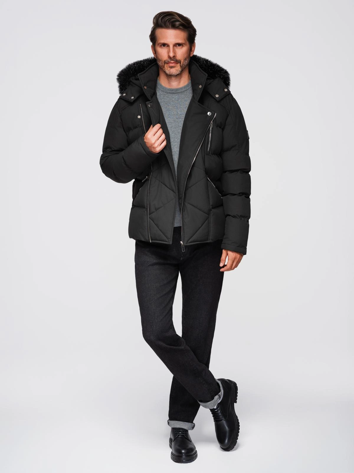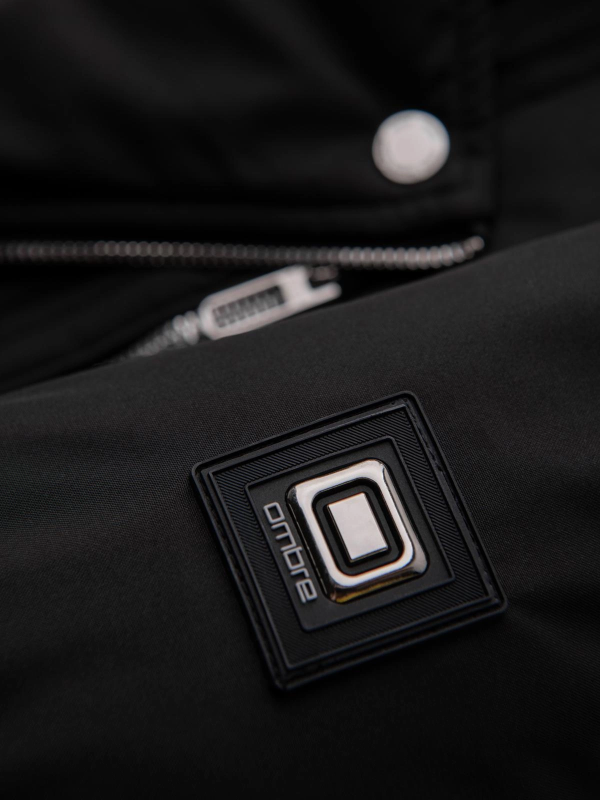Kurtka pikowana męska o kroju ramoneski z kapturem - czarna V1 OM-JAHP-0252