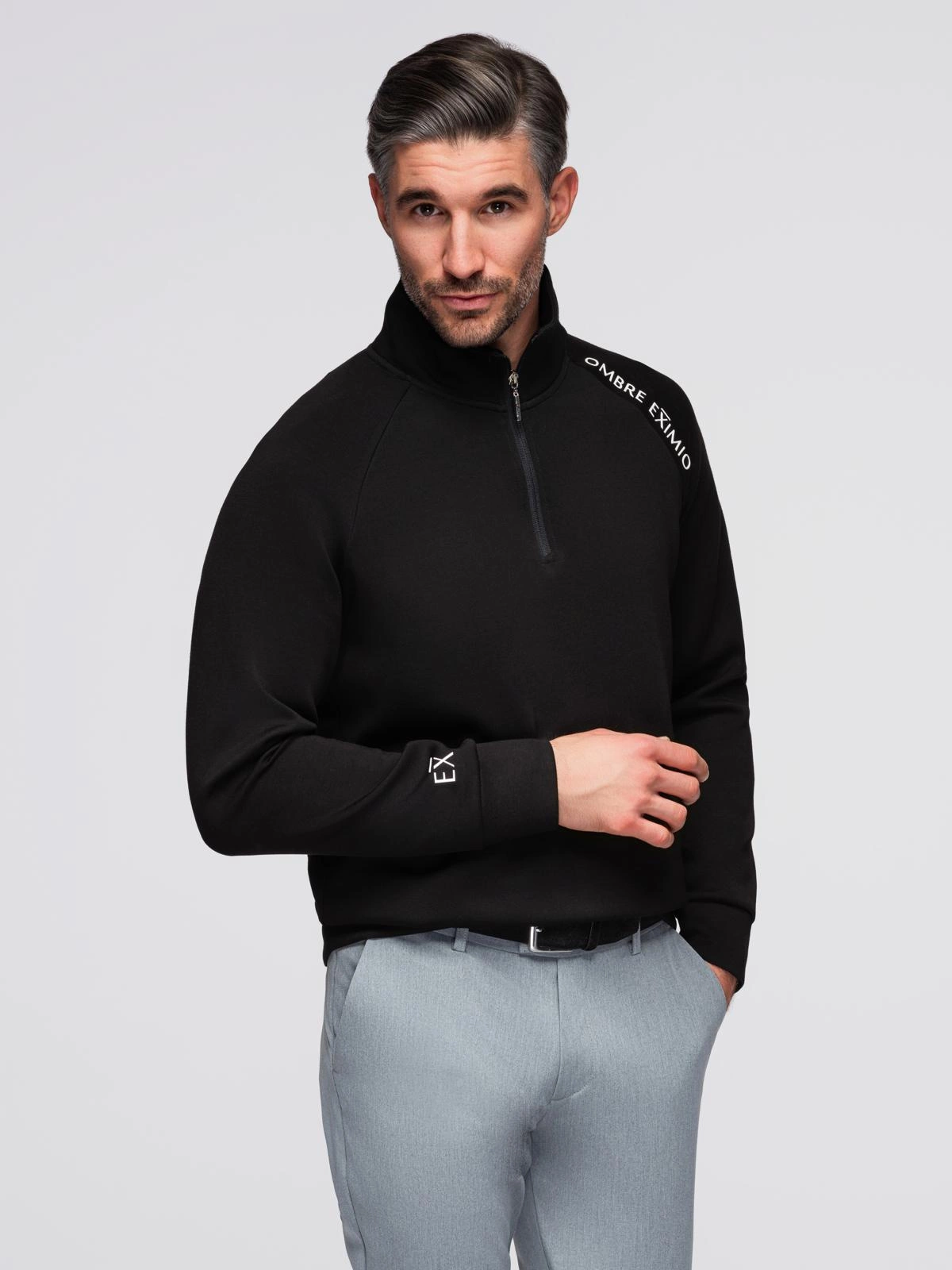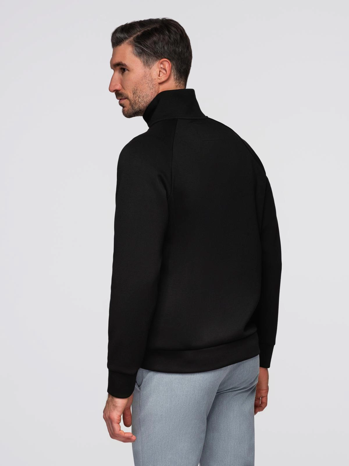 Bluza męska z rozpinaną wysoką stójką i kontrastowym nadrukiem – czarna V1 OM-SSZP-0211