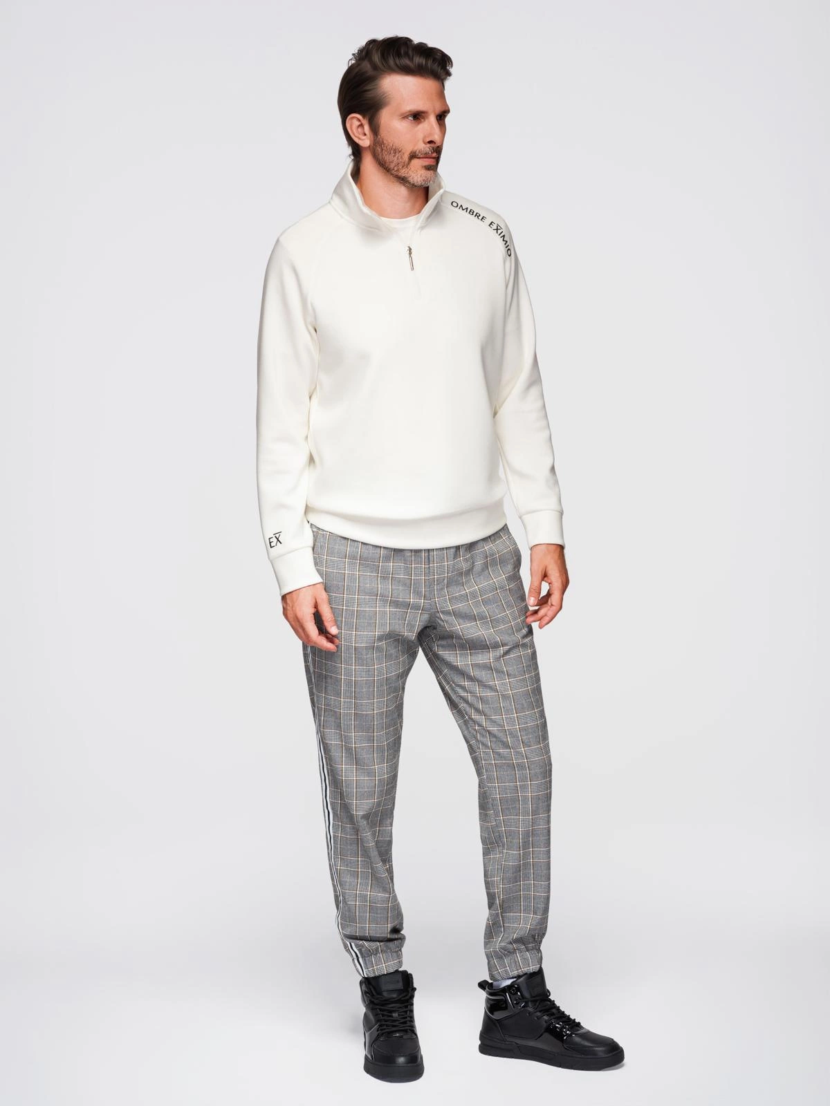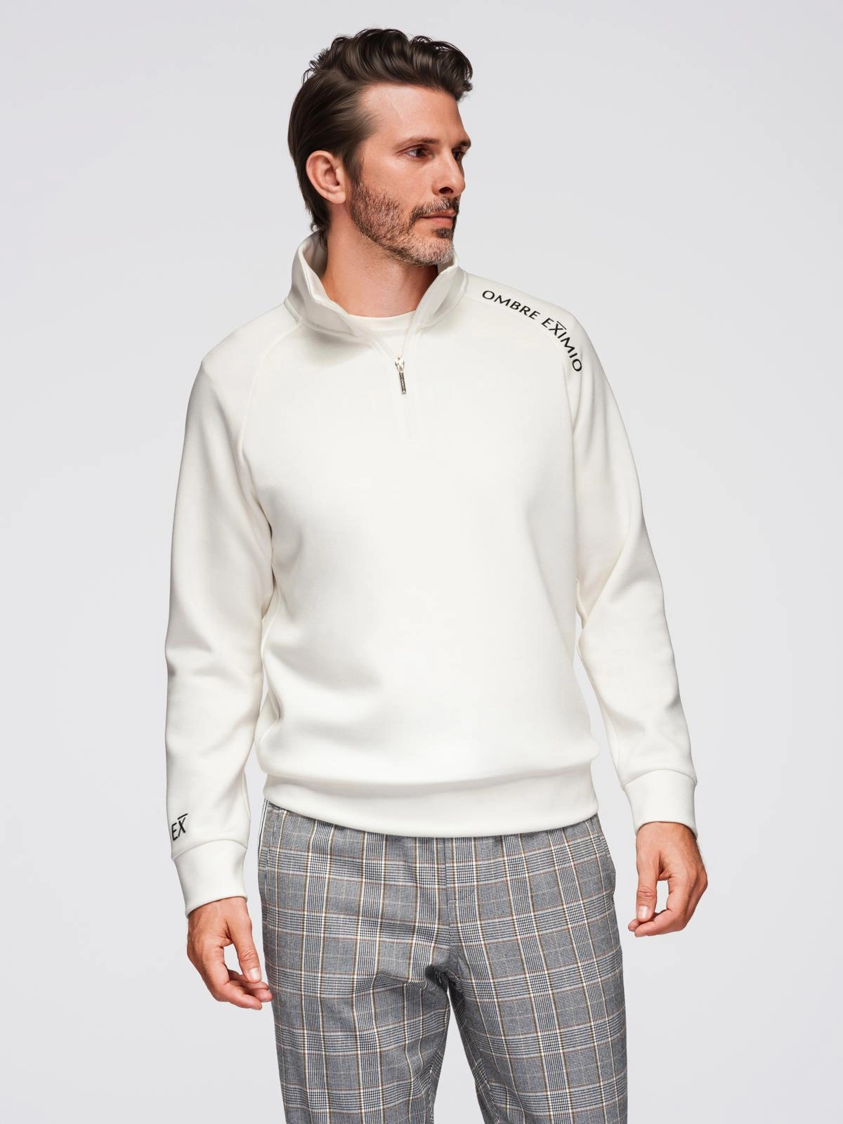 Męska bluza z rozpinaną wysoką stójką i kontrastowym nadrukiem – ecru V2 OM-SSZP-0211