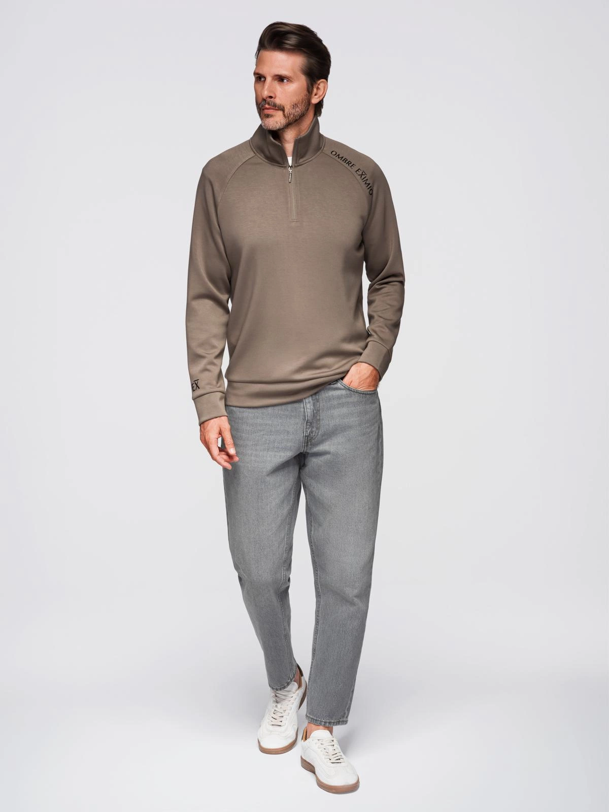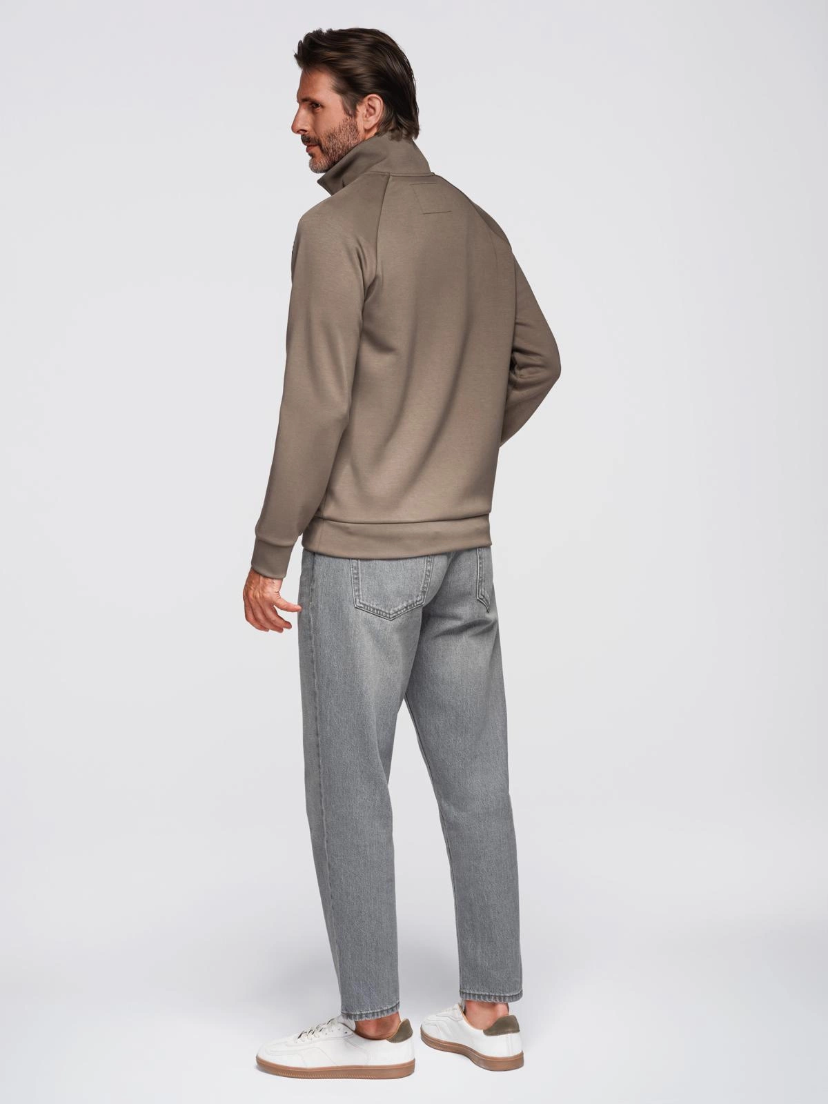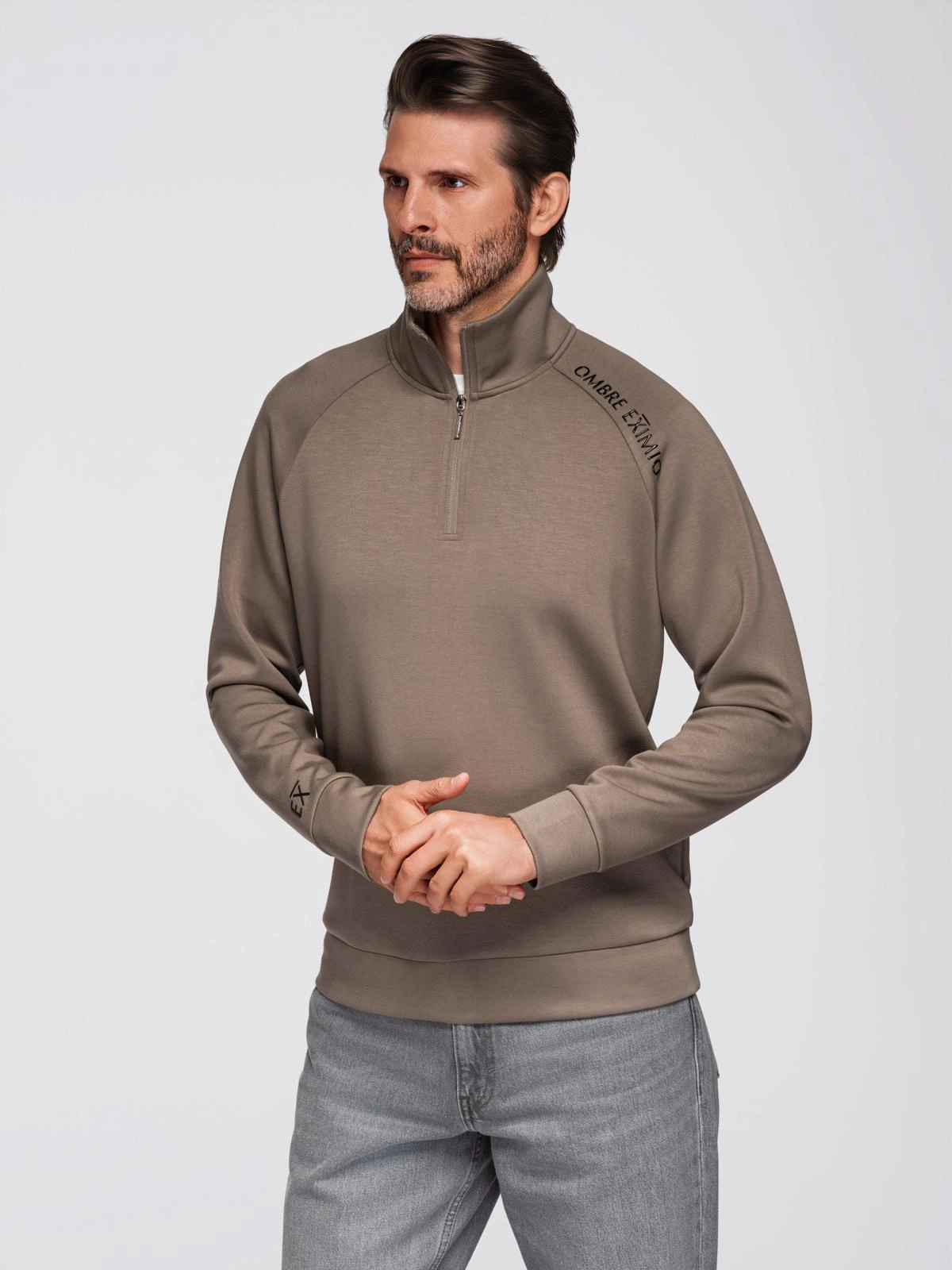 Bluza męska z kontrastowym nadrukiem i rozpinaną wysoką stójką – szarobrązowa V3 OM-SSZP-0211