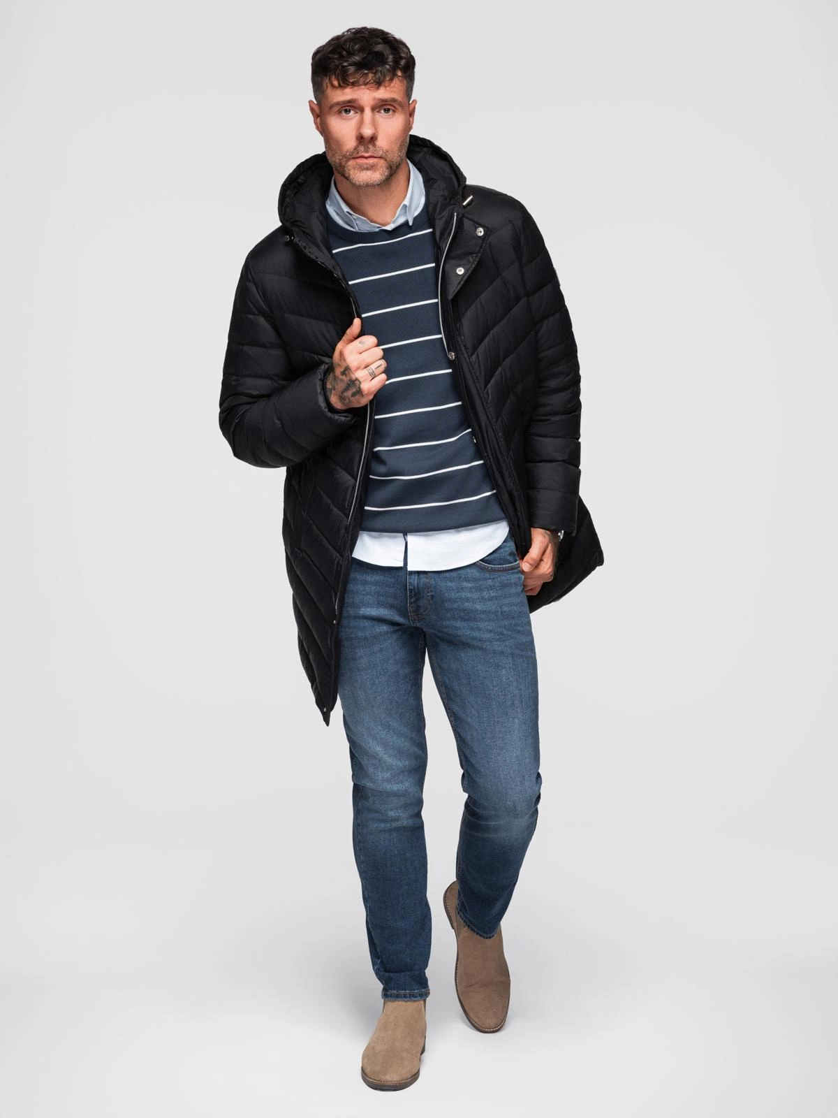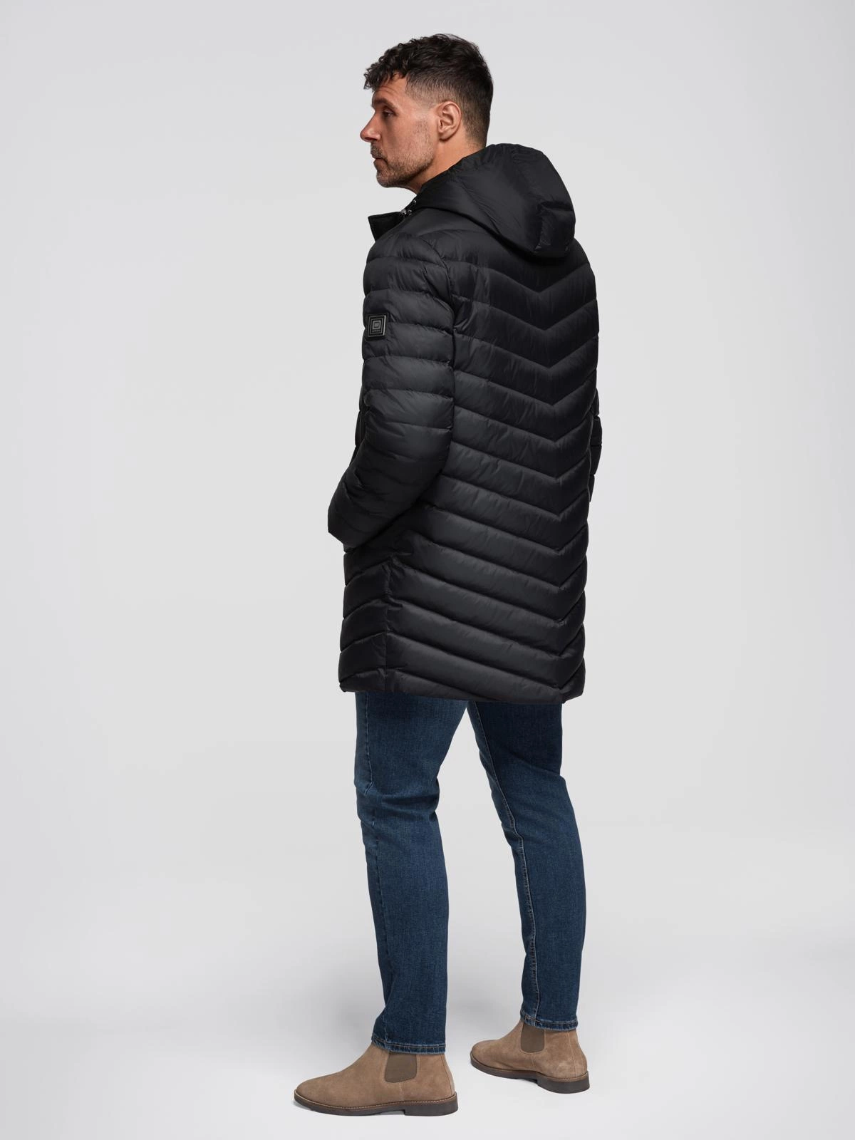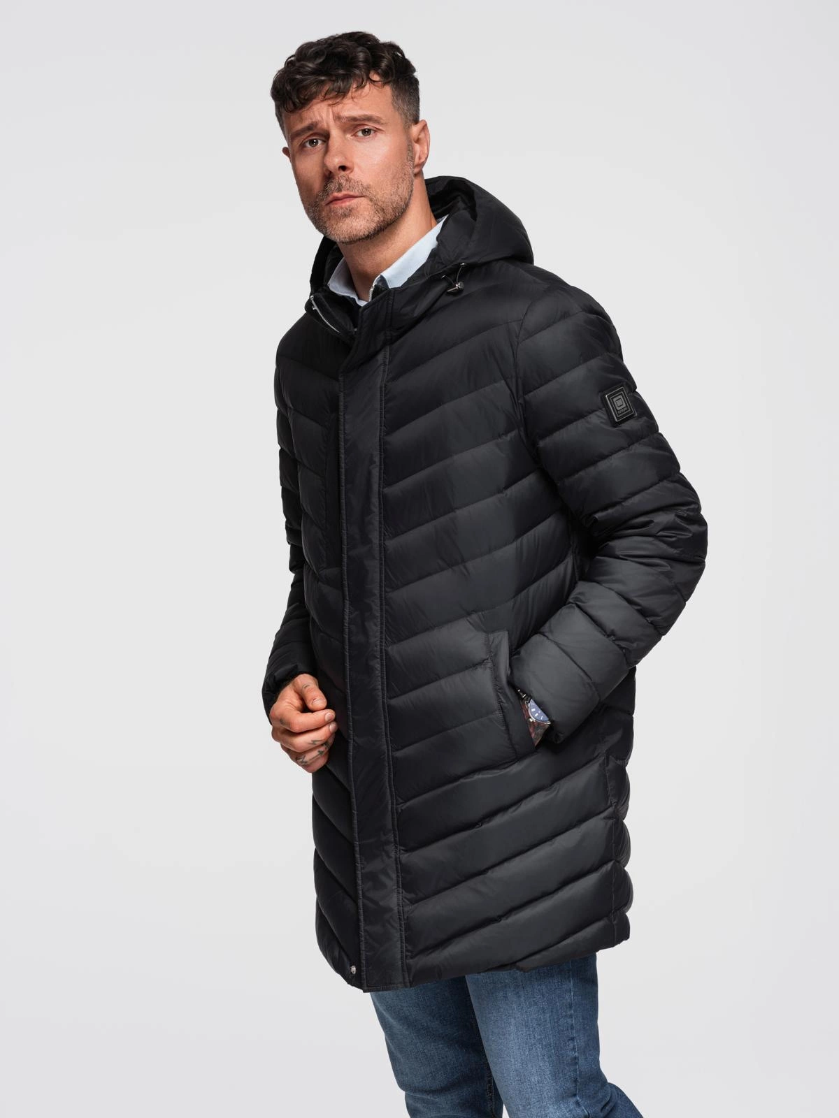Długa pikowana kurtka męska z naturalnym wypełnieniem - czarna V1 OM-JALJ-0212